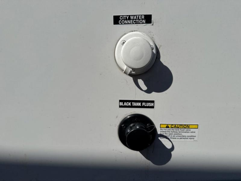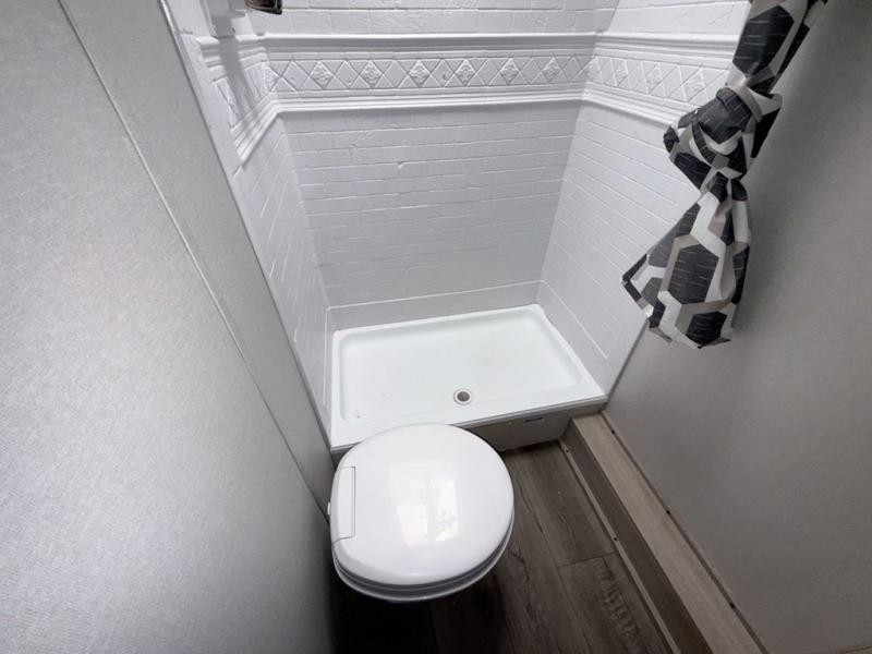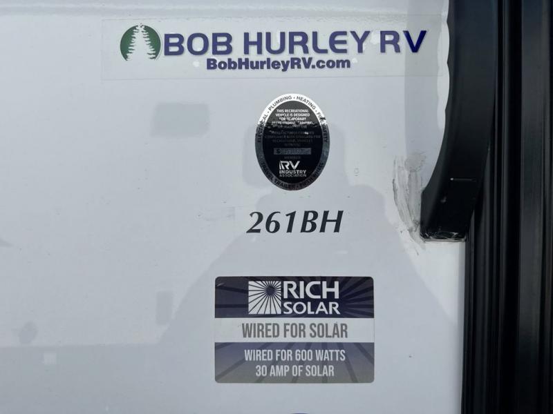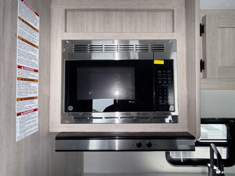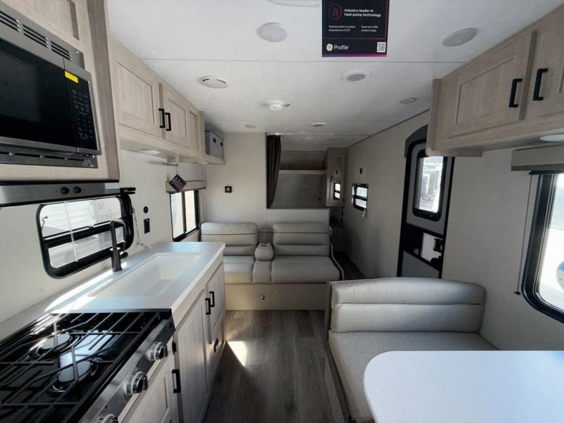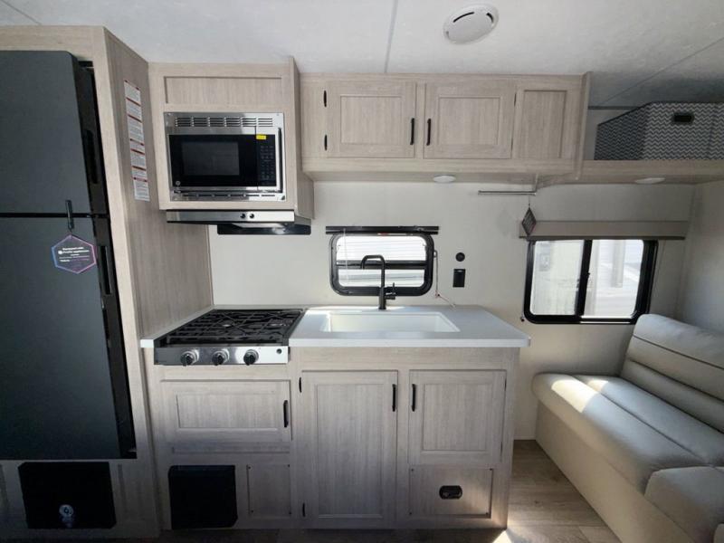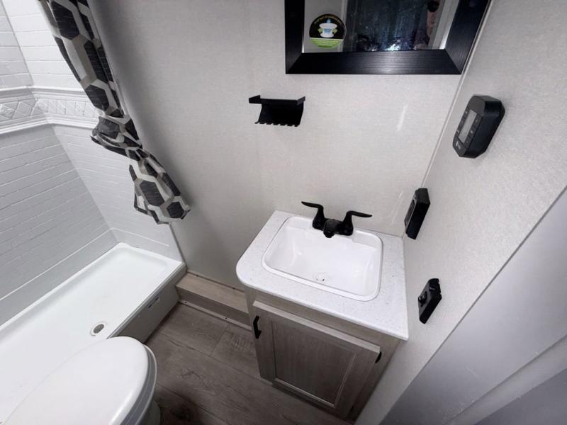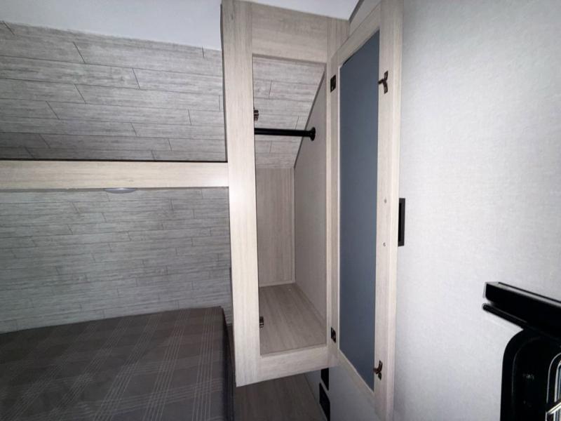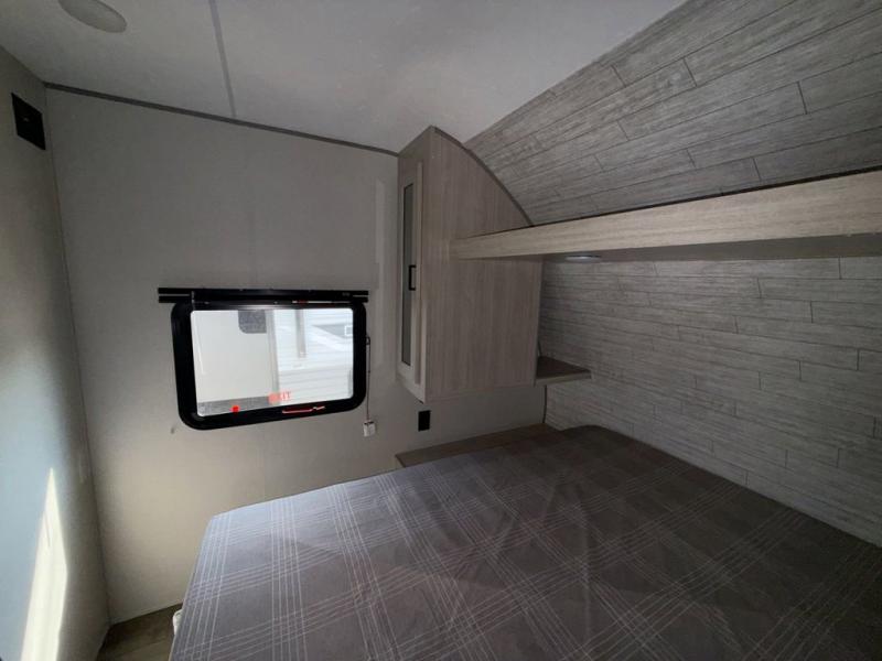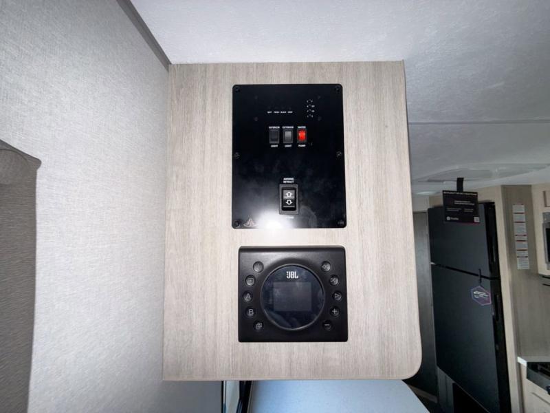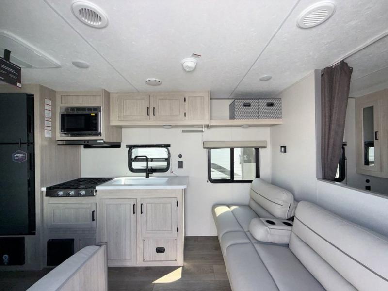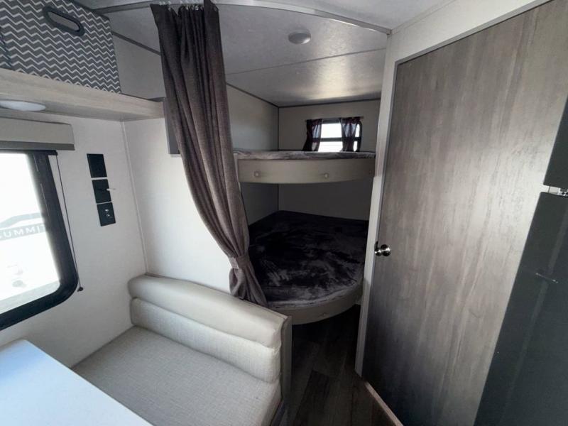 You get to choose to sit at the sofa or at the booth dinette when you are relaxing inside. There is a shelf with storage totes above the sofa for your belongings, and an additional overhead cabinet above the dinette for games. Maybe you want to rest on your own queen bed in the front semi-private bedroom before you make a meal in the kitchen or take a hike through the trails around the lake. The 15' electric awning with multi-color LED lights and a remote offers an outdoor living area where you can visit with other RVers. The kids will love their own double-size bunks that they can share with a friend or two, and the full bathroom is nearby as an added convenience.