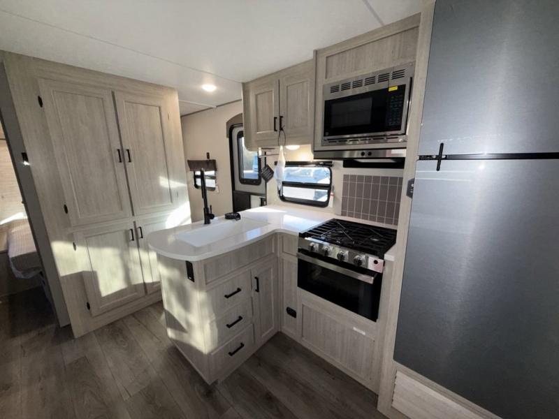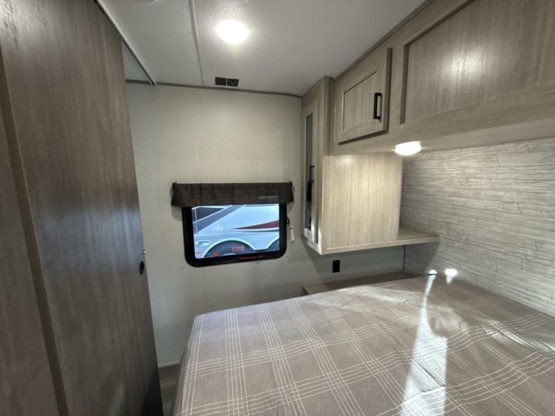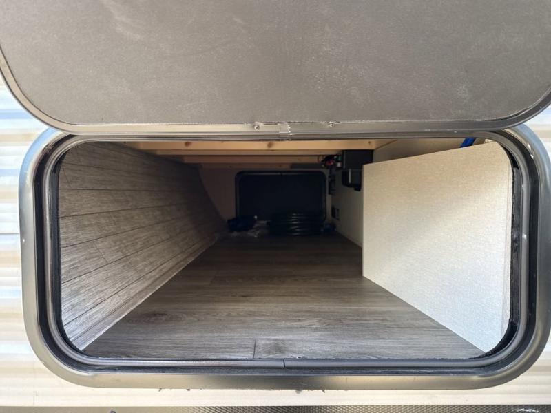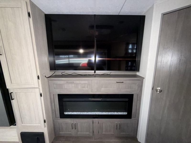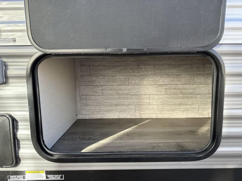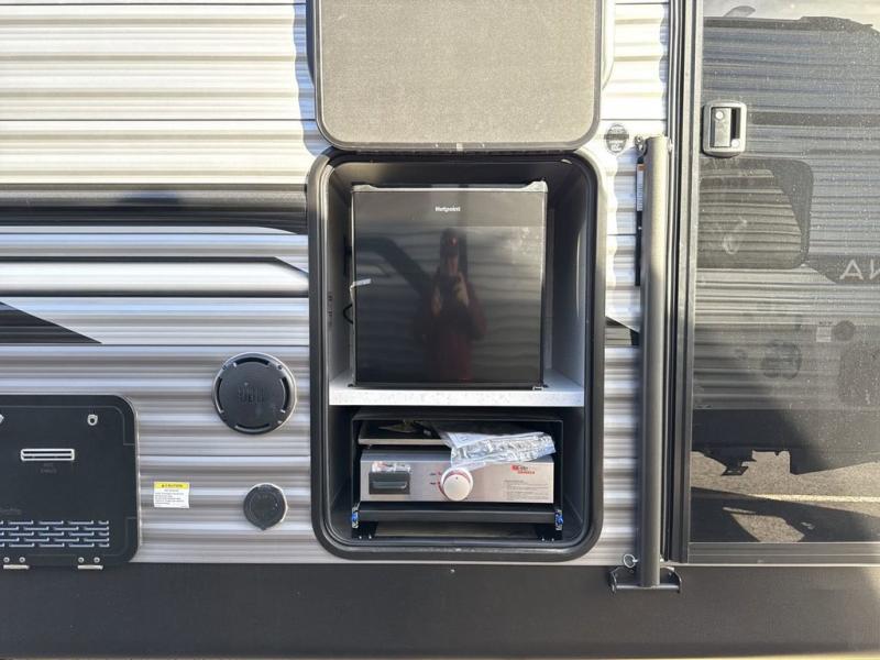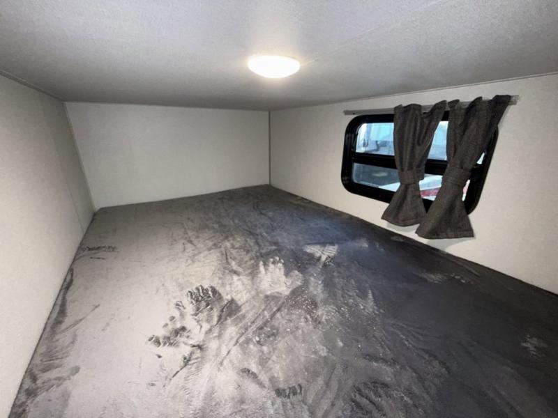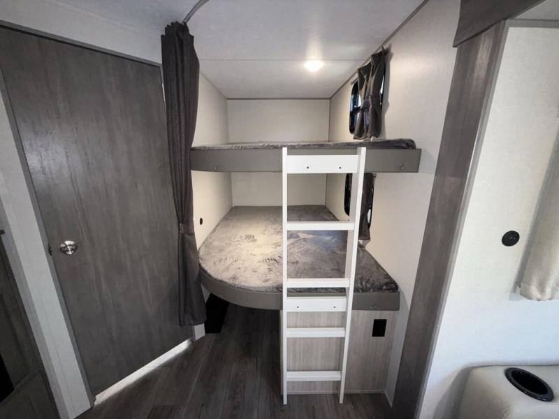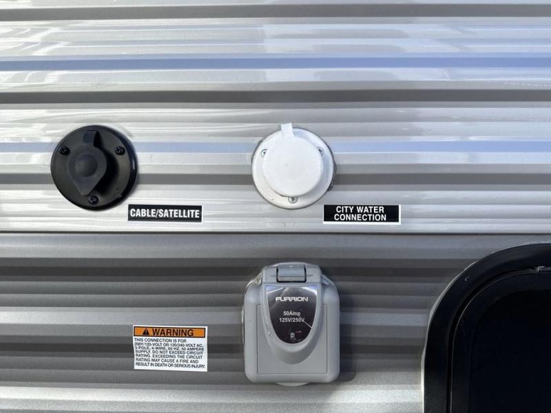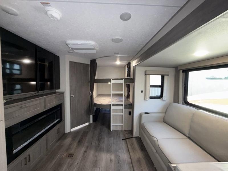 This travel trailer is perfect for your whole crew! Once you arrive at the campground, you can put out the 21' electric awning and start lunch on the exterior camper kitchen with a griddle and mini fridge. There is also a pass-thru storage plus additional exterior storage with a fold-down table and a TV hookup for added convenience. And since there are dual entry doors found on this unit, you can enter in through the full bath in the back, or the main living area towards the front! A large slide provides ample space to move about, and you'll find a trundle sofa and U-shaped dinette here for cozy seating and sleeping space. Speaking of sleeping, there is a front RV queen bed in the bedroom plus double-size bunks in the back for guests!