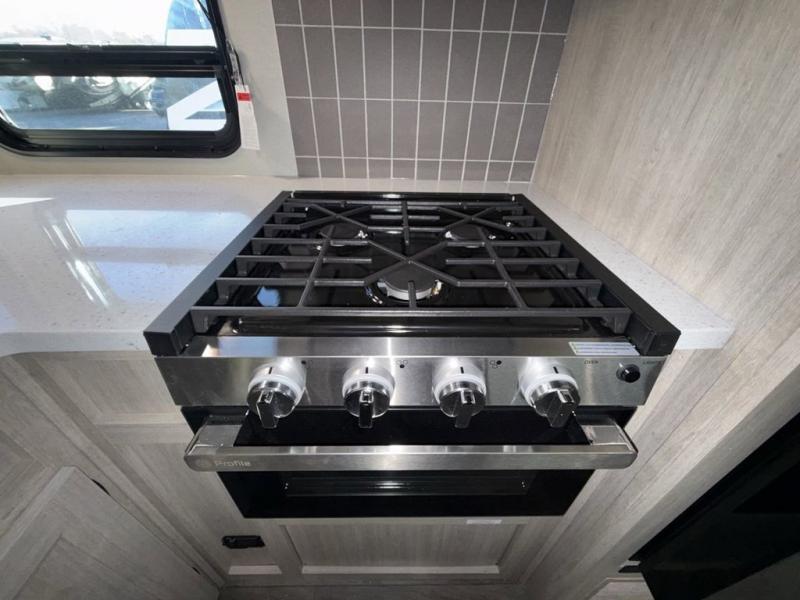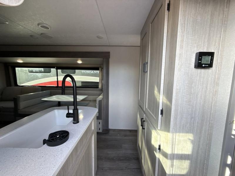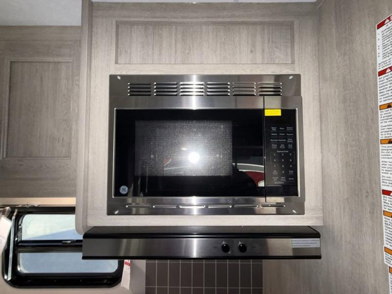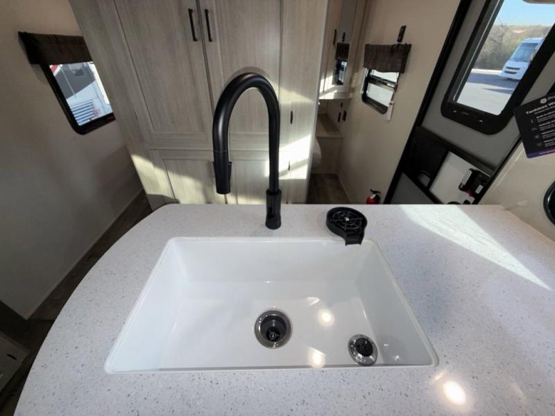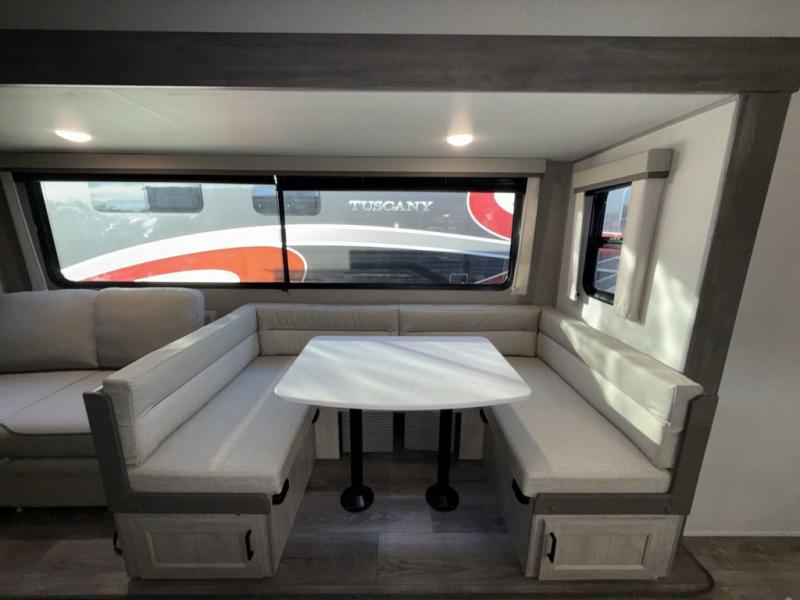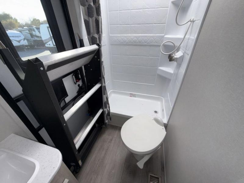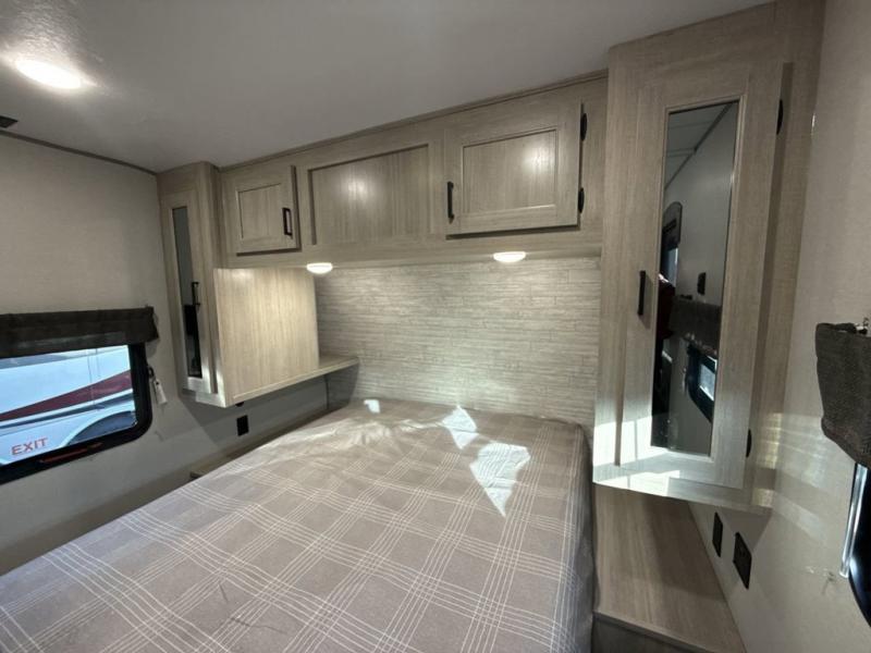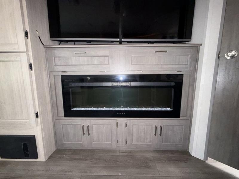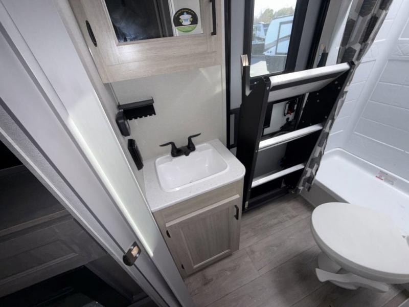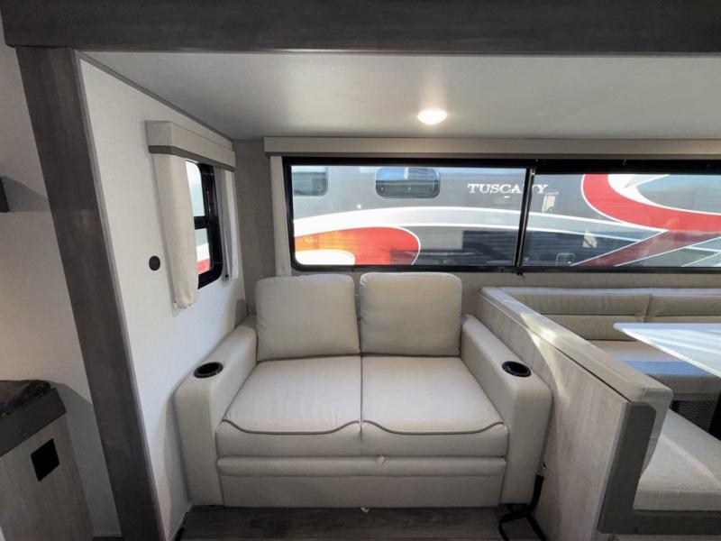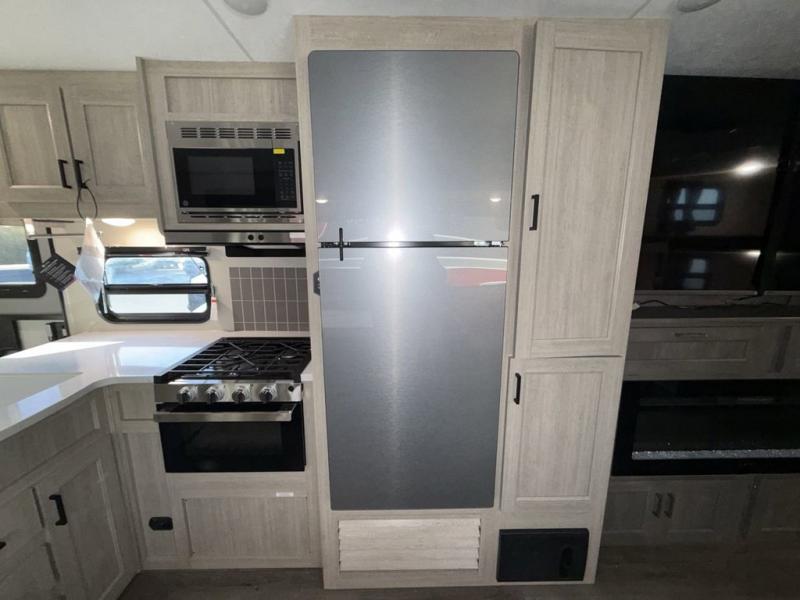 This travel trailer is perfect for your whole crew! Once you arrive at the campground, you can put out the 21' electric awning and start lunch on the exterior camper kitchen with a griddle and mini fridge. There is also a pass-thru storage plus additional exterior storage with a fold-down table and a TV hookup for added convenience. And since there are dual entry doors found on this unit, you can enter in through the full bath in the back, or the main living area towards the front! A large slide provides ample space to move about, and you'll find a trundle sofa and U-shaped dinette here for cozy seating and sleeping space. Speaking of sleeping, there is a front RV queen bed in the bedroom plus double-size bunks in the back for guests!