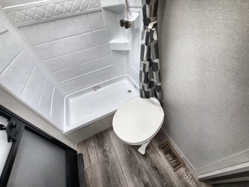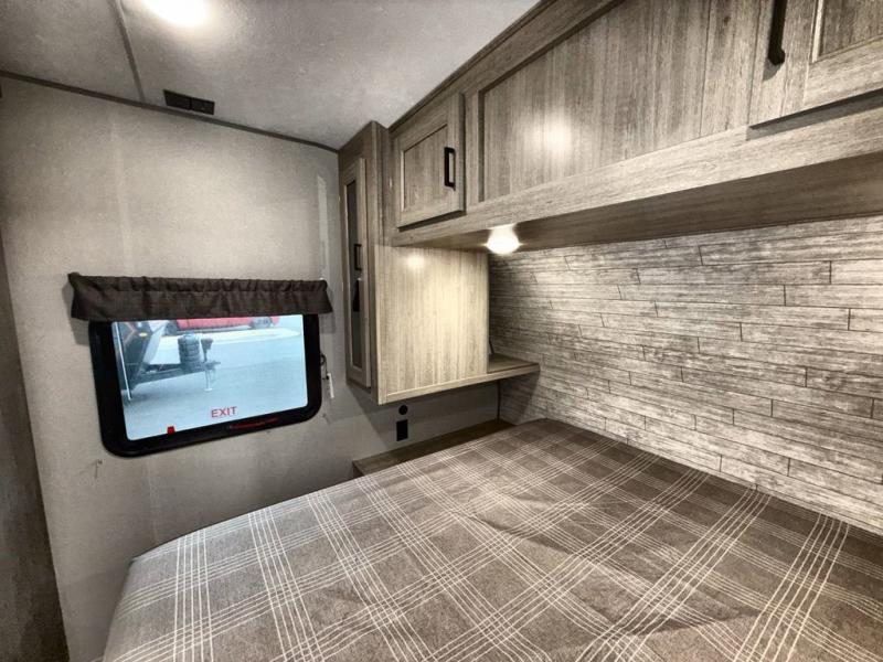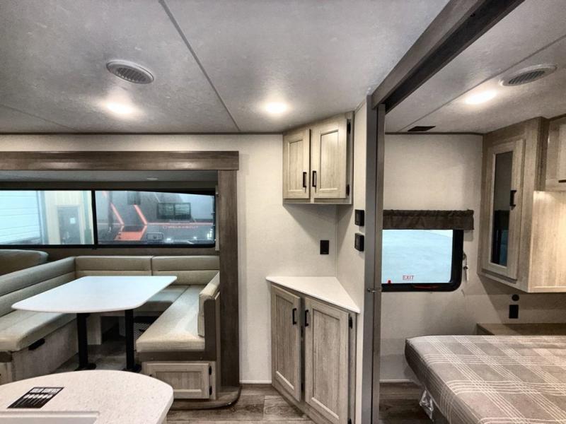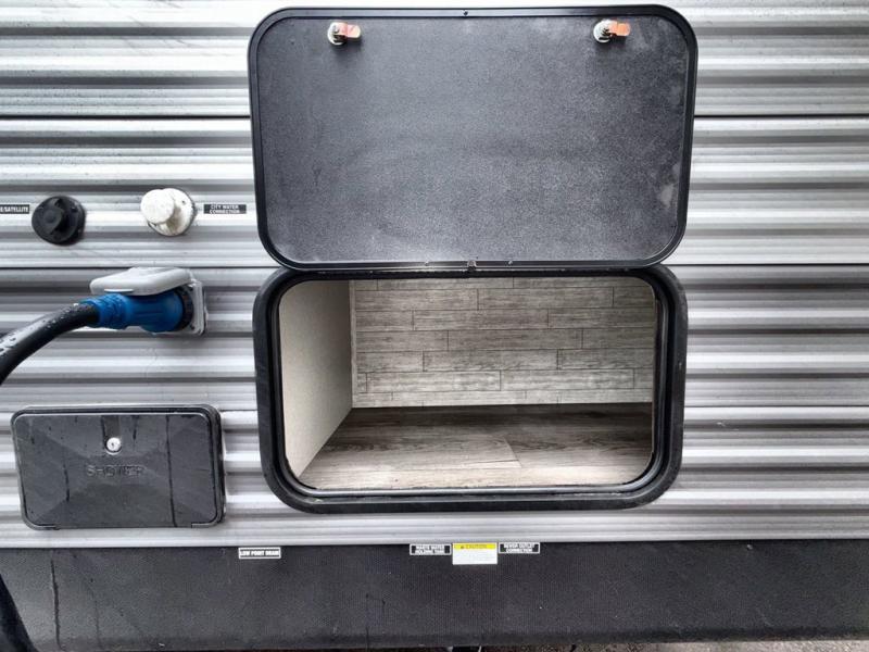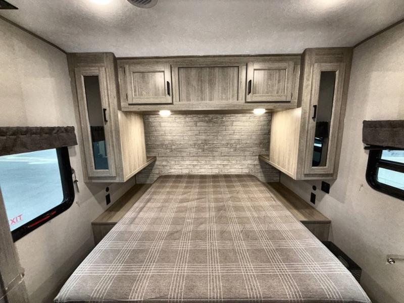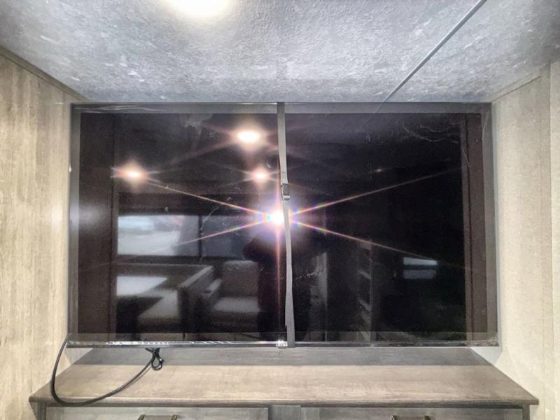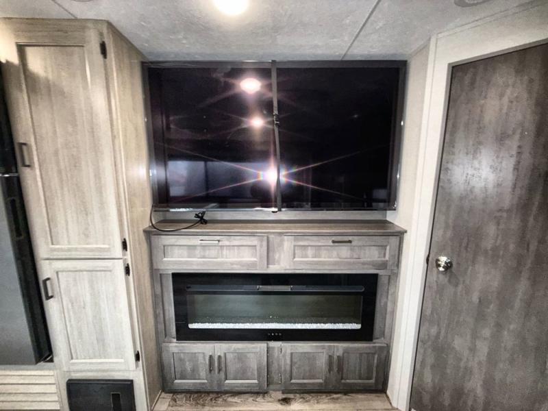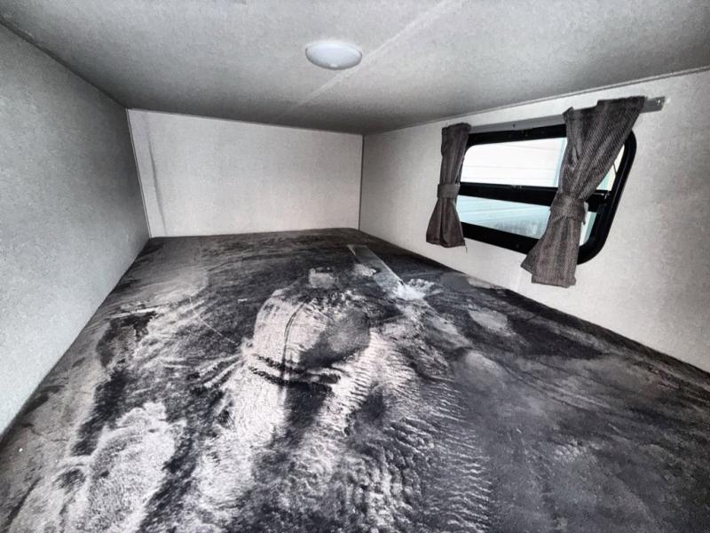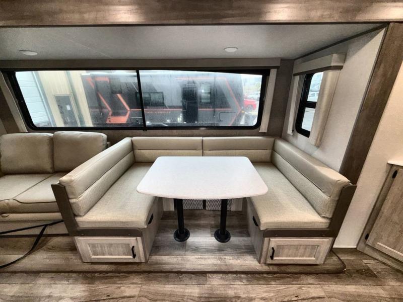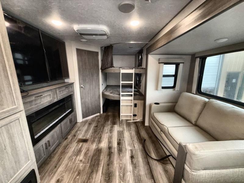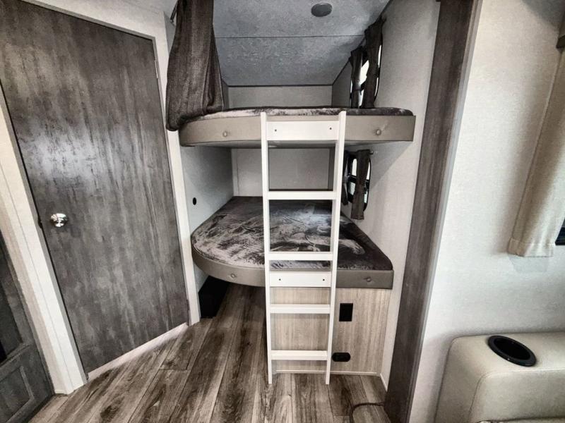 This travel trailer is perfect for your whole crew! Once you arrive at the campground, you can put out the 21' electric awning and start lunch on the exterior camper kitchen with a griddle and mini fridge. There is also a pass-thru storage plus additional exterior storage with a fold-down table and a TV hookup for added convenience. And since there are dual entry doors found on this unit, you can enter in through the full bath in the back, or the main living area towards the front! A large slide provides ample space to move about, and you'll find a trundle sofa and U-shaped dinette here for cozy seating and sleeping space. Speaking of sleeping, there is a front RV queen bed in the bedroom plus double-size bunks in the back for guests!