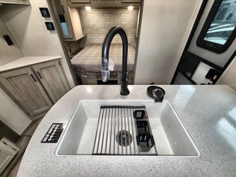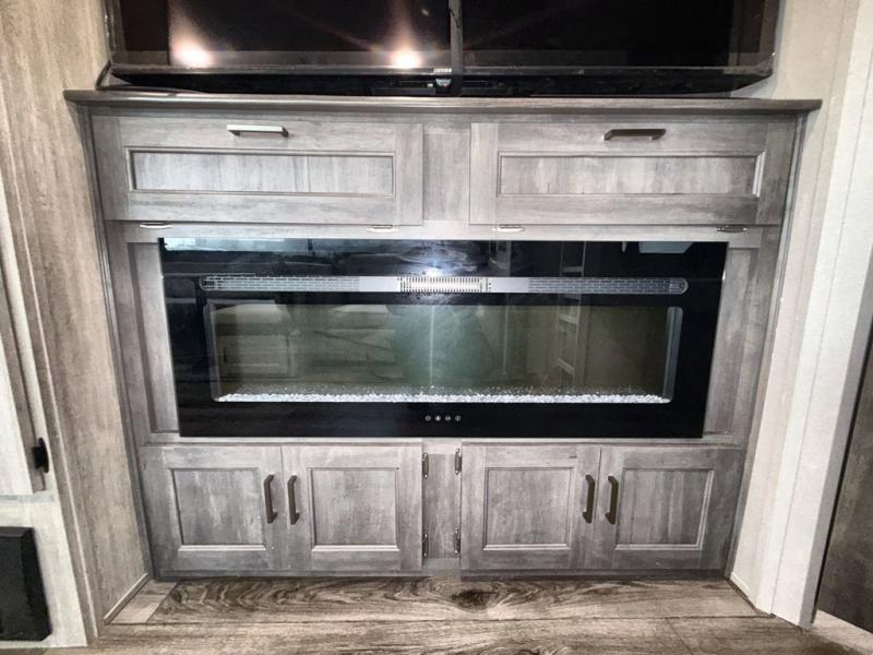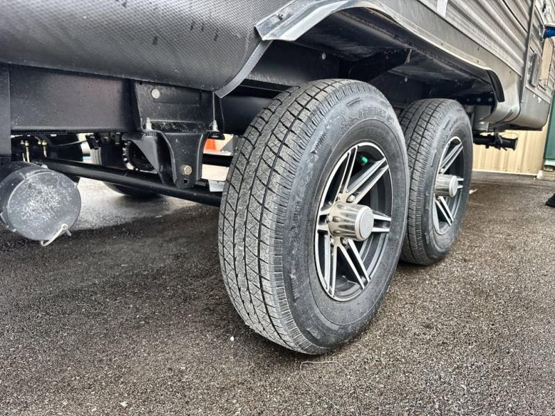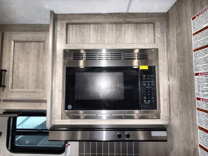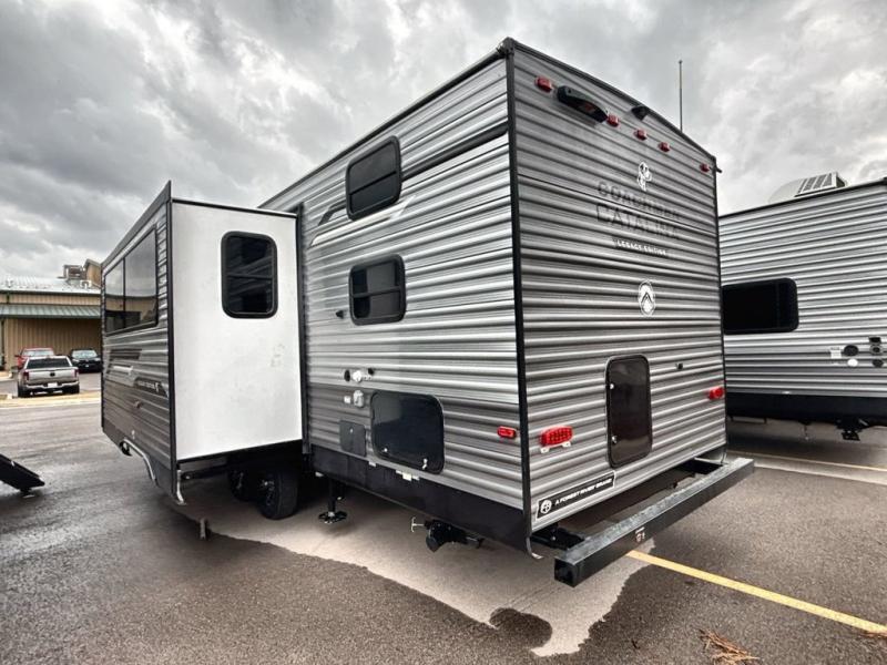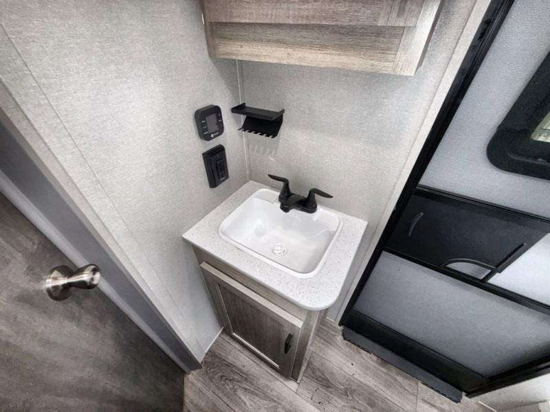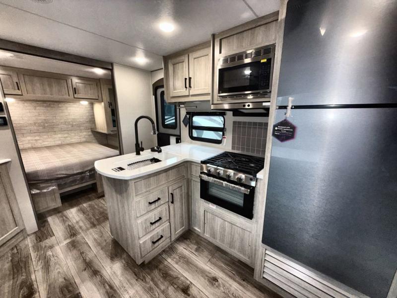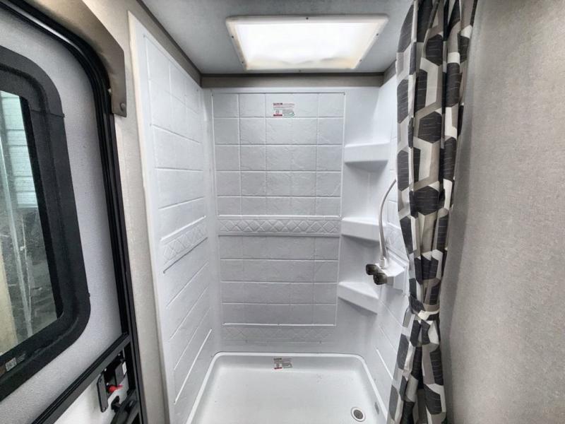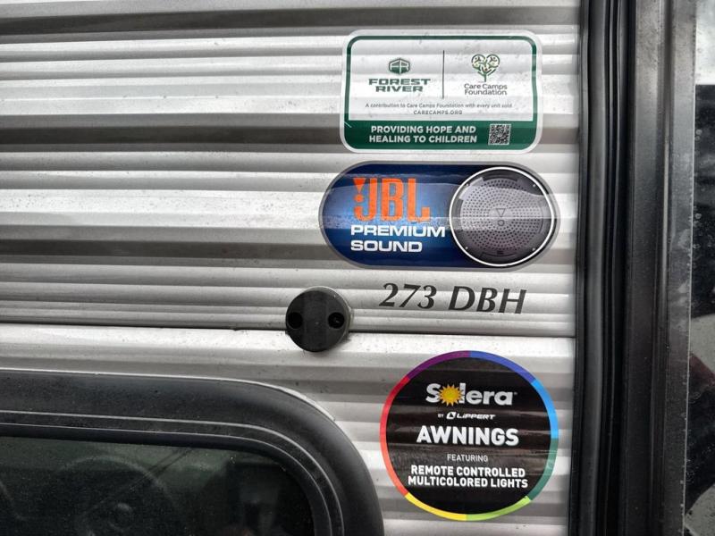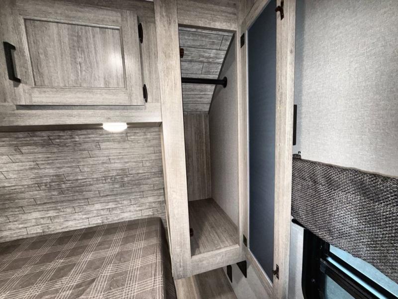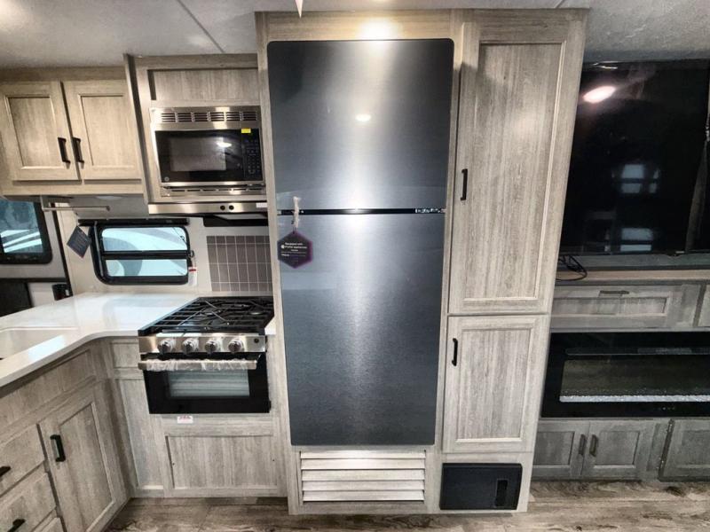This travel trailer is perfect for your whole crew! Once you arrive at the campground, you can put out the 21' electric awning and start lunch on the exterior camper kitchen with a griddle and mini fridge. There is also a pass-thru storage plus additional exterior storage with a fold-down table and a TV hookup for added convenience. And since there are dual entry doors found on this unit, you can enter in through the full bath in the back, or the main living area towards the front! A large slide provides ample space to move about, and you'll find a trundle sofa and U-shaped dinette here for cozy seating and sleeping space. Speaking of sleeping, there is a front RV queen bed in the bedroom plus double-size bunks in the back for guests!