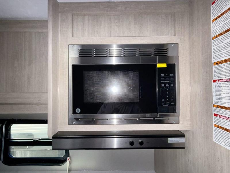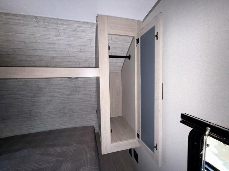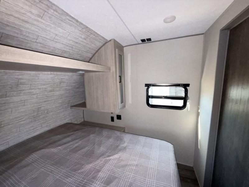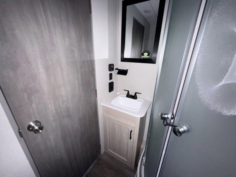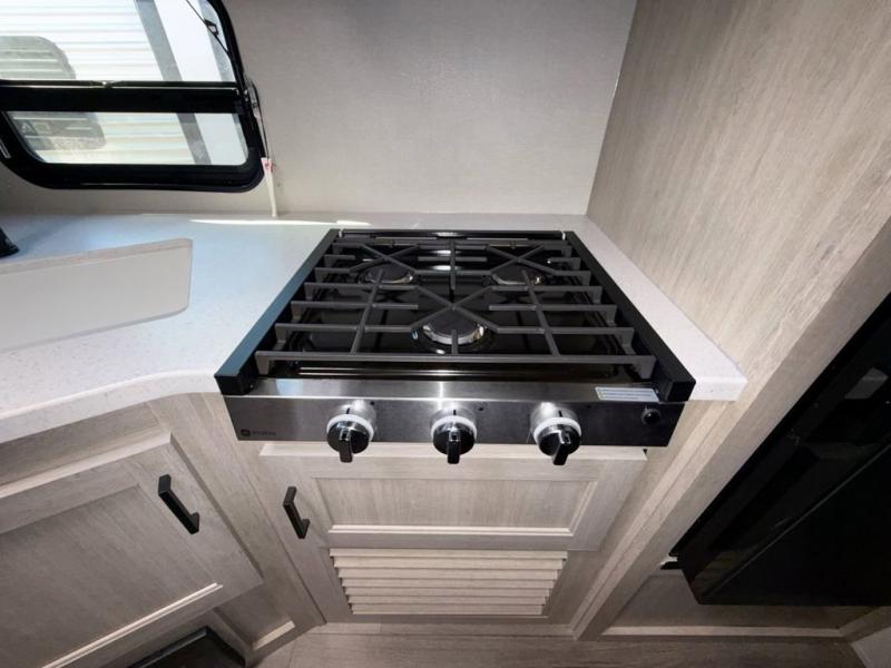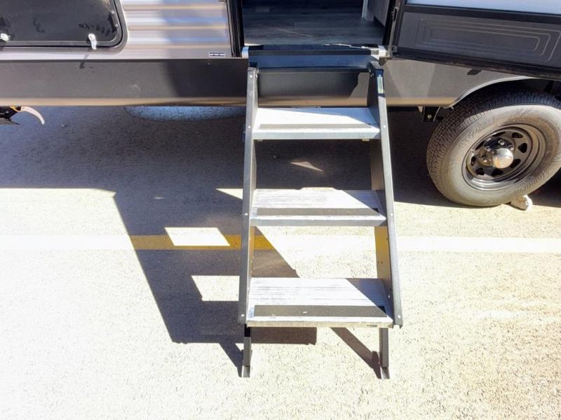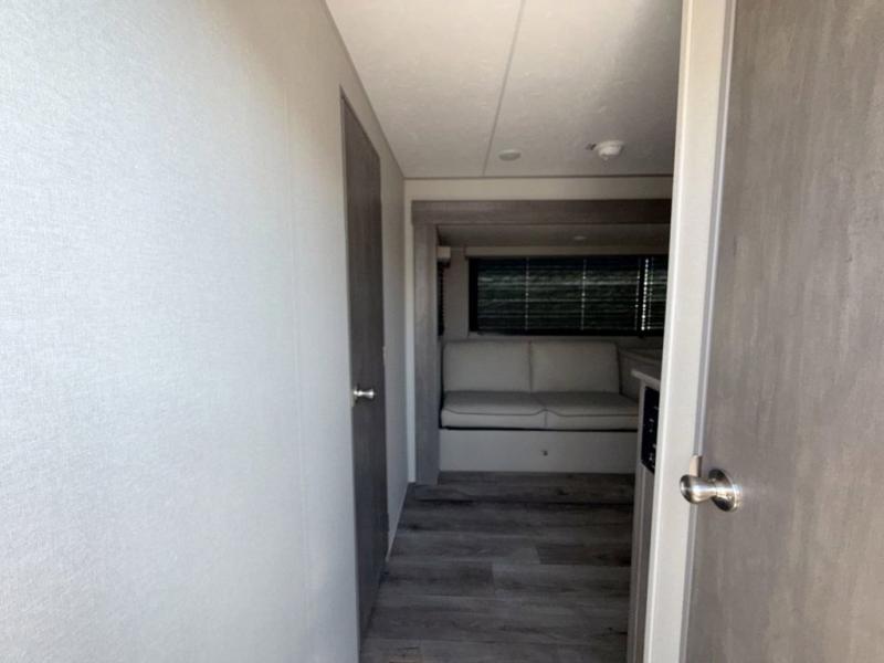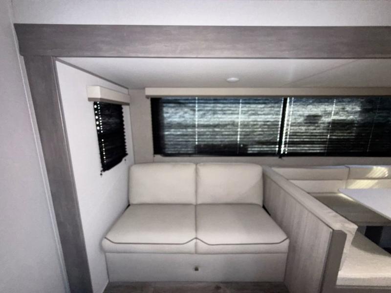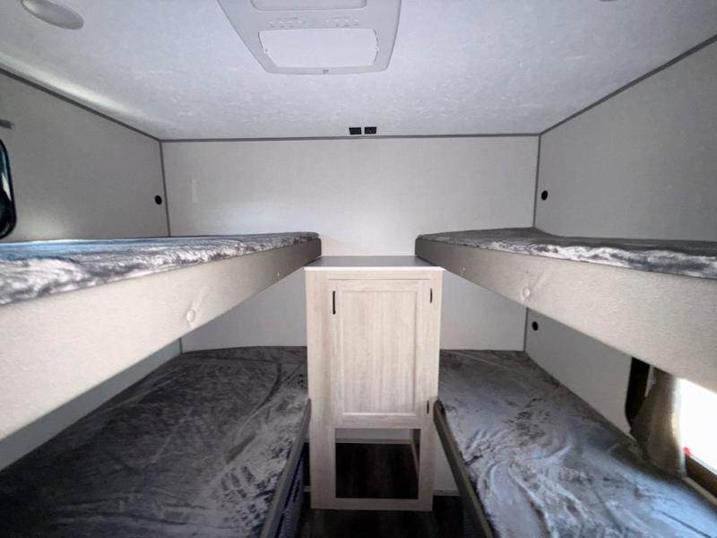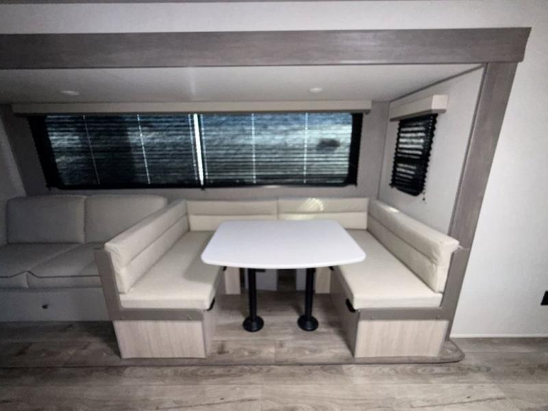 If you enjoy camping with family or a larger friend group, this trailer is sure to meet your needs! The rear private bunkhouse includes single-size bunks plus double-size bunks, allowing you to sleep up to six here alone! You'll have the 60" x 74" queen bed all to yourselves in the front master bedroom, and any additional guests can sleep on the U-shaped dinette and sofa within the large slide out. The chef of your group can use the GE stainless three burner cooktop or microwave oven to create meals each day, and an optional full-size exterior camp kitchen can be added if you enjoy cooking outdoors. A walk-in pantry includes washer and dryer prep if you choose to add these appliances, and everyone can stay clean all week thanks to the dual entry full bath!