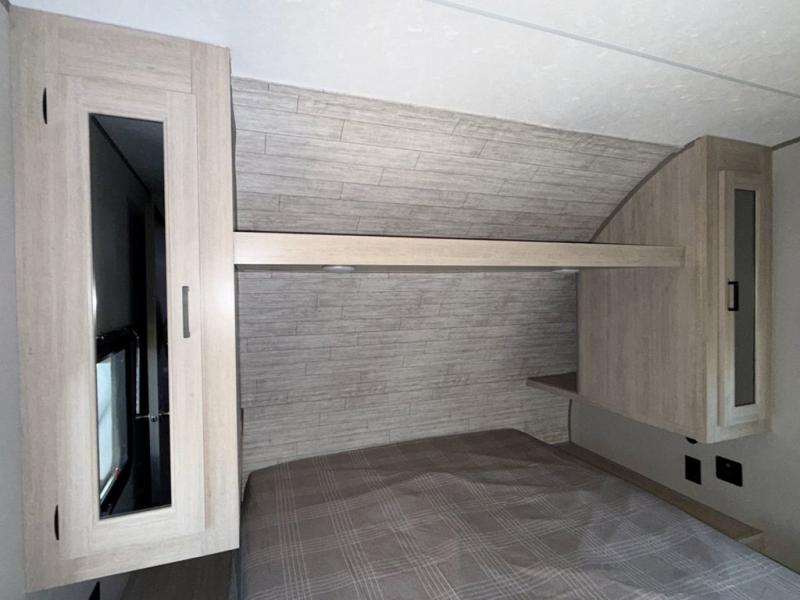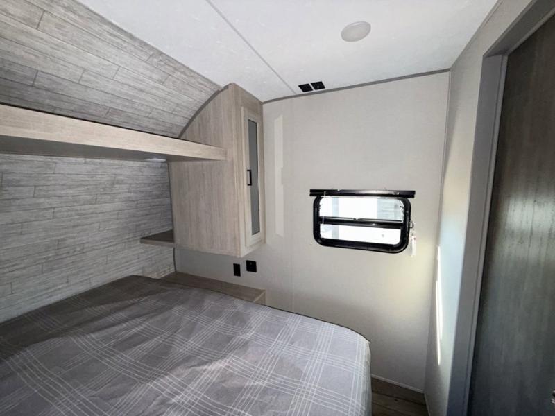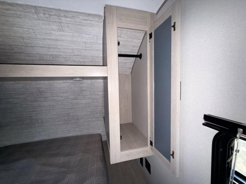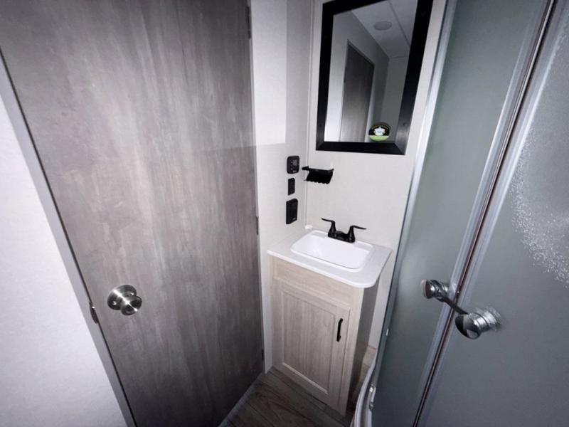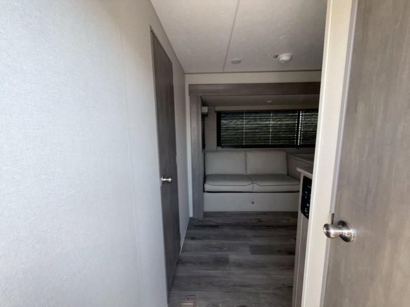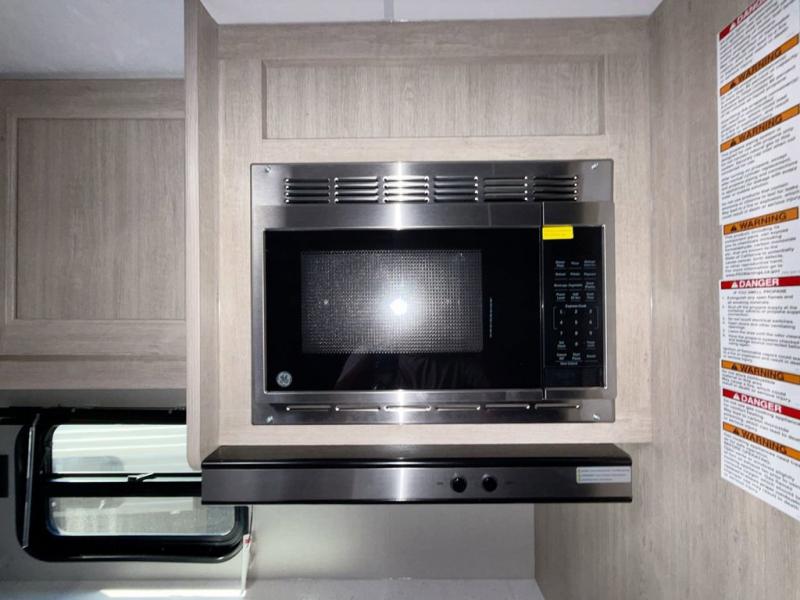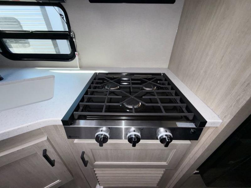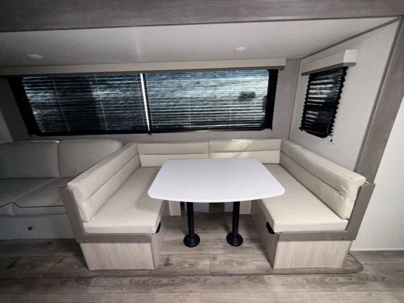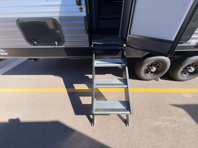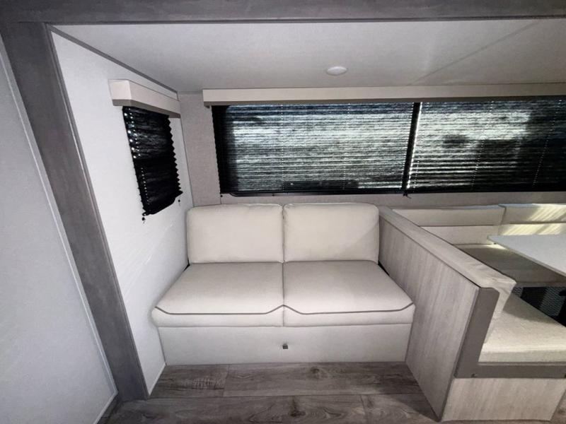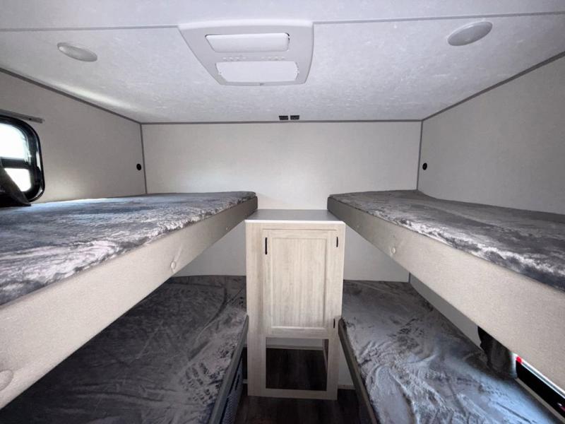 If you enjoy camping with family or a larger friend group, this trailer is sure to meet your needs! The rear private bunkhouse includes single-size bunks plus double-size bunks, allowing you to sleep up to six here alone! You'll have the 60" x 74" queen bed all to yourselves in the front master bedroom, and any additional guests can sleep on the U-shaped dinette and sofa within the large slide out. The chef of your group can use the GE stainless three burner cooktop or microwave oven to create meals each day, and an optional full-size exterior camp kitchen can be added if you enjoy cooking outdoors. A walk-in pantry includes washer and dryer prep if you choose to add these appliances, and everyone can stay clean all week thanks to the dual entry full bath!