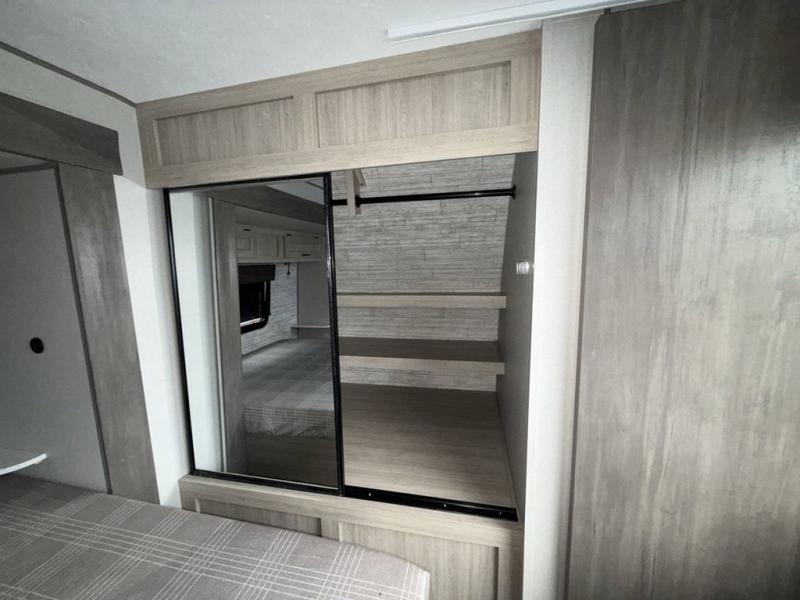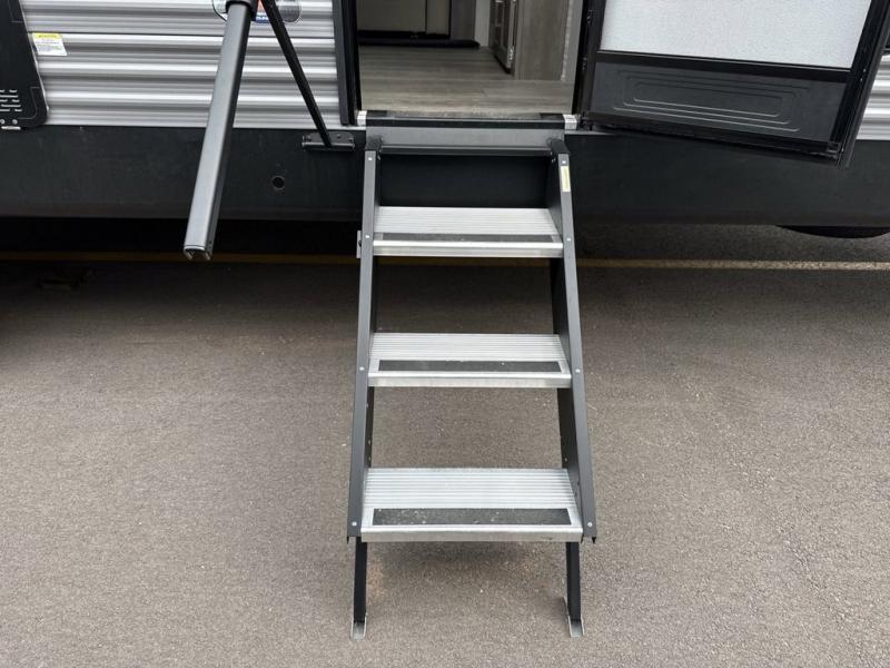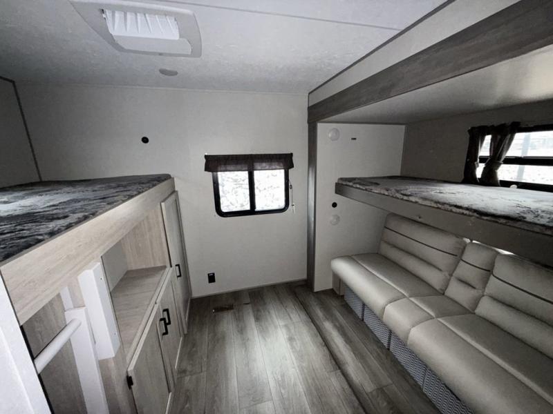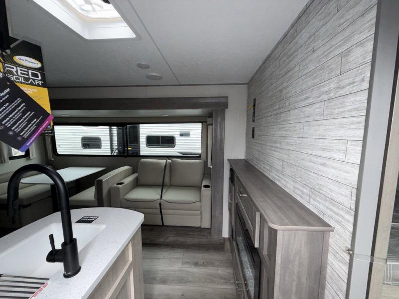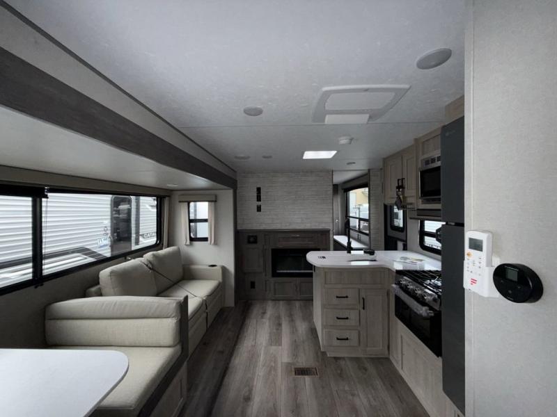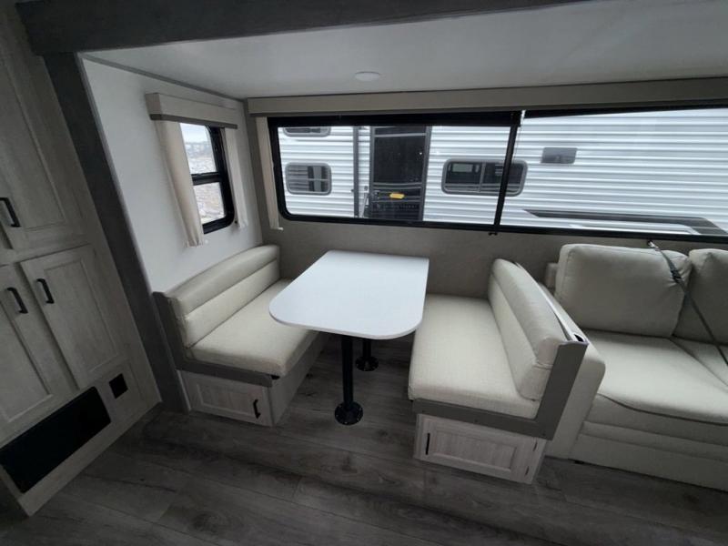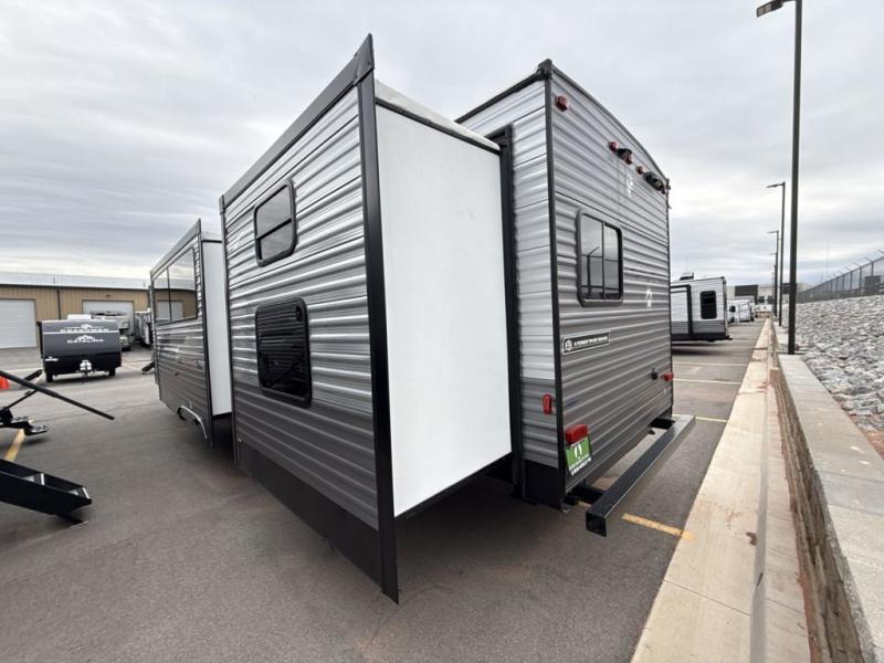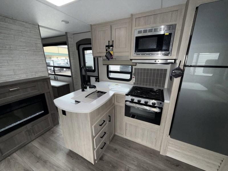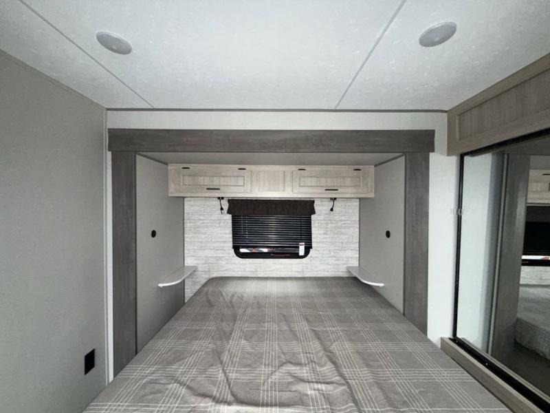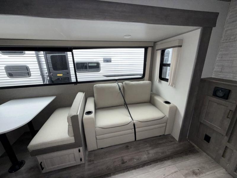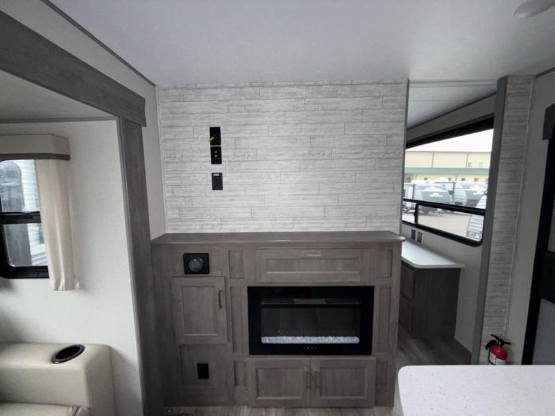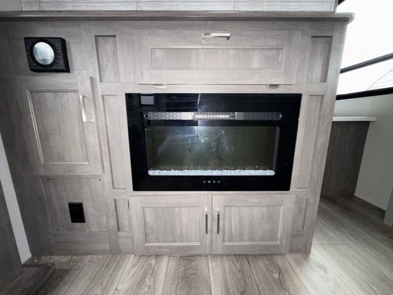 This unique travel trailer offers two bedrooms complete with a slide out RV queen beds with nightstands, and clothing storage. You can choose from the front bedroom with a large closet and a second closet prepped for a washer and dryer, or the rear bedroom with a wardrobe and TV cabinet. With three total slides throughout there is space for everyone! You and your family will love the combined living and kitchen area with a slide out booth dinette and sofa with drink holders, and maybe you'll decide to add the fireplace option. The L-shaped kitchen counter allows the cook to make meals without moving for anyone trying to get to the full bathroom or either bedroom. And when you want to relax outdoors, the 21' power awning with multicolor LED lights allows you to choose the color you like best.