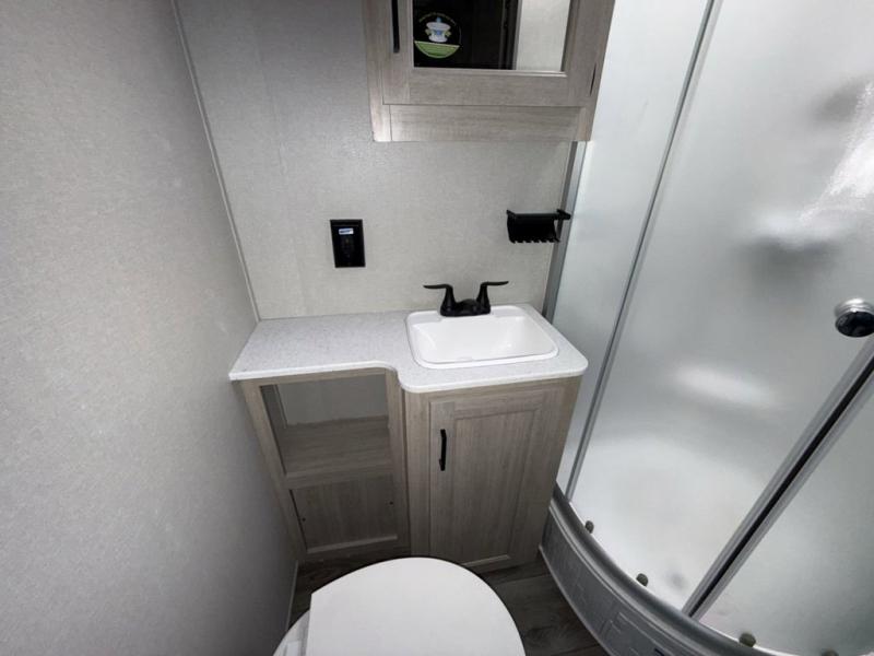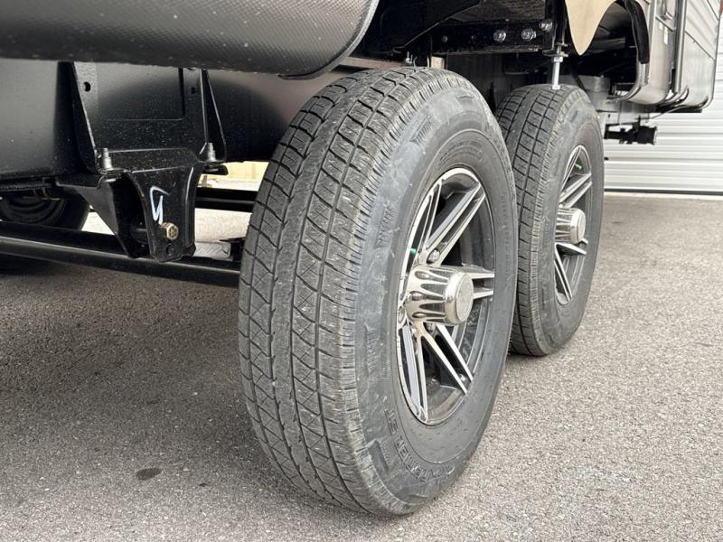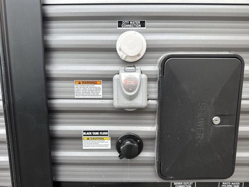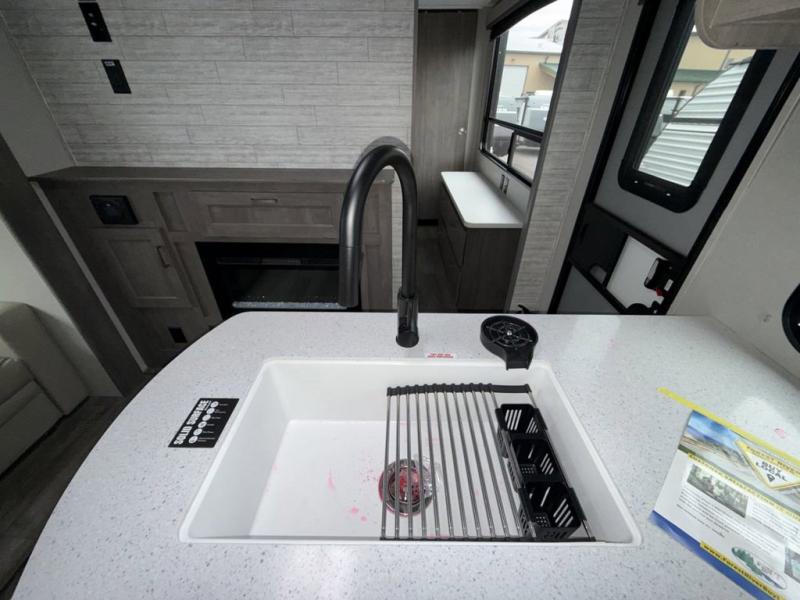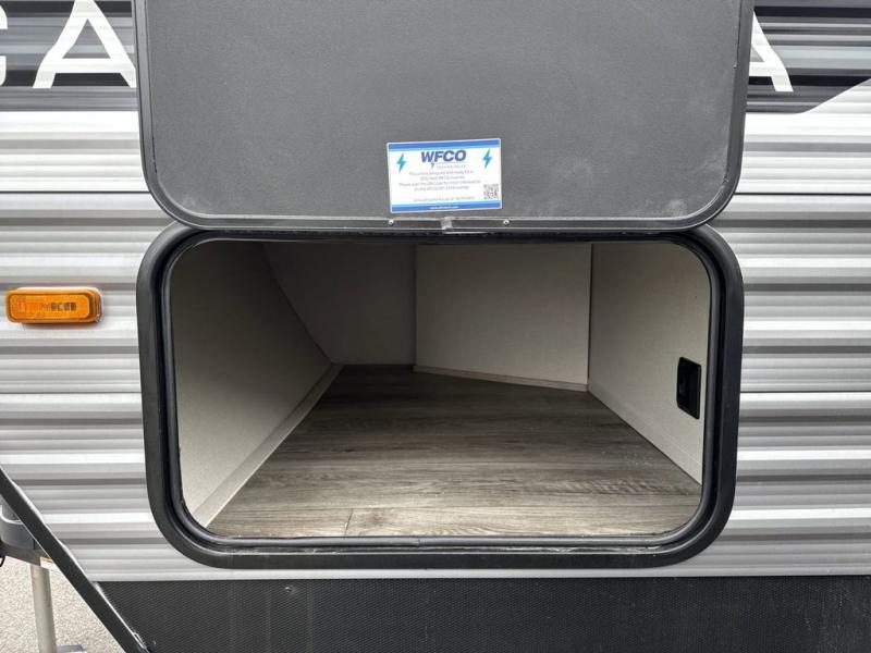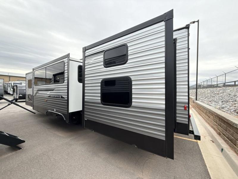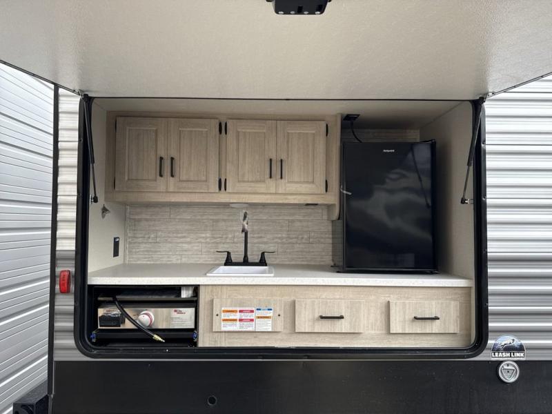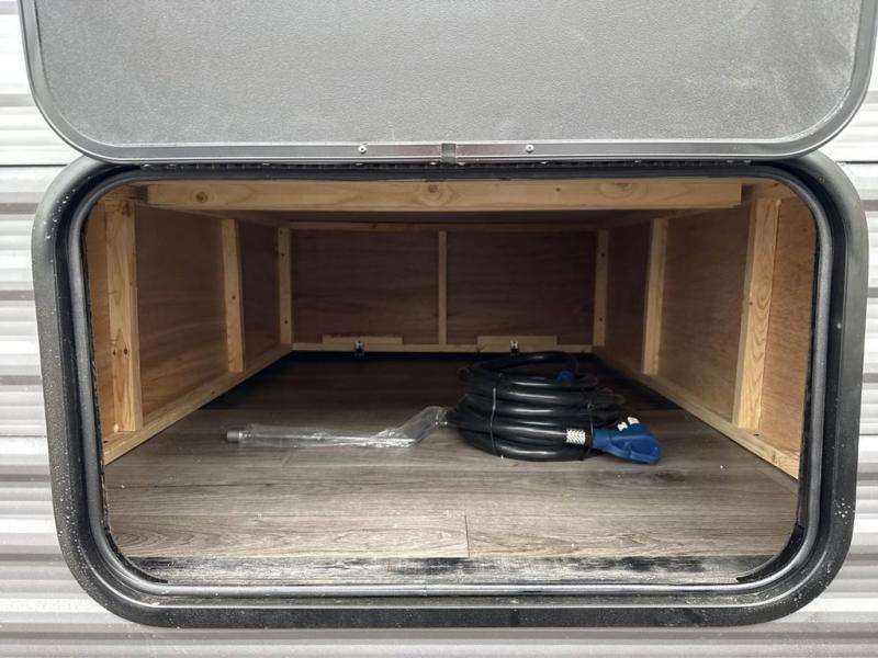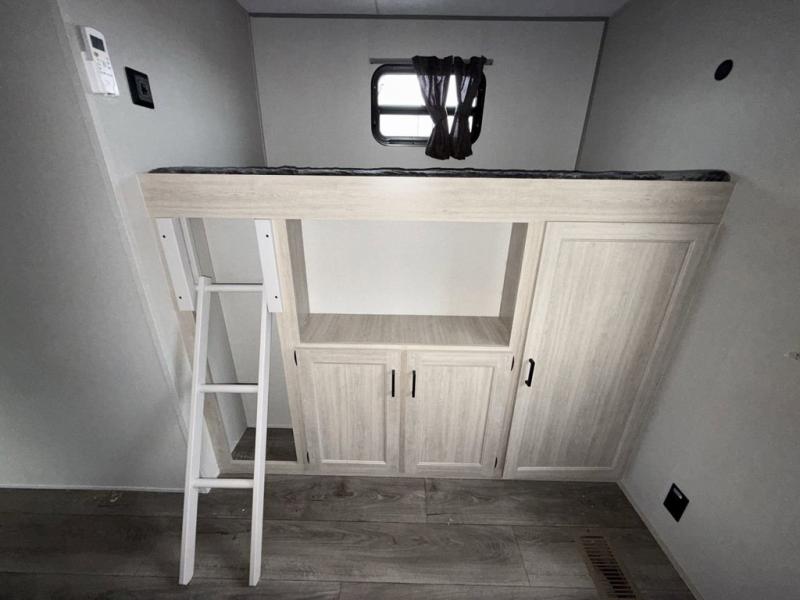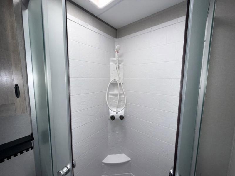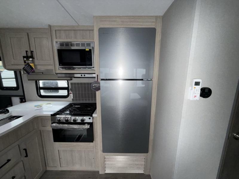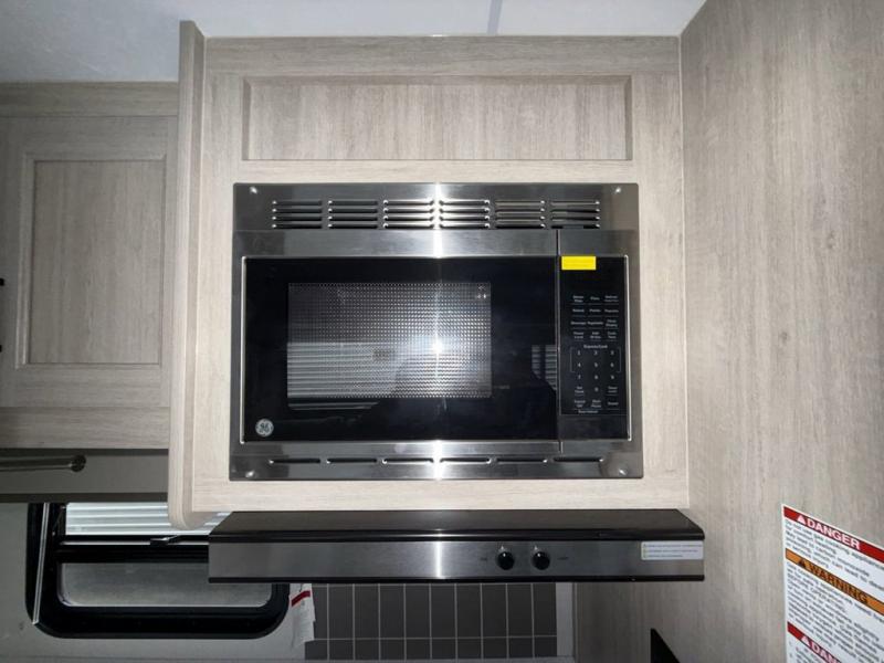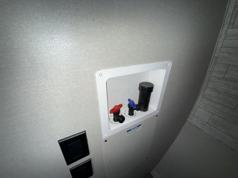 This unique travel trailer offers two bedrooms complete with a slide out RV queen beds with nightstands, and clothing storage. You can choose from the front bedroom with a large closet and a second closet prepped for a washer and dryer, or the rear bedroom with a wardrobe and TV cabinet. With three total slides throughout there is space for everyone! You and your family will love the combined living and kitchen area with a slide out booth dinette and sofa with drink holders, and maybe you'll decide to add the fireplace option. The L-shaped kitchen counter allows the cook to make meals without moving for anyone trying to get to the full bathroom or either bedroom. And when you want to relax outdoors, the 21' power awning with multicolor LED lights allows you to choose the color you like best.