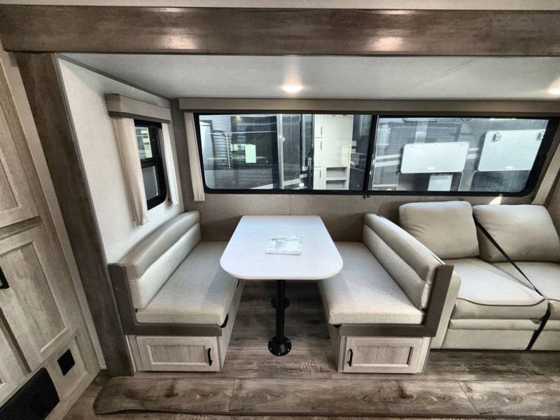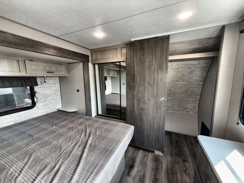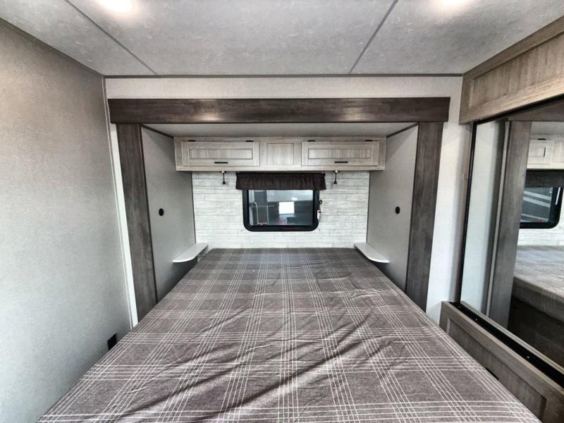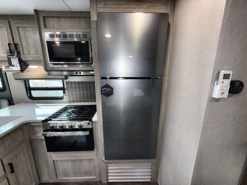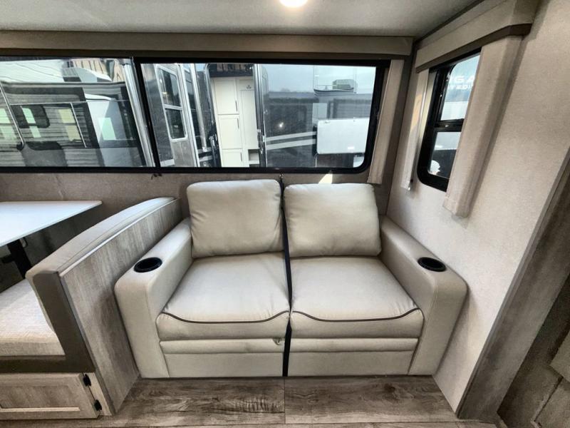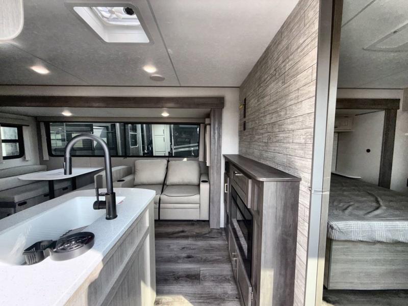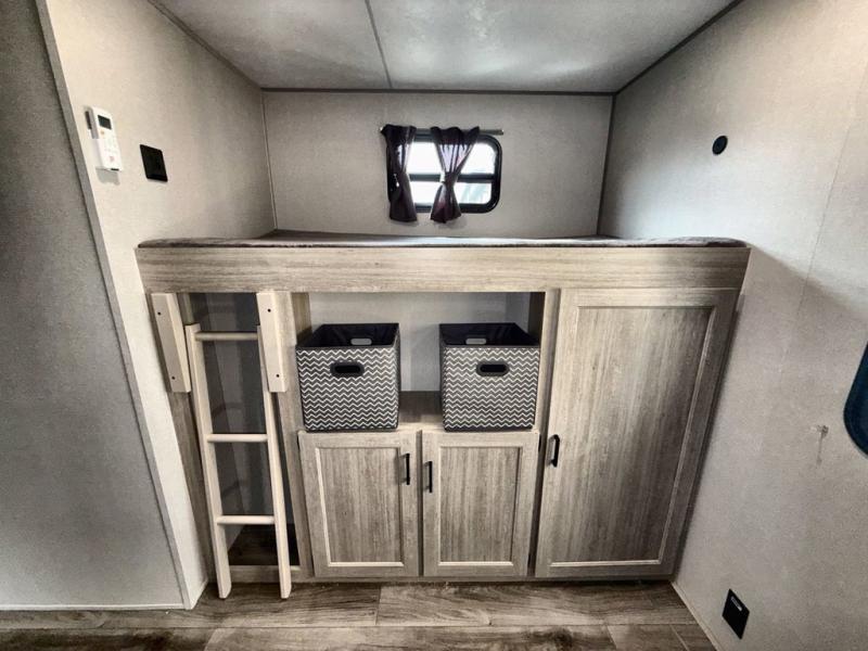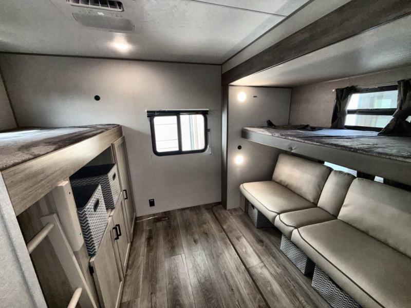 This family-friendly trailer offers lots of floor space thanks to the triple slides throughout! You and your family will love the combined living and kitchen area with a slide out booth dinette and a sofa with drink holders. The L-shaped kitchen counter allows the cook to make meals without moving for anyone trying to get to the full bathroom or the rear bunkhouse. The kids will have their own privacy, two bunk beds, a jack knife sofa with storage totes below plus a TV/wardrobe cabinet. The front private bedroom allows you to sleep like royalty and offers a large closet for your clothing and another closet prepped for a washer/dryer. And don't forget about the full-size camper kitchen and the 21' power awning with multicolor LED lights when you are outside.