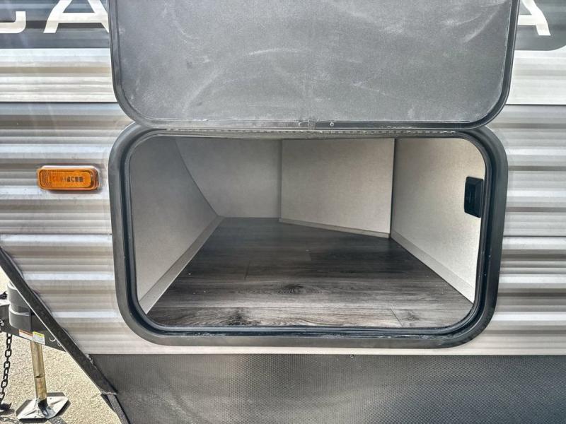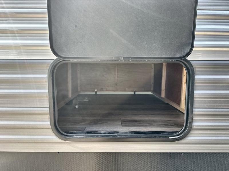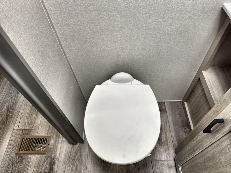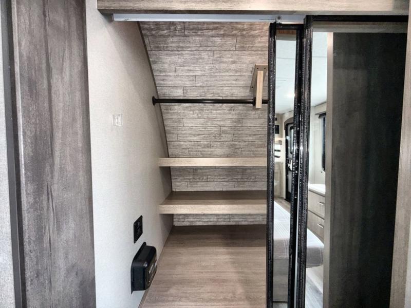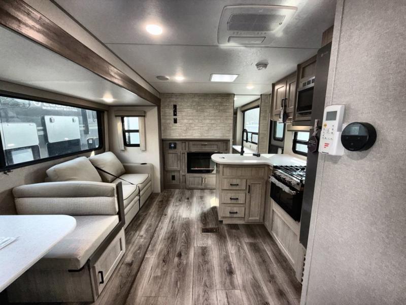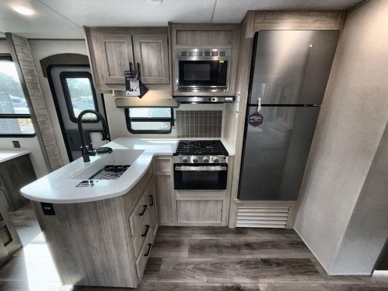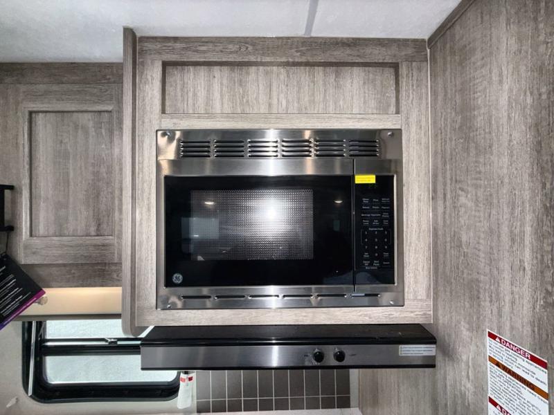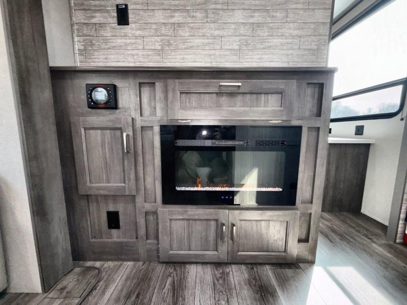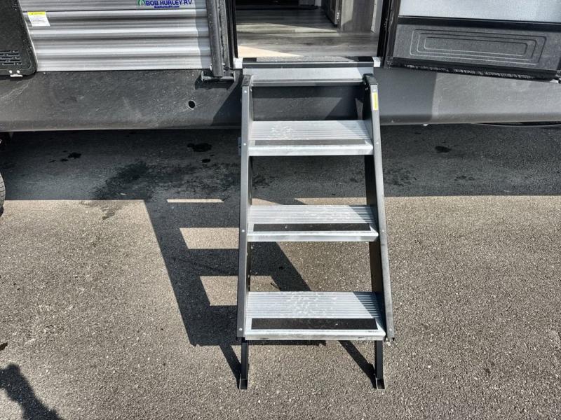 This family-friendly trailer offers lots of floor space thanks to the triple slides throughout! You and your family will love the combined living and kitchen area with a slide out booth dinette and a sofa with drink holders. The L-shaped kitchen counter allows the cook to make meals without moving for anyone trying to get to the full bathroom or the rear bunkhouse. The kids will have their own privacy, two bunk beds, a jack knife sofa with storage totes below plus a TV/wardrobe cabinet. The front private bedroom allows you to sleep like royalty and offers a large closet for your clothing and another closet prepped for a washer/dryer. And don't forget about the full-size camper kitchen and the 21' power awning with multicolor LED lights when you are outside.