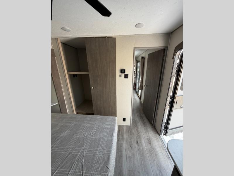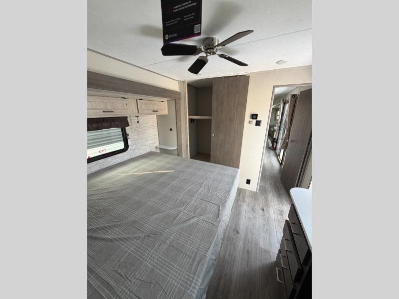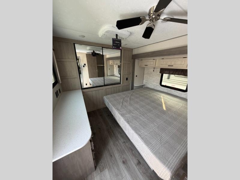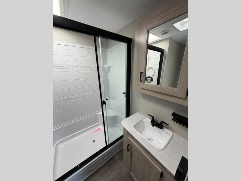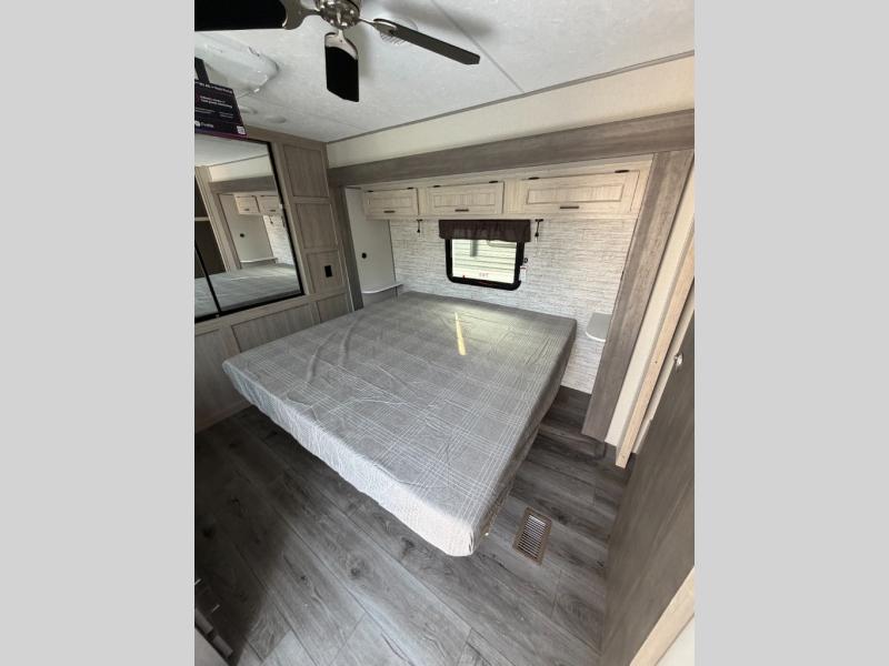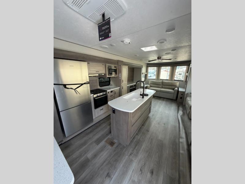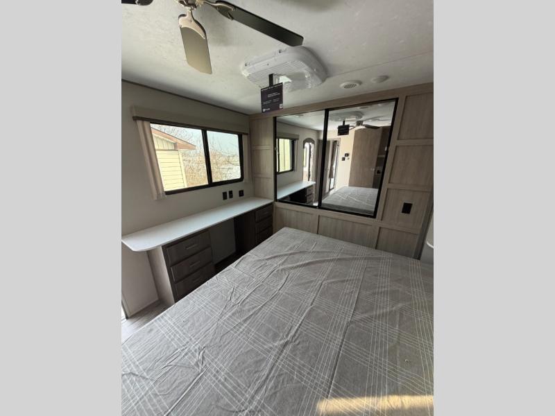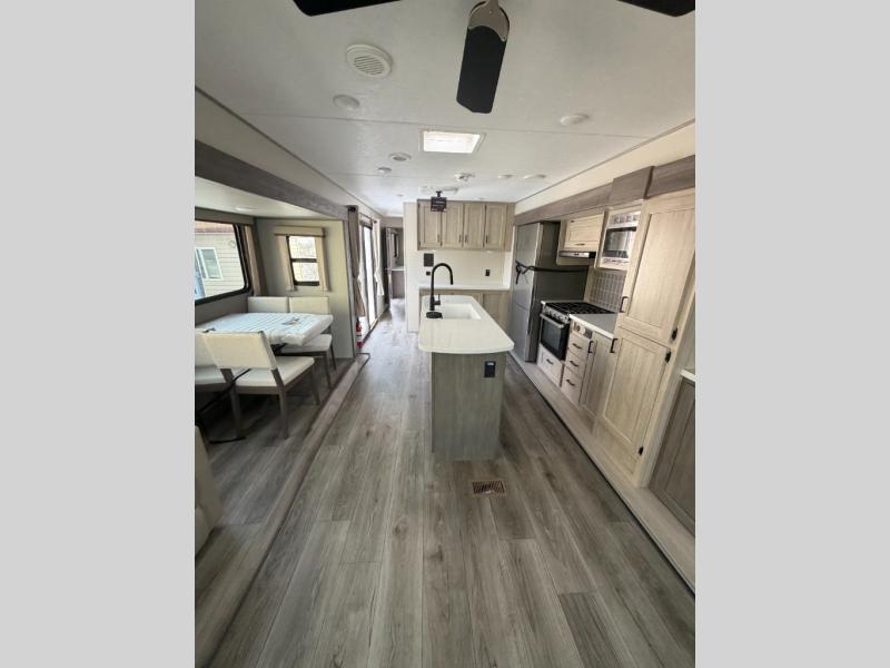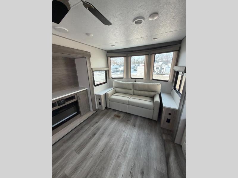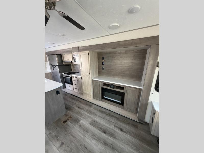 You'll feel right at home in this spacious destination trailer with triple slides. The front entertainment center and front living room includes a tri-fold sofa, booth dinette for ample seating space, and there is optional theater seating. The cook will love the spacious kitchen with an island, a residential refrigerator, a pantry and an extra countertop space. The full bathroom offers a shower with a seat and linen storage with washer/dryer prep for added convivence. Head to the rear bedroom for a great night's rest on the king bed slide out, and you can store all your clothes in the dresser with drawers or rear wardrobe with interior storage shelves!