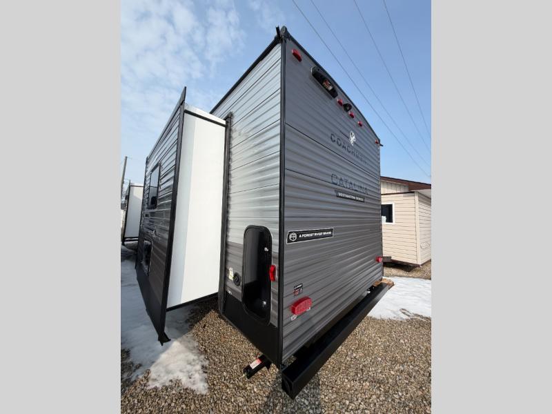 With any Catalina Destination trailer by Coachmen, you will enjoy comfortable extended stays wherever you decide to set up camp! The full length frame outriggers add strength to each unit, along with a seamless Alpha Roof membrane and Norco electromagnetic, powder coated chassis. You will love the open views provided by the residential-style sliding glass patio door, plus there are GE appliances, woodplank linoleum flooring, and hard valance window treatments to make your space feel more like home. Head outside to find a convenient "Leash Link" quick hookup D-ring for your furry friends, premium JBL exterior speakers, flush mount baggage doors for your gear, and the list of amenities goes on!