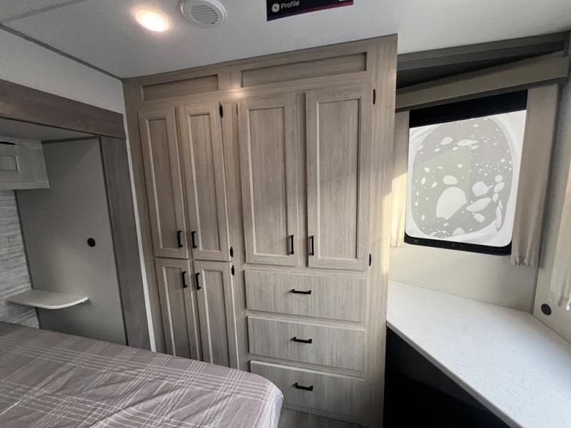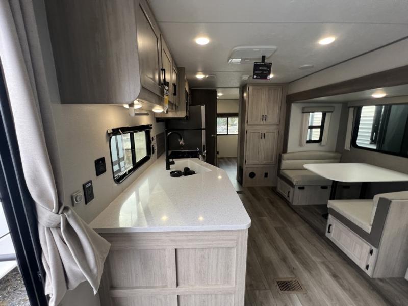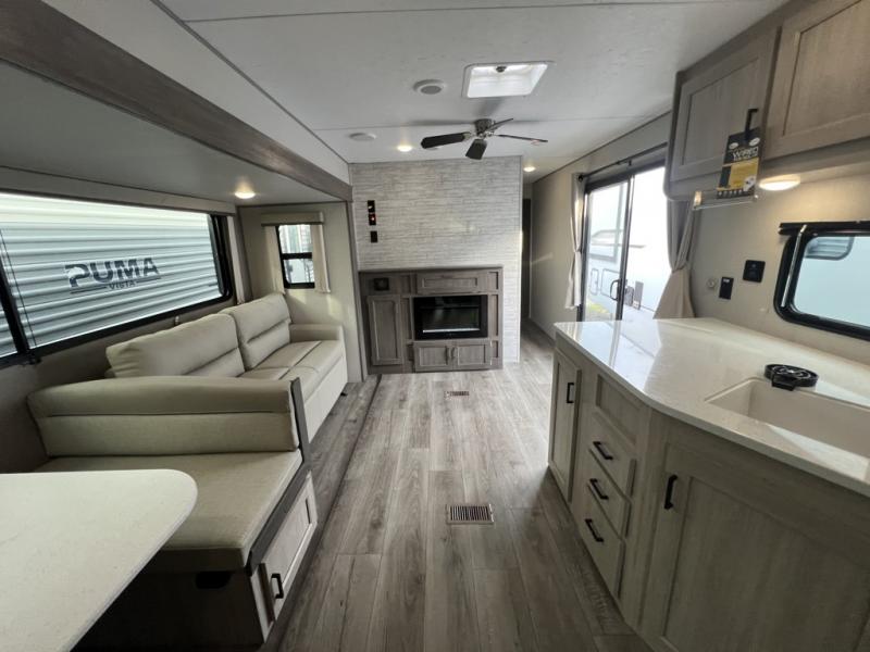 This is the perfect trailer to enjoy long vacations with friends and family. The rear bunkhouse includes a jackknife sofa and flip-up bunk within a slide out, plus storage totes beneath the sofa and a loft bed/bunk across the room. When you want to do a little entertaining, the main living area will be the perfect spot to do so with its tri-fold sofa, booth dinette, and entertainment center with a fireplace. You might even want to choose the theater seating option if you prefer.. The private front bedroom with its own exterior entry door features a queen bed slide out as a nice retreat, and with a separate entry door you can easily slip out for late-night star gazing, a quiet evening out under the optional 21' patio awning, or an early morning walk. And you might want to add the optional full size camp kitchen outside if you enjoy cooking outdoors!