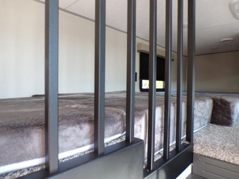 This unit with dual lofts and tons of sleeping space is ideal for a larger group! Lofts at either end of the unit overlook the living area and have a total of five bunk mats, with four 42" x 74" and one smaller 28" x 74". Downstairs there's a private bedroom with a queen bed and fireplace. The main living area has a huge hide-a-bed sectional sofa so you can fit even more guests, or just relax and watch the TV on the power lift in the entertainment center. The kitchen is well-equipped with a residential refrigerator, microwave, and pantry. The centerpiece here is a kitchen island with a deep basin farm-style sink and bar stool seating so your group can gather together and make new memories! The full bath in the rear has a roomy 48" x 30" shower with glass door, and a linen closet.