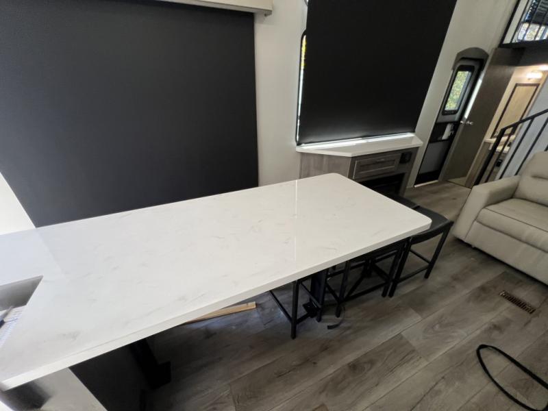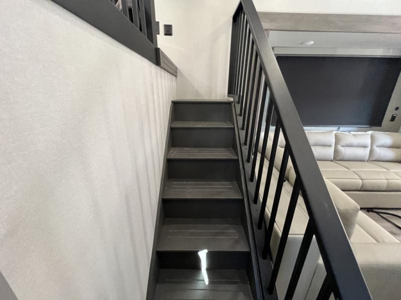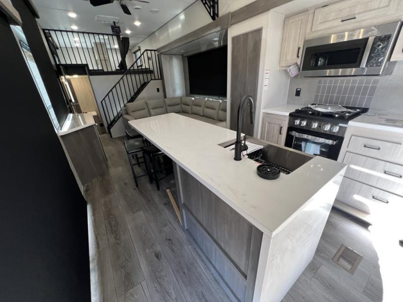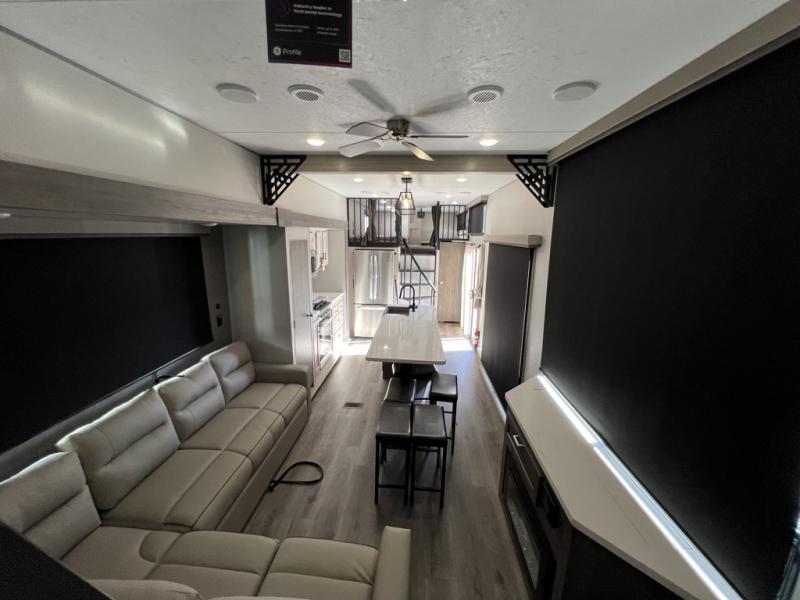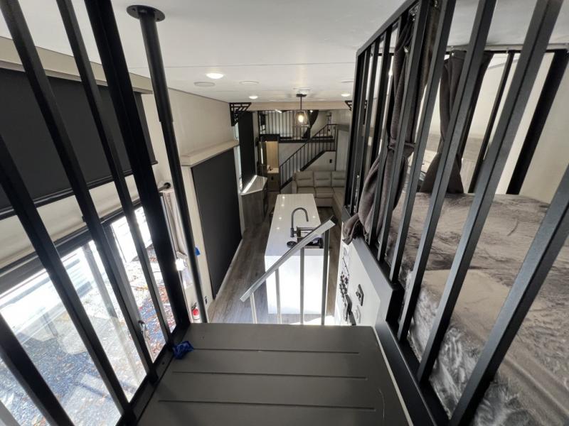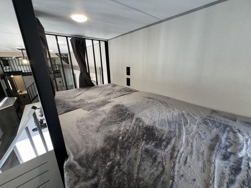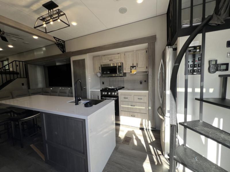 This unit with dual lofts and tons of sleeping space is ideal for a larger group! Lofts at either end of the unit overlook the living area and have a total of five bunk mats, with four 42" x 74" and one smaller 28" x 74". Downstairs there's a private bedroom with a queen bed and fireplace. The main living area has a huge hide-a-bed sectional sofa so you can fit even more guests, or just relax and watch the TV on the power lift in the entertainment center. The kitchen is well-equipped with a residential refrigerator, microwave, and pantry. The centerpiece here is a kitchen island with a deep basin farm-style sink and bar stool seating so your group can gather together and make new memories! The full bath in the rear has a roomy 48" x 30" shower with glass door, and a linen closet.