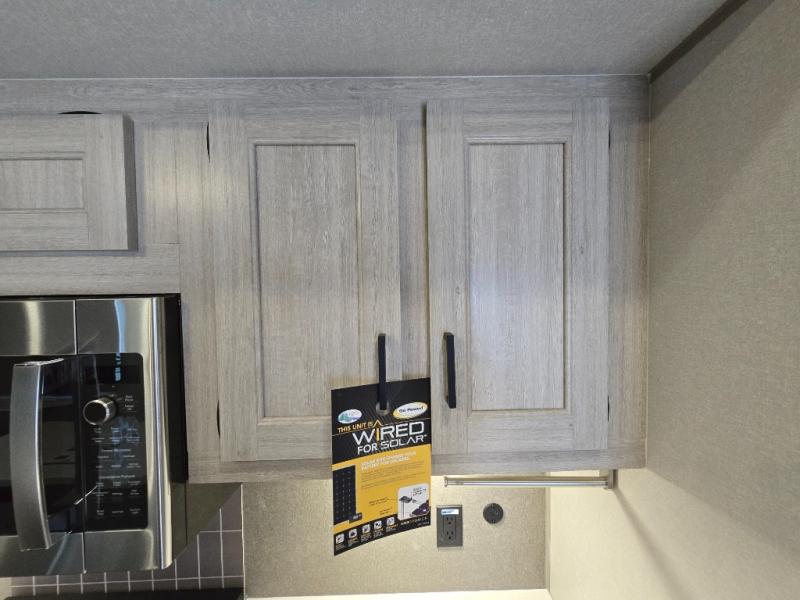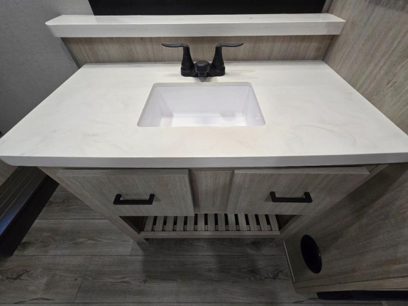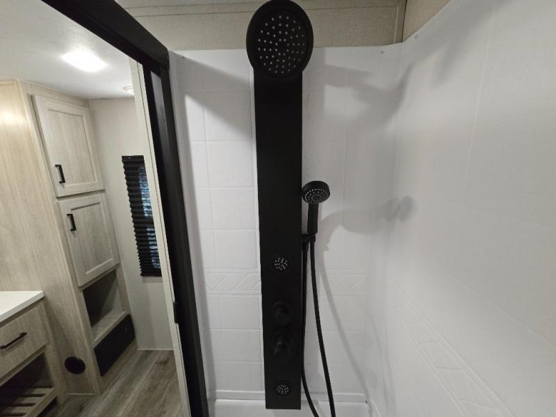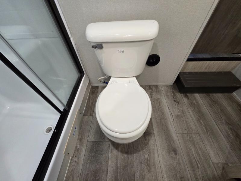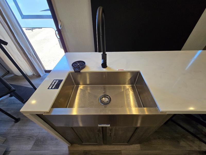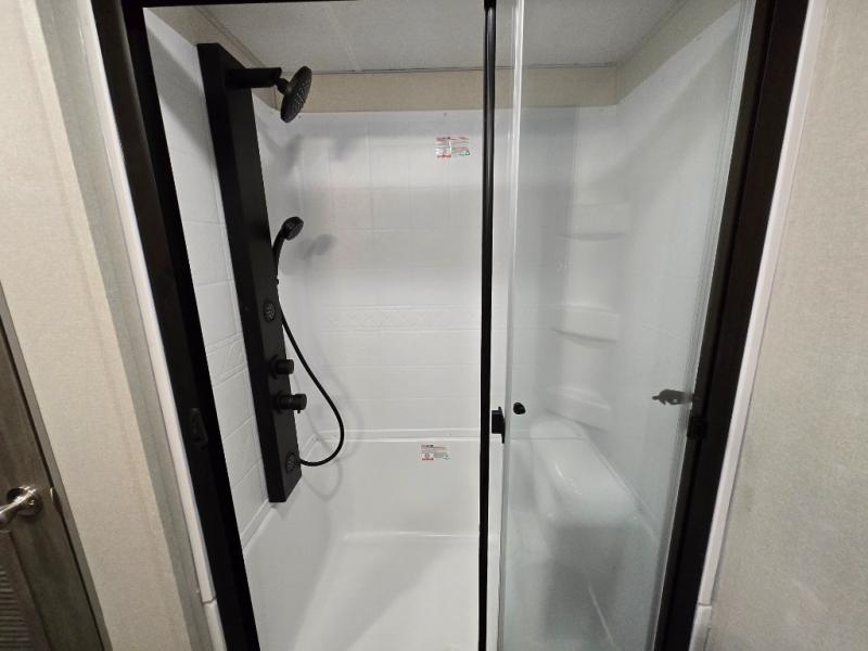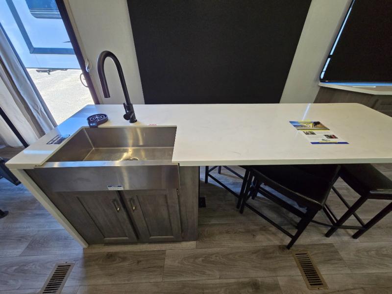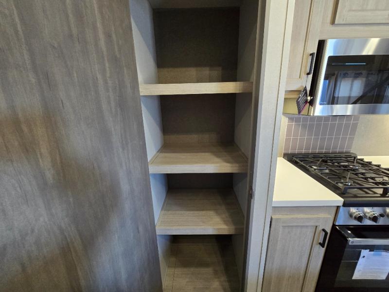 The kitchen combines residential-style comfort with functionality, showcasing a kitchen island with a deep farm-style sink, bar stool seating, a residential refrigerator, microwave, and a pantry for all your cooking essentials. A rear full bathroom includes a 48" x 30" glass door shower and a linen closet, providing both luxury and convenience.