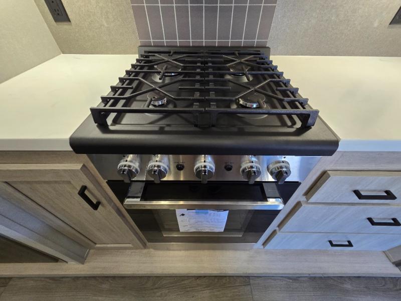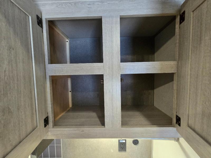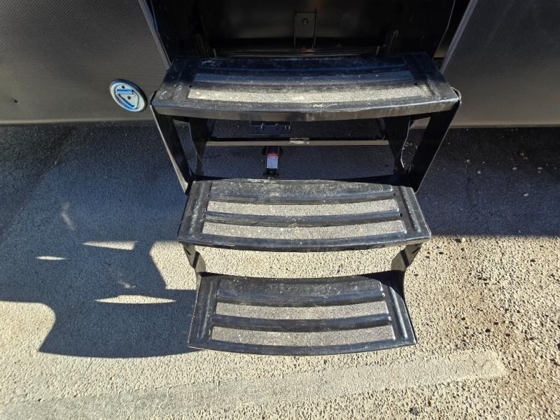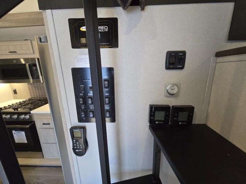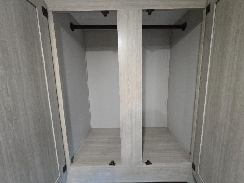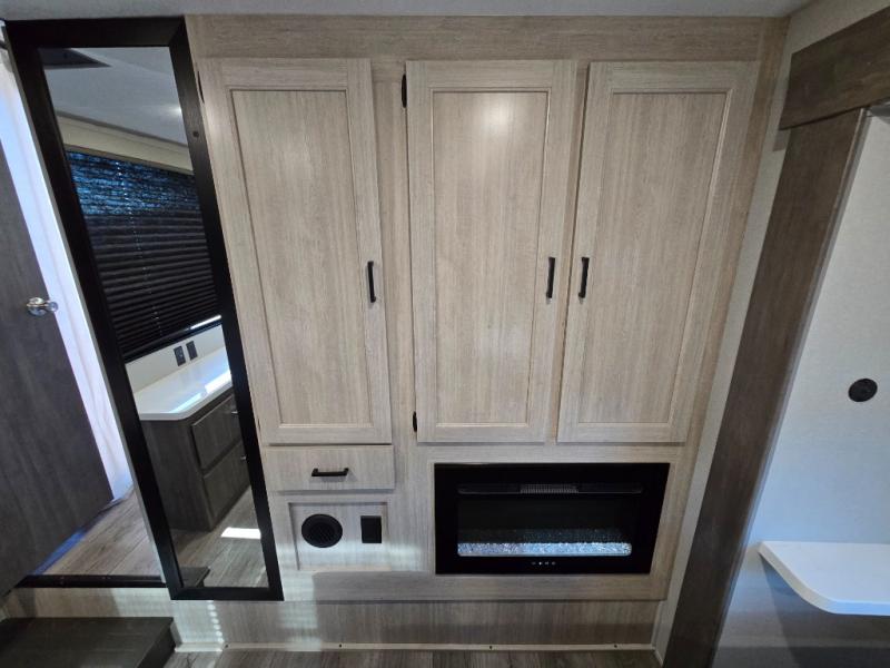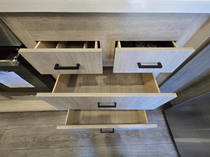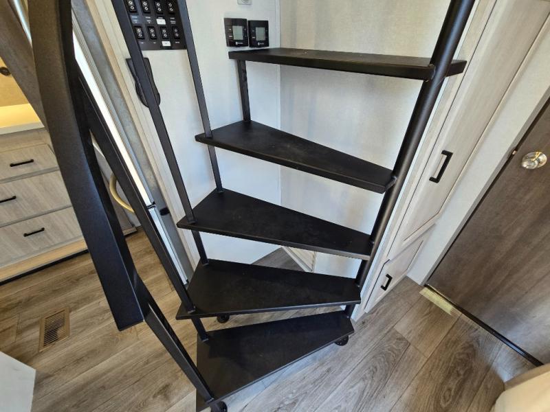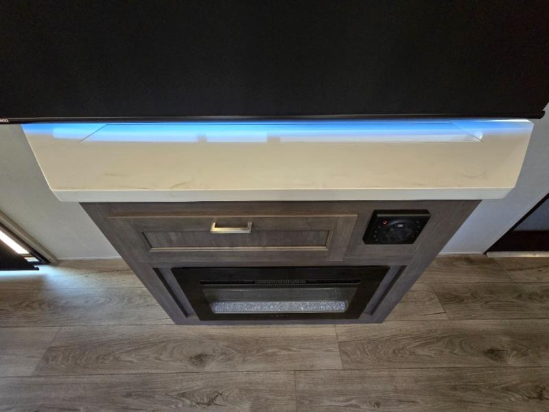 The kitchen combines residential-style comfort with functionality, showcasing a kitchen island with a deep farm-style sink, bar stool seating, a residential refrigerator, microwave, and a pantry for all your cooking essentials. A rear full bathroom includes a 48" x 30" glass door shower and a linen closet, providing both luxury and convenience.