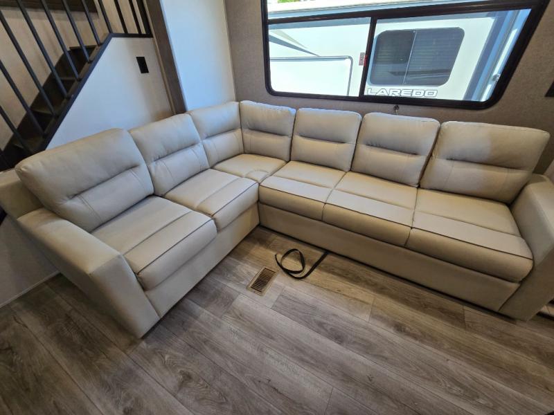 Downstairs, you’ll find a private bedroom with a queen bed, a cozy fireplace, and generous storage. The main living area centers around a large hide-a-bed sectional sofa, ideal for lounging or accommodating additional guests. The entertainment center features a Power Lift TV, so you can easily conceal or reveal it with the touch of a button for a clean, modern look.