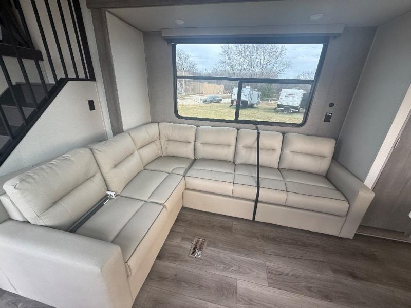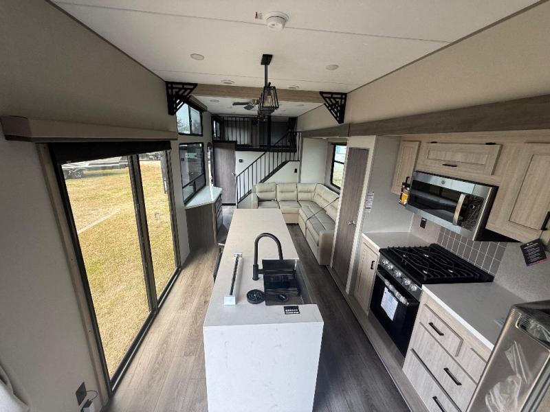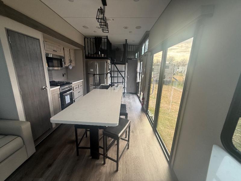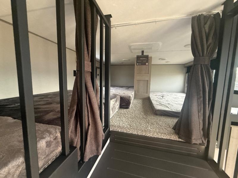 This unit with dual lofts and tons of sleeping space is ideal for a larger group! Lofts at either end of the unit overlook the living area and have a total of five bunk mats, with four 42" x 74" and one smaller 28" x 74". Downstairs there's a private bedroom with a queen bed and fireplace. The main living area has a huge hide-a-bed sectional sofa so you can fit even more guests, or just relax and watch the TV on the power lift in the entertainment center. The kitchen is well-equipped with a french door refrigerator, microwave, and pantry. The centerpiece here is a kitchen island with a deep basin farm-style sink and bar stool seating so your group can gather together and make new memories! The full bath in the rear has a roomy 48" x 30" shower with glass door, and a linen closet.