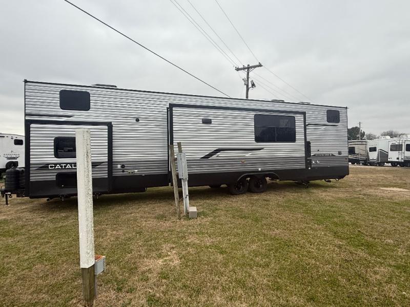 With any Catalina Destination trailer by Coachmen, you will enjoy comfortable extended stays wherever you decide to set up camp! The full length frame outriggers add strength to each unit, along with a seamless Alpha Roof membrane and Norco electromagnetic, powder coated chassis. You will love the open views provided by the residential-style sliding glass patio door, plus there are GE appliances, woodplank linoleum flooring, and hard valance window treatments to make your space feel more like home. Head outside to find a convenient "Leash Link" quick hookup D-ring for your furry friends, premium JBL exterior speakers, flush mount baggage doors for your gear, and the list of amenities goes on!