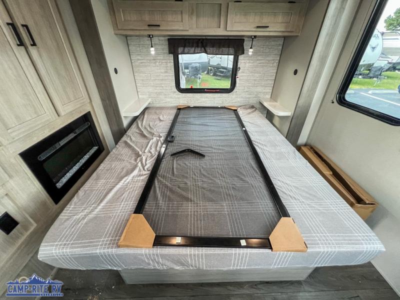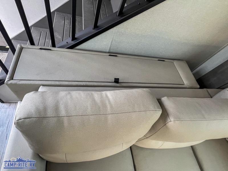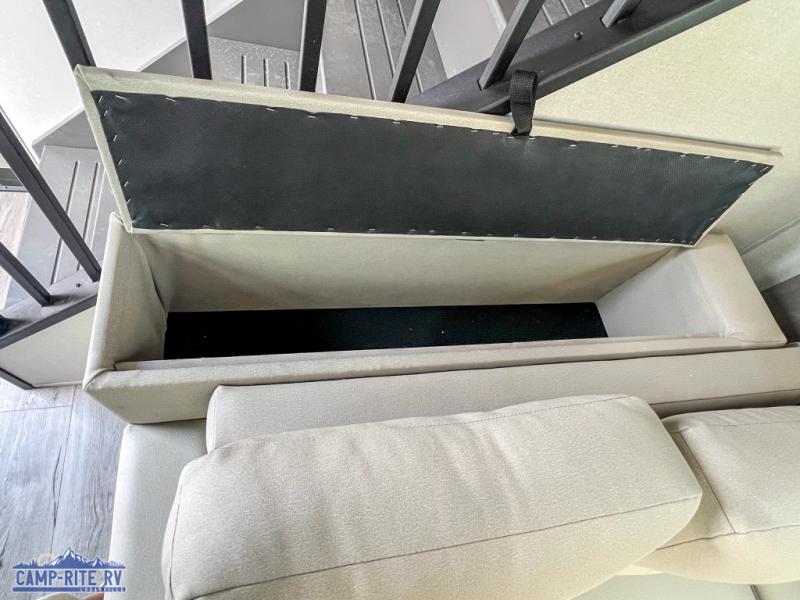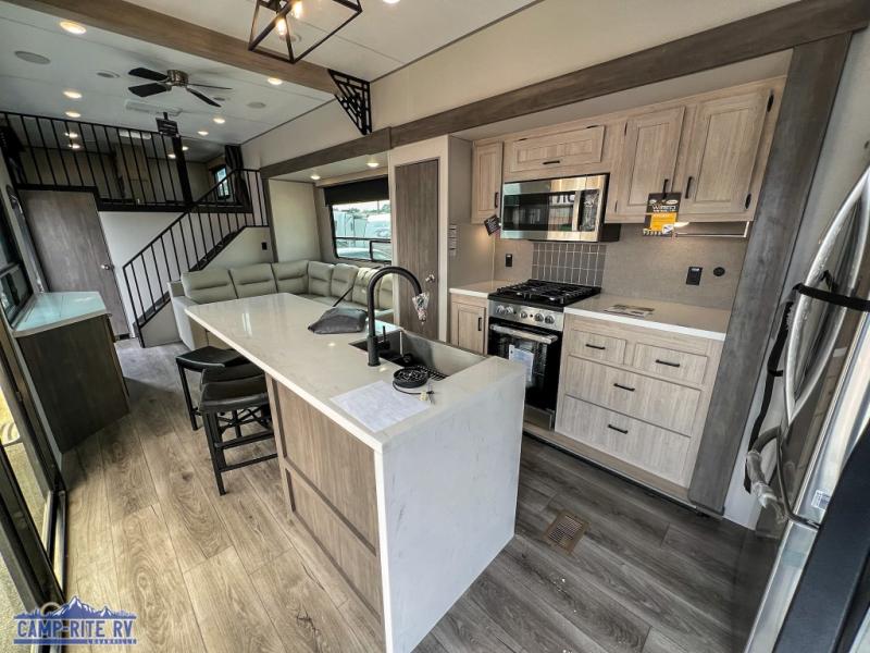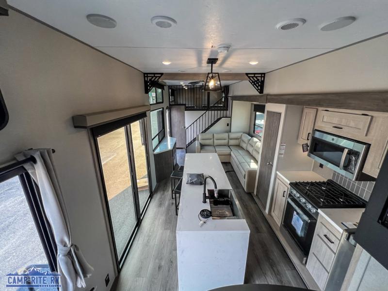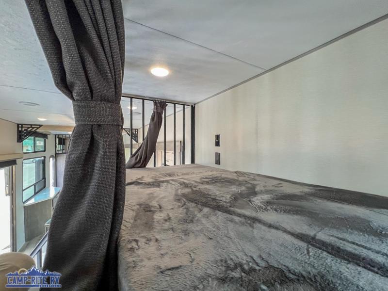 This unit with dual lofts and tons of sleeping space is ideal for a larger group! Lofts at either end of the unit overlook the living area and have a total of five bunk mats, with four 42" x 74" and one smaller 28" x 74". Downstairs there's a private bedroom with a queen bed and fireplace. The main living area has a huge hide-a-bed sectional sofa so you can fit even more guests, or just relax and watch the TV on the power lift in the entertainment center. The kitchen is well-equipped with a french door refrigerator, microwave, and pantry. The centerpiece here is a kitchen island with a deep basin farm-style sink and bar stool seating so your group can gather together and make new memories! The full bath in the rear has a roomy 48" x 30" shower with glass door, and a linen closet.