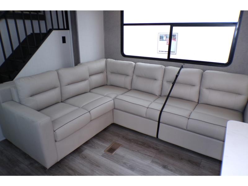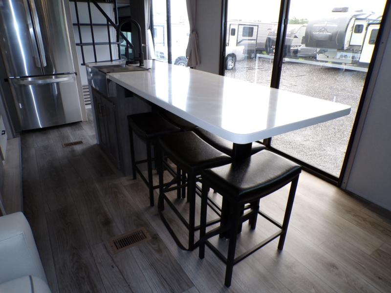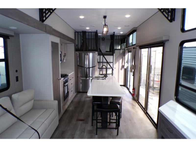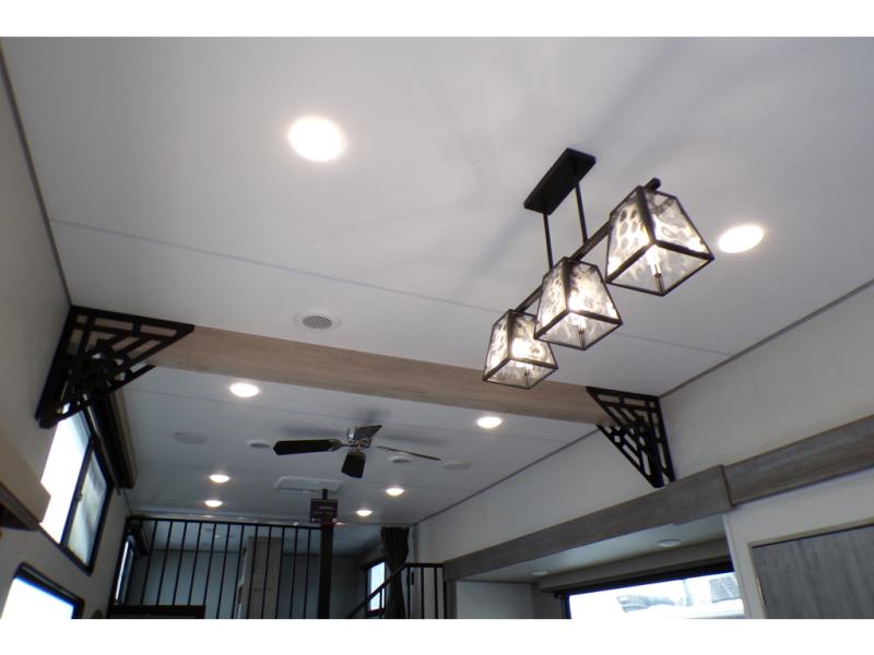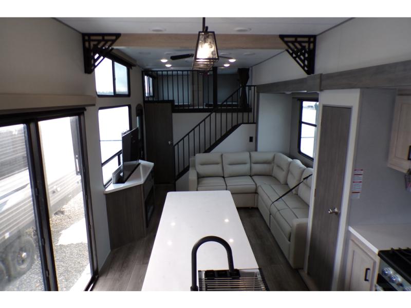 This unit with dual lofts and tons of sleeping space is ideal for a larger group! Lofts at either end of the unit overlook the living area and have a total of five bunk mats, with four 42" x 74" and one smaller 28" x 74". Downstairs there's a private bedroom with a queen bed and fireplace. The main living area has a huge hide-a-bed sectional sofa so you can fit even more guests, or just relax and watch the TV on the power lift in the entertainment center. The kitchen is well-equipped with a french door refrigerator, microwave, and pantry. The centerpiece here is a kitchen island with a deep basin farm-style sink and bar stool seating so your group can gather together and make new memories! The full bath in the rear has a roomy 48" x 30" shower with glass door, and a linen closet.