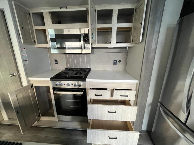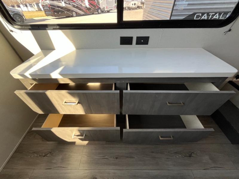 With any Catalina Destination trailer by Coachmen, you will enjoy comfortable extended stays wherever you decide to set up camp! The full length frame outriggers add strength to each unit, along with a seamless Alpha Roof membrane and Norco electromagnetic, powder coated chassis. You will love the open views provided by the residential-style sliding glass patio door, plus there are GE appliances, woodplank linoleum flooring, and hard valance window treatments to make your space feel more like home. Head outside to find a convenient "Leash Link" quick hookup D-ring for your furry friends, premium JBL exterior speakers, flush mount baggage doors for your gear, and the list of amenities goes on!