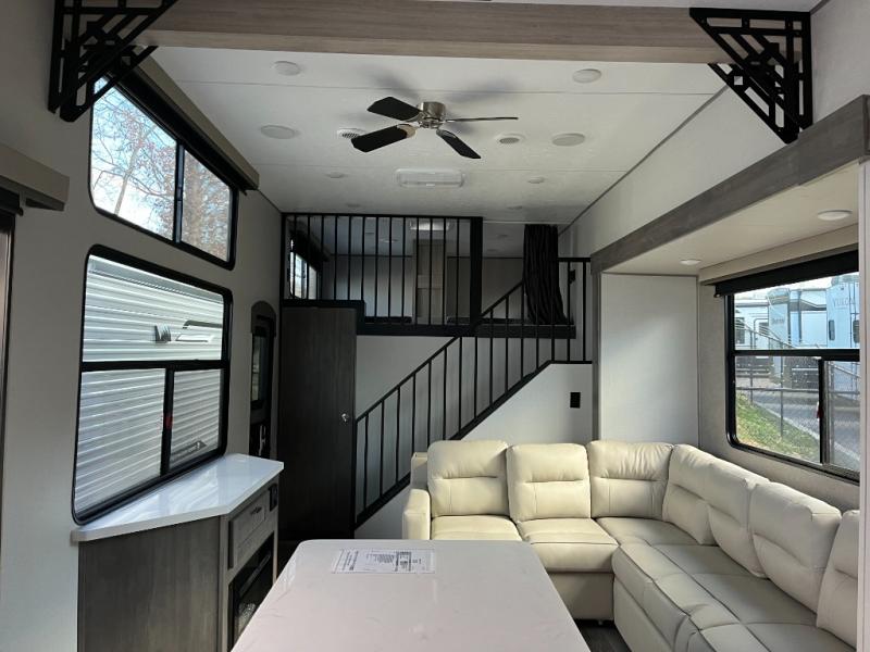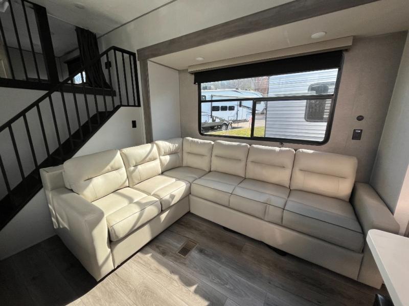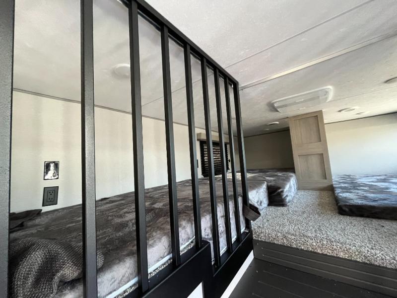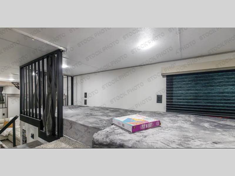 This unit with dual lofts and tons of sleeping space is ideal for a larger group! Lofts at either end of the unit overlook the living area and have a total of five bunk mats, with four 42" x 74" and one smaller 28" x 74". Downstairs there's a private bedroom with a queen bed and fireplace. The main living area has a huge hide-a-bed sectional sofa so you can fit even more guests, or just relax and watch the TV on the power lift in the entertainment center. The kitchen is well-equipped with a french door refrigerator, microwave, and pantry. The centerpiece here is a kitchen island with a deep basin farm-style sink and bar stool seating so your group can gather together and make new memories! The full bath in the rear has a roomy 48" x 30" shower with glass door, and a linen closet.