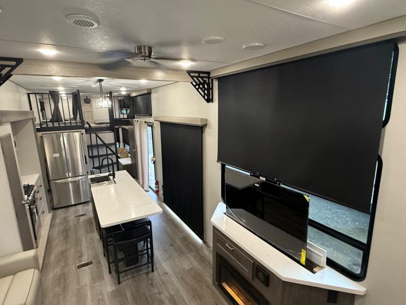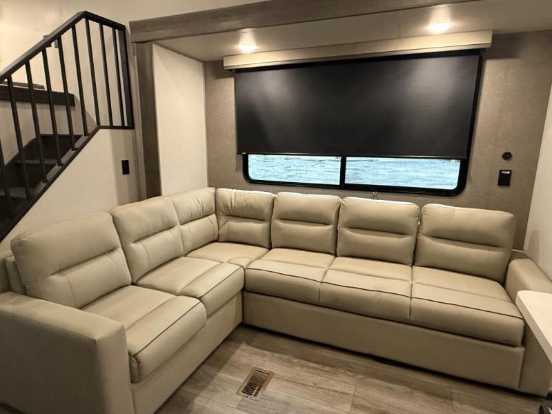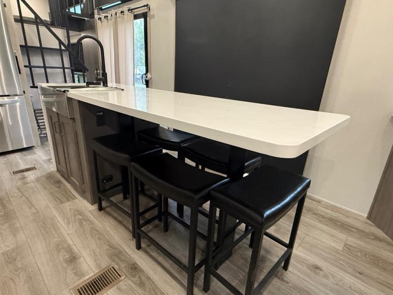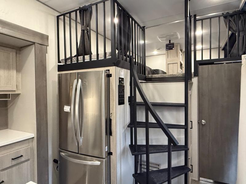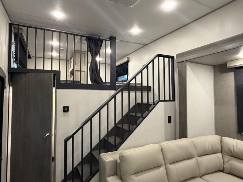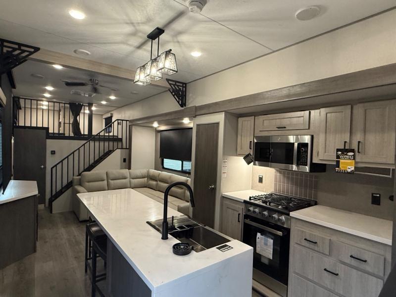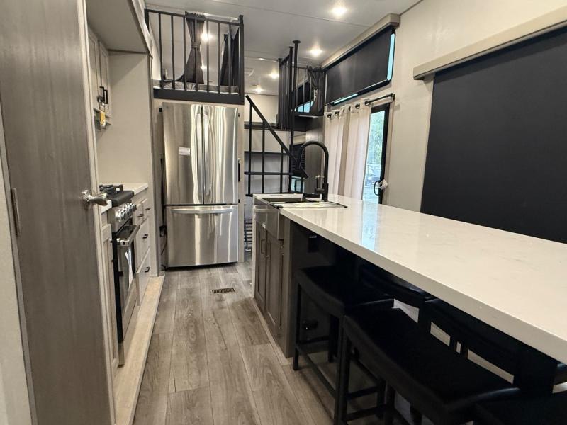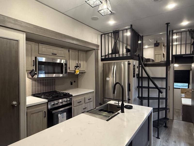 This unit with dual lofts and tons of sleeping space is ideal for a larger group! Lofts at either end of the unit overlook the living area and have a total of five bunk mats, with four 42" x 74" and one smaller 28" x 74". Downstairs there's a private bedroom with a queen bed and fireplace. The main living area has a huge hide-a-bed sectional sofa so you can fit even more guests, or just relax and watch the TV on the power lift in the entertainment center. The kitchen is well-equipped with a French door refrigerator, microwave, and pantry. The centerpiece here is a kitchen island with a deep basin farm-style sink and bar stool seating so your group can gather together and make new memories! The full bath in the rear has a roomy 48" x 30" shower with glass door, and a linen closet.