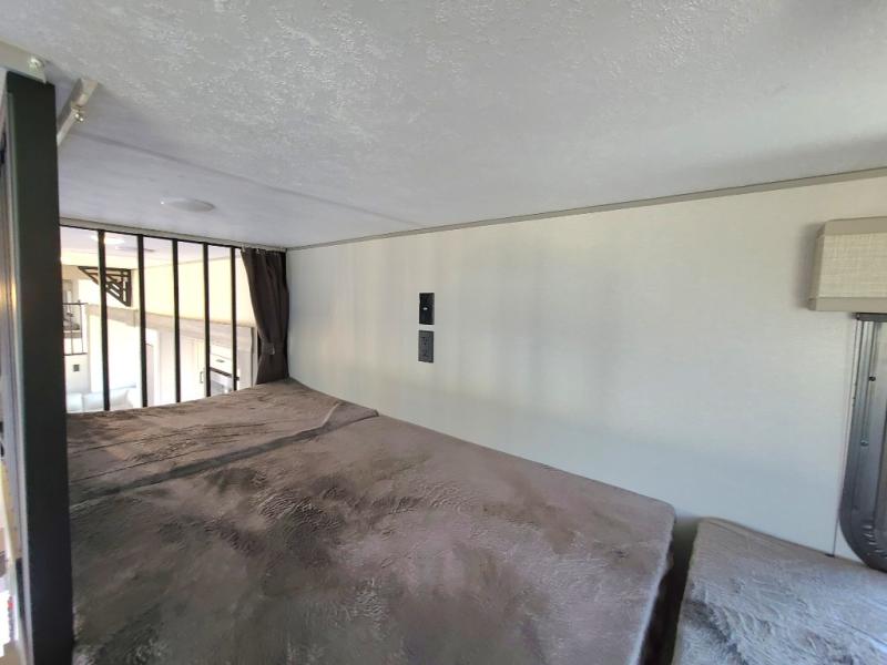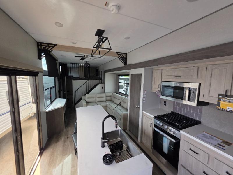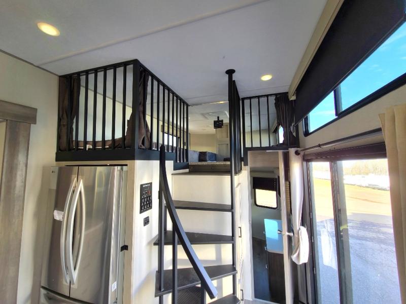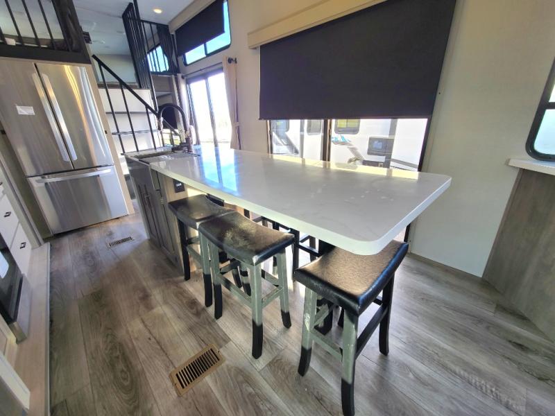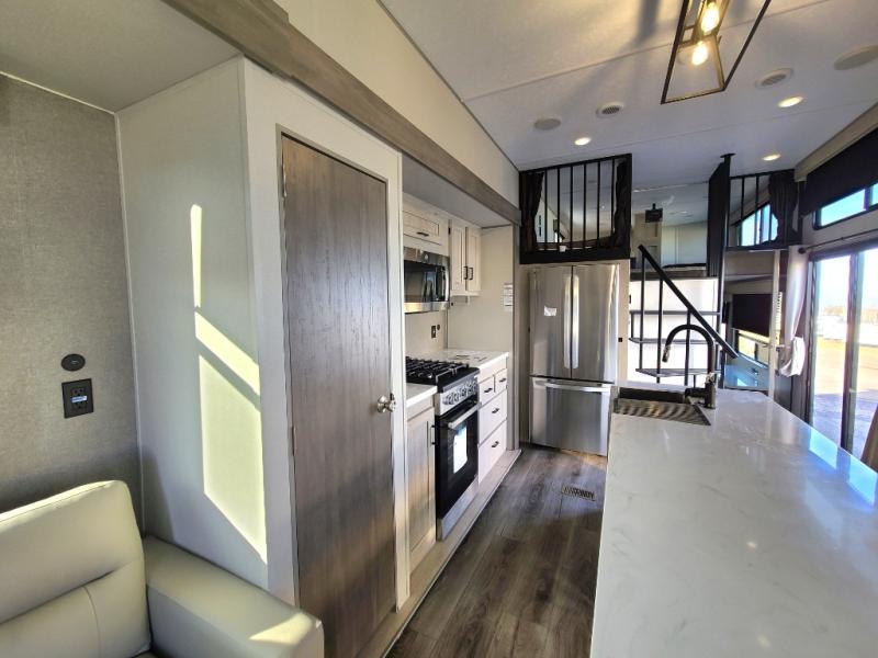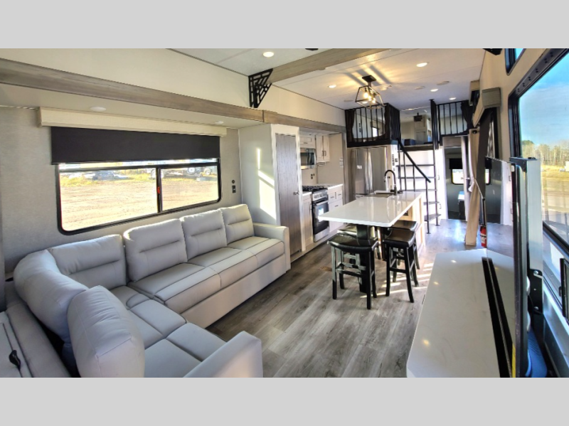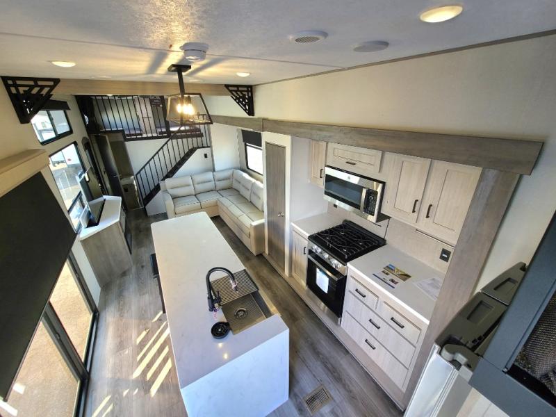This unit with dual lofts and tons of sleeping space is ideal for a larger group! Lofts at either end of the unit overlook the living area and have a total of five bunk mats, with four 42" x 74" and one smaller 28" x 74". Downstairs there's a private bedroom with a queen bed and fireplace. The main living area has a huge hide-a-bed sectional sofa so you can fit even more guests, or just relax and watch the TV on the power lift in the entertainment center. The kitchen is well-equipped with a french door refrigerator, microwave, and pantry. The centerpiece here is a kitchen island with a deep basin farm-style sink and bar stool seating so your group can gather together and make new memories! The full bath in the rear has a roomy 48" x 30" shower with glass door, and a linen closet.