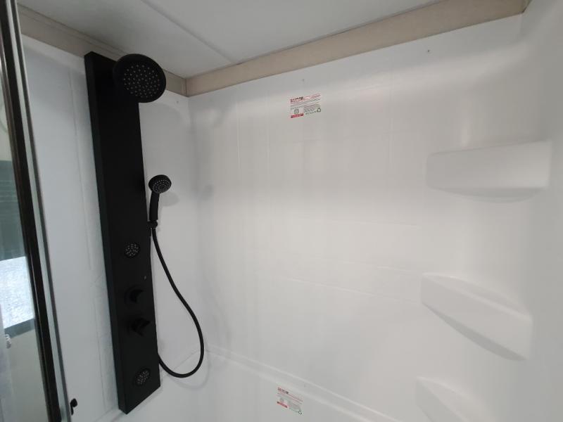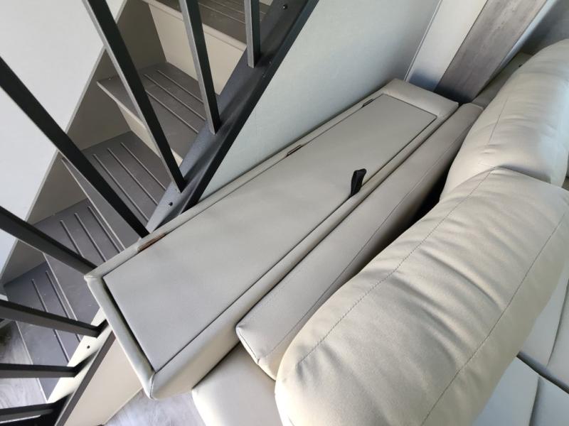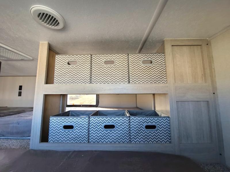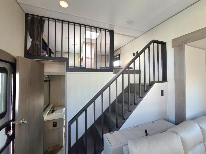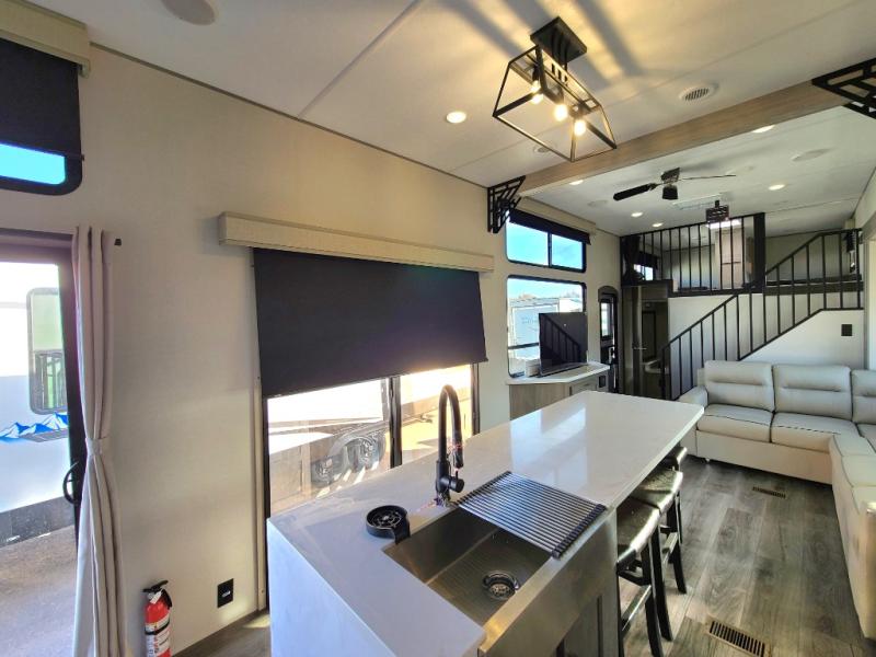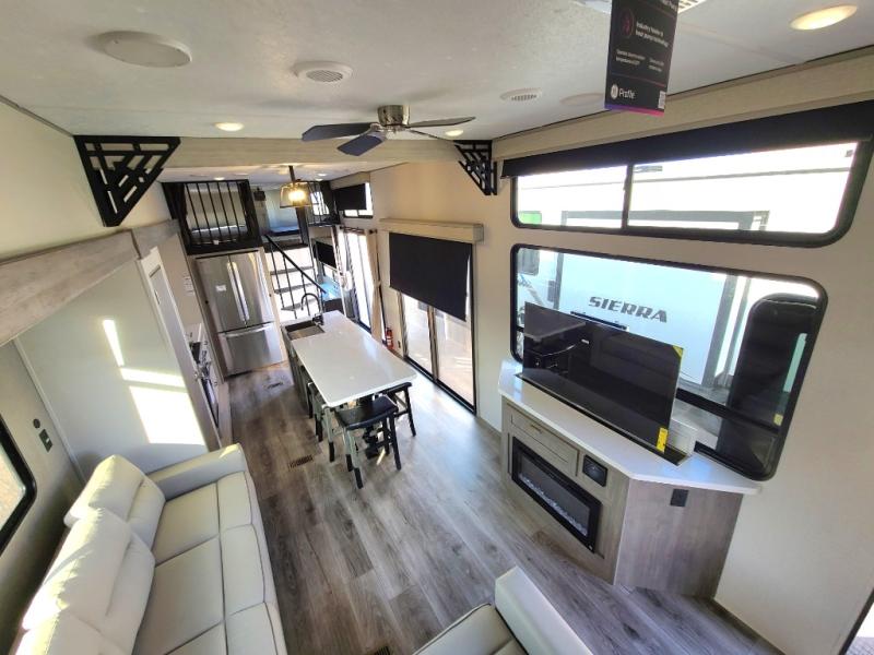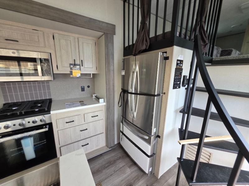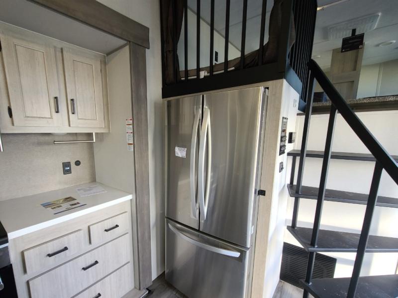 This unit with dual lofts and tons of sleeping space is ideal for a larger group! Lofts at either end of the unit overlook the living area and have a total of five bunk mats, with four 42" x 74" and one smaller 28" x 74". Downstairs there's a private bedroom with a queen bed and fireplace. The main living area has a huge hide-a-bed sectional sofa so you can fit even more guests, or just relax and watch the TV on the power lift in the entertainment center. The kitchen is well-equipped with a french door refrigerator, microwave, and pantry. The centerpiece here is a kitchen island with a deep basin farm-style sink and bar stool seating so your group can gather together and make new memories! The full bath in the rear has a roomy 48" x 30" shower with glass door, and a linen closet.