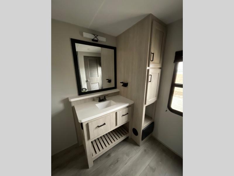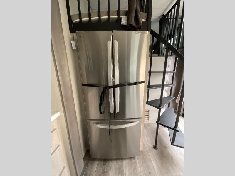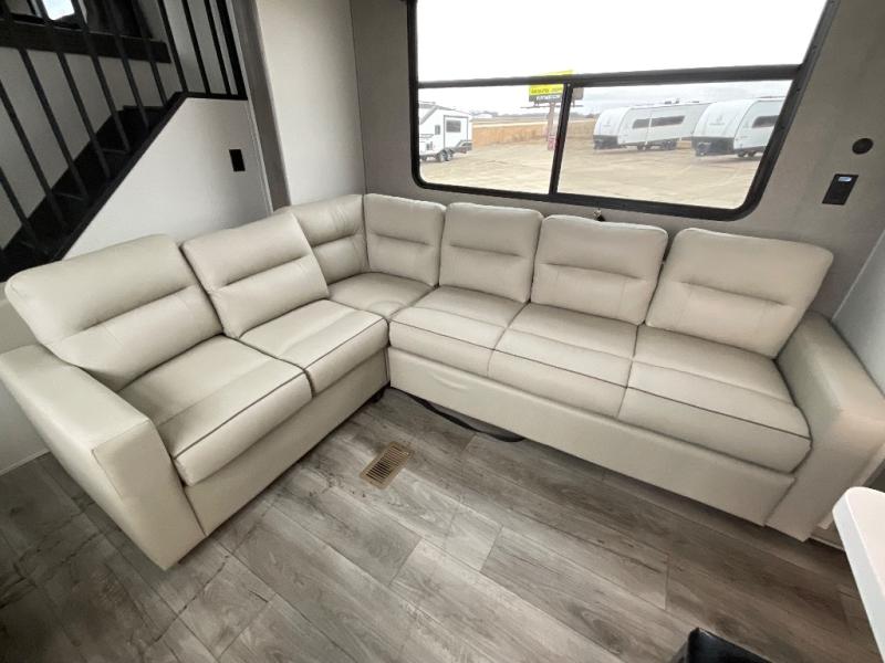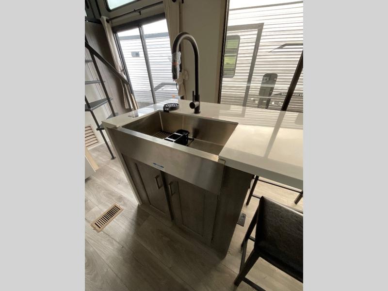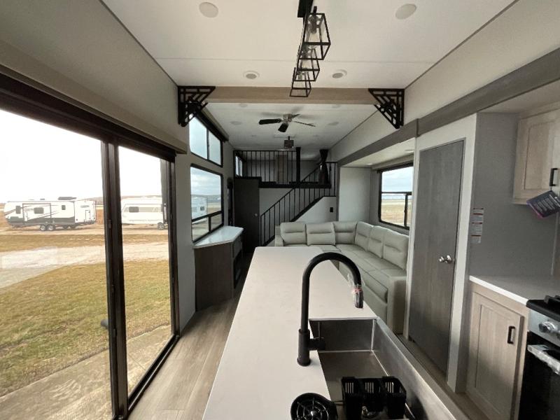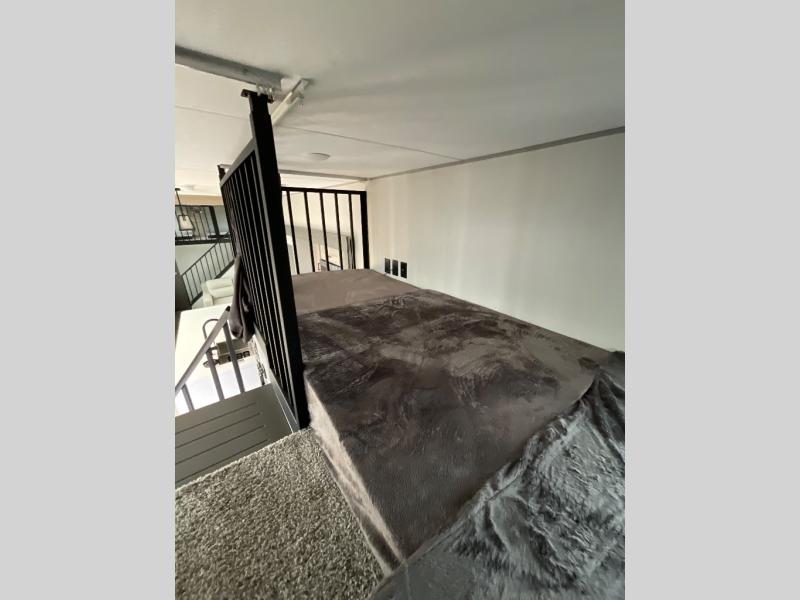 This unit with dual lofts and tons of sleeping space is ideal for a larger group! Lofts at either end of the unit overlook the living area and have a total of five bunk mats, with four 42" x 74" and one smaller 28" x 74". Downstairs there's a private bedroom with a queen bed and fireplace. The main living area has a huge hide-a-bed sectional sofa so you can fit even more guests, or just relax and watch the TV on the power lift in the entertainment center. The kitchen is well-equipped with a french door refrigerator, microwave, and pantry. The centerpiece here is a kitchen island with a deep basin farm-style sink and bar stool seating so your group can gather together and make new memories! The full bath in the rear has a roomy 48" x 30" shower with glass door, and a linen closet.