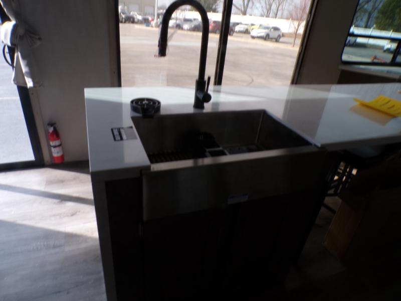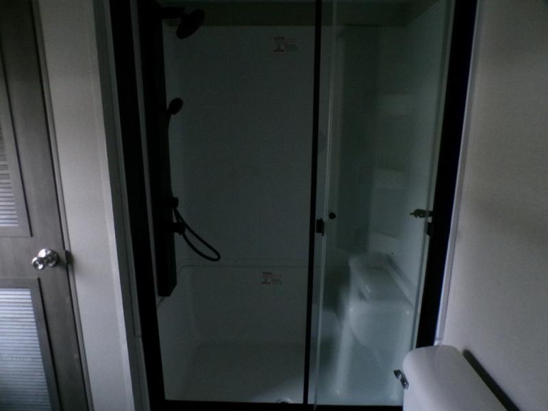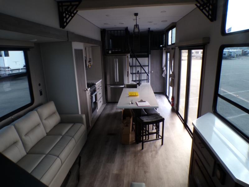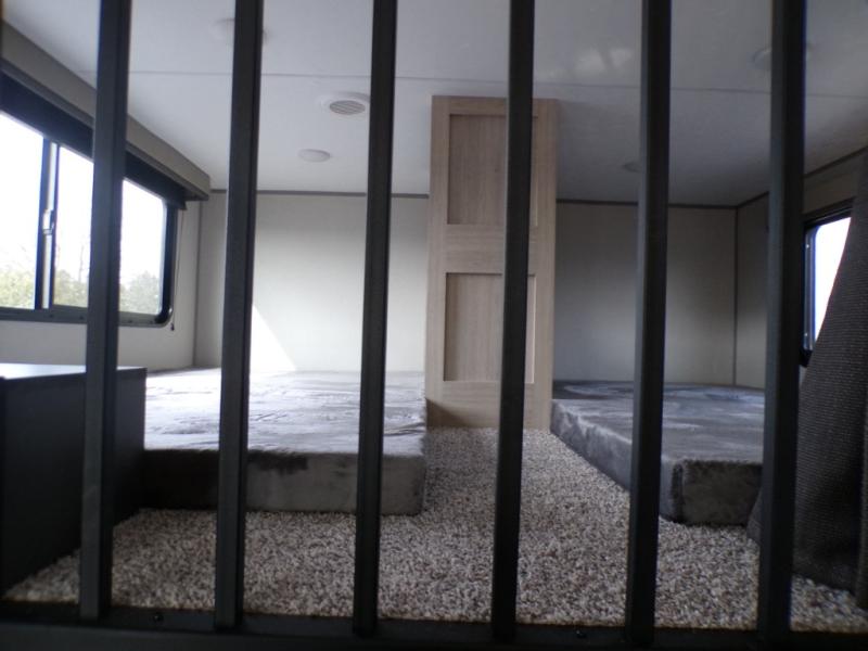 This unit with dual lofts and tons of sleeping space is ideal for a larger group! Lofts at either end of the unit overlook the living area and have a total of five bunk mats, with four 42" x 74" and one smaller 28" x 74". Downstairs there's a private bedroom with a queen bed and fireplace. The main living area has a huge hide-a-bed sectional sofa so you can fit even more guests, or just relax and watch the TV on the power lift in the entertainment center. The kitchen is well-equipped with a french door refrigerator, microwave, and pantry. The centerpiece here is a kitchen island with a deep basin farm-style sink and bar stool seating so your group can gather together and make new memories! The full bath in the rear has a roomy 48" x 30" shower with glass door, and a linen closet.