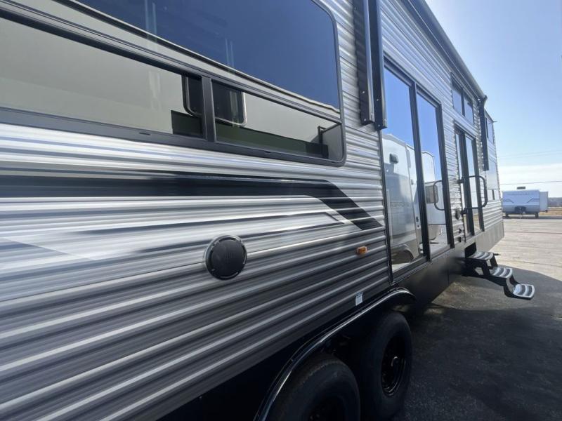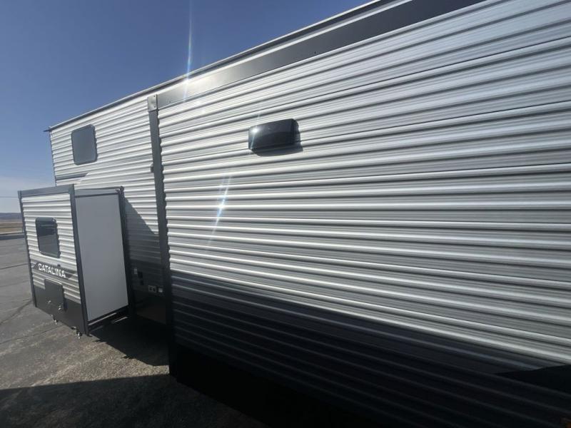 With any Catalina Destination trailer by Coachmen, you will enjoy comfortable extended stays wherever you decide to set up camp! The full length frame outriggers add strength to each unit, along with a seamless Alpha Roof membrane and Norco electromagnetic, powder coated chassis. You will love the open views provided by the residential-style sliding glass patio door, plus there are GE appliances, woodplank linoleum flooring, and hard valance window treatments to make your space feel more like home. Head outside to find a convenient "Leash Link" quick hookup D-ring for your furry friends, premium JBL exterior speakers, flush mount baggage doors for your gear, and the list of amenities goes on!