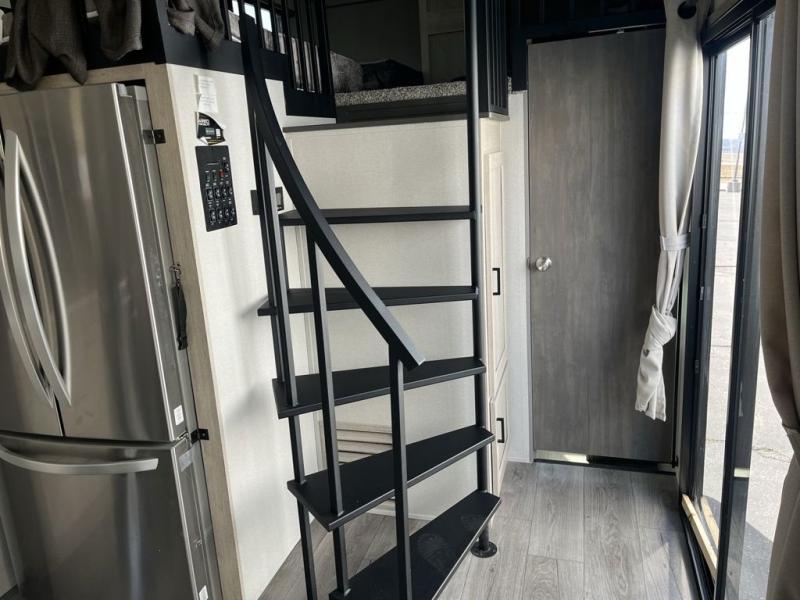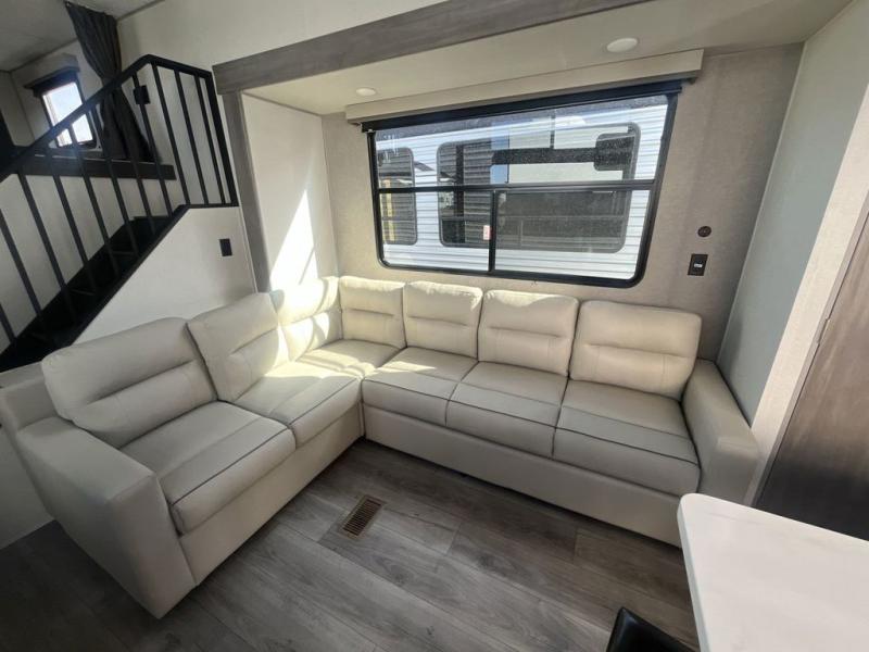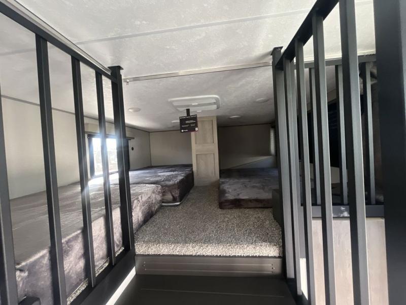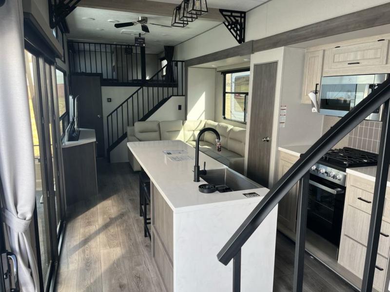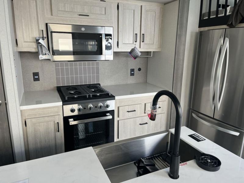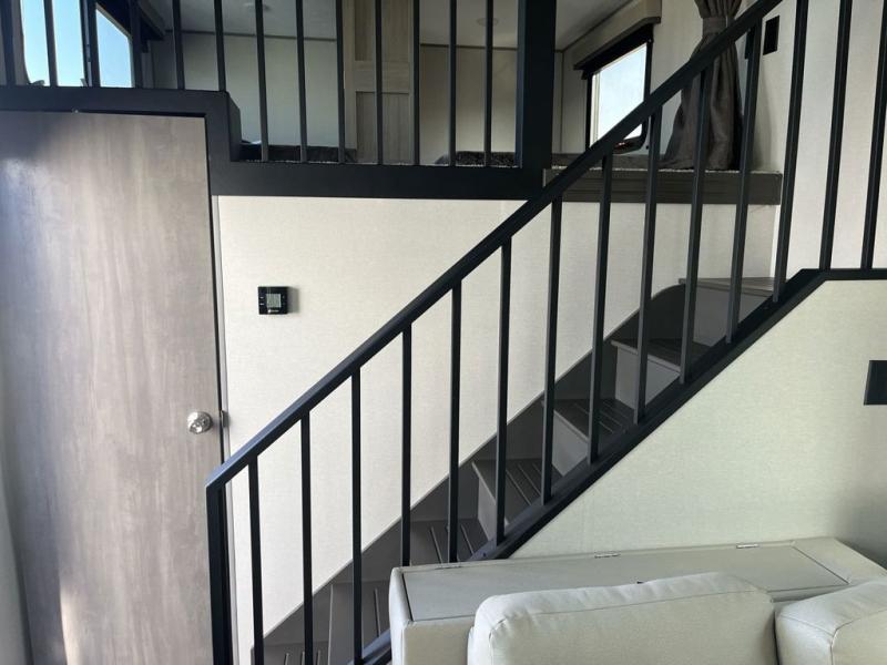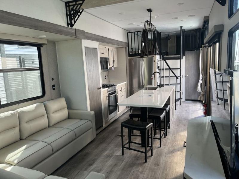 This unit with dual lofts and tons of sleeping space is ideal for a larger group! Lofts at either end of the unit overlook the living area and have a total of five bunk mats, with four 42" x 74" and one smaller 28" x 74". Downstairs there's a private bedroom with a queen bed and fireplace. The main living area has a huge hide-a-bed sectional sofa so you can fit even more guests, or just relax and watch the TV on the power lift in the entertainment center. The kitchen is well-equipped with a french door refrigerator, microwave, and pantry. The centerpiece here is a kitchen island with a deep basin farm-style sink and bar stool seating so your group can gather together and make new memories! The full bath in the rear has a roomy 48" x 30" shower with glass door, and a linen closet.