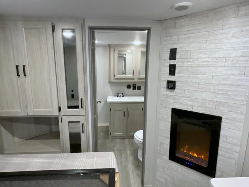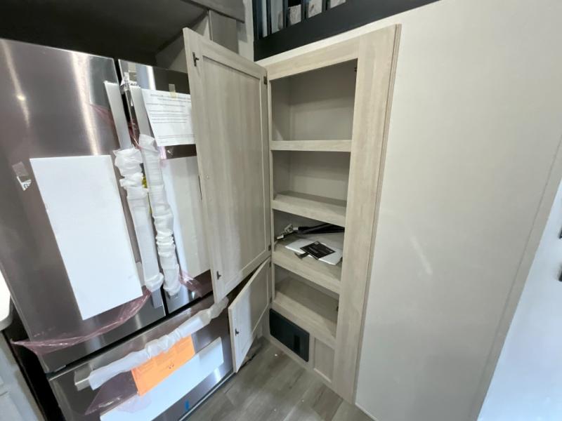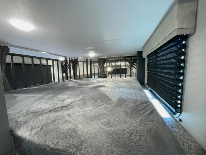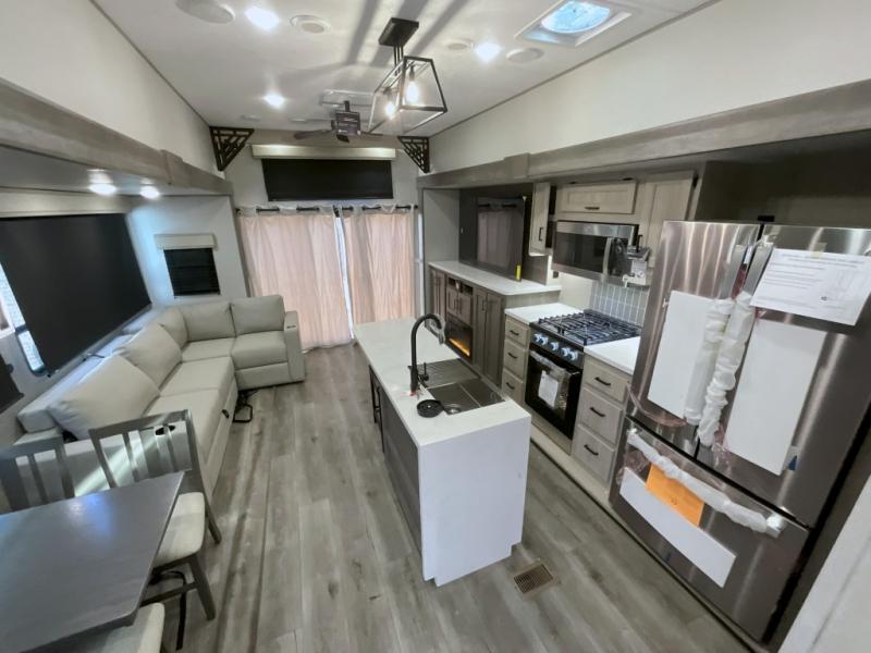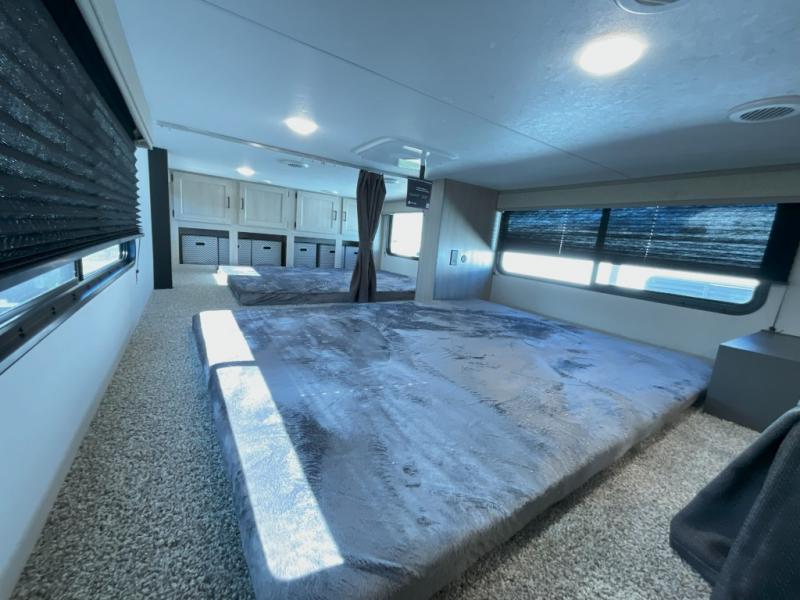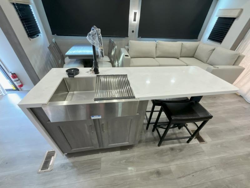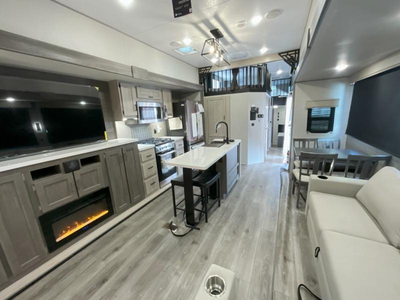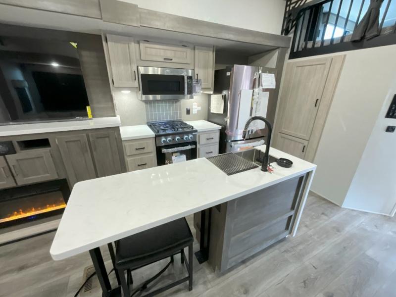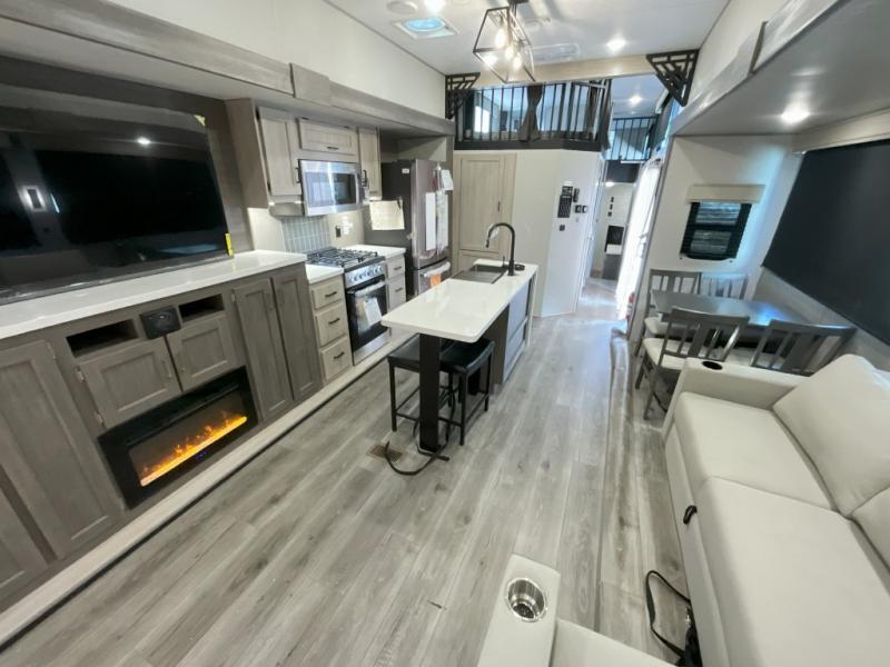 There is much to love about this destination trailer! Starting with the loft that has two queen beds, a wardrobe/storage, and a custom 58" x 71" bed. Downstairs there's a private bedroom with a king bed slide, a fireplace, and its very own private full bathroom complete with a dual sink vanity. The main living area has a huge bi-fold sleeper sectional sofa so you can fit even more guests, or just relax and watch the TV on the power lift in the entertainment center. The kitchen is well-equipped with a residential refrigerator, microwave, and pantry. The centerpiece here is a kitchen island with a deep basin farm-style sink and bar stool seating so your group can gather together and make new memories. The second full bath has a roomy 36" x 30" shower with glass door, and just outside it is the stackable washer and dryer!