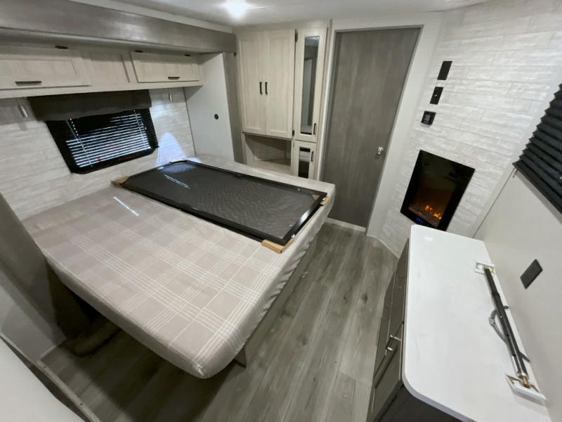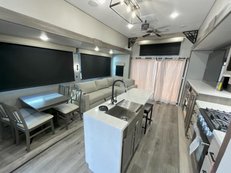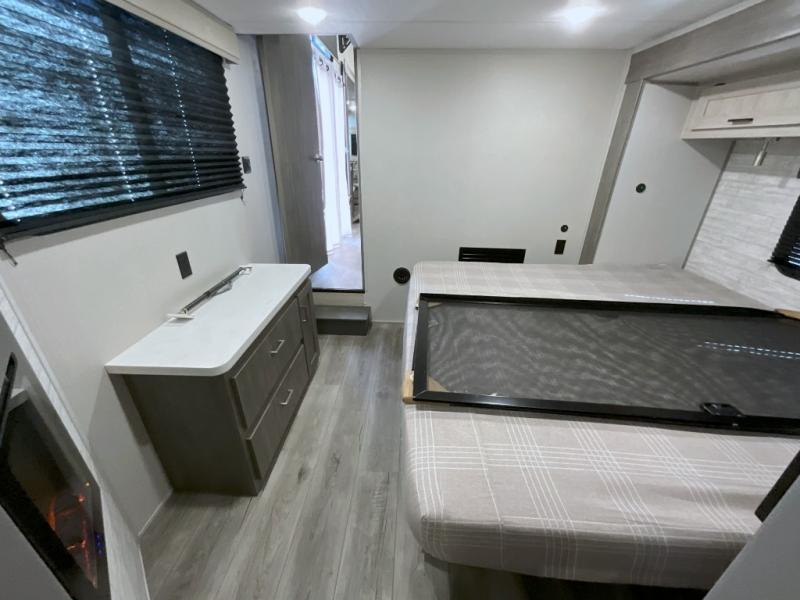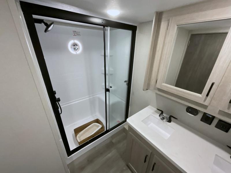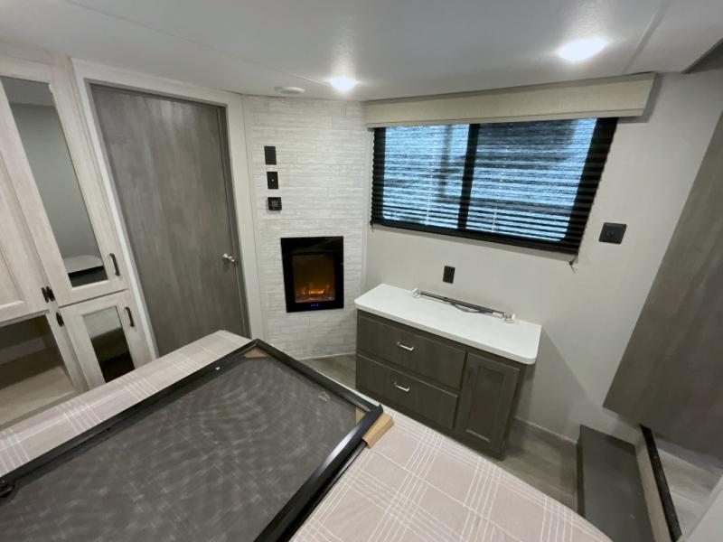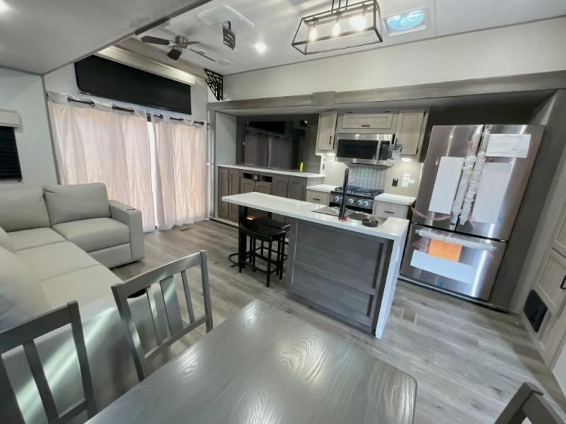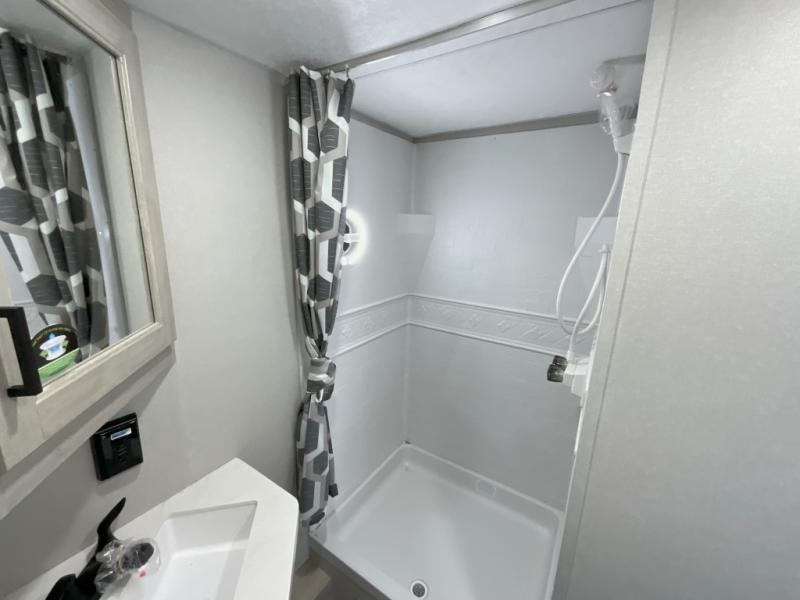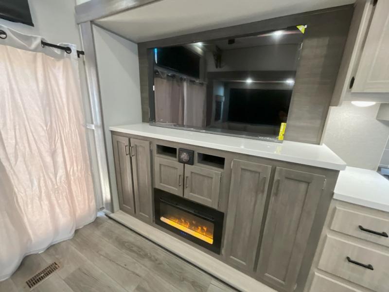 There is much to love about this destination trailer! Starting with the loft that has two queen beds, a wardrobe/storage, and a custom 58" x 71" bed. Downstairs there's a private bedroom with a king bed slide, a fireplace, and its very own private full bathroom complete with a dual sink vanity. The main living area has a huge bi-fold sleeper sectional sofa so you can fit even more guests, or just relax and watch the TV on the power lift in the entertainment center. The kitchen is well-equipped with a residential refrigerator, microwave, and pantry. The centerpiece here is a kitchen island with a deep basin farm-style sink and bar stool seating so your group can gather together and make new memories. The second full bath has a roomy 36" x 30" shower with glass door, and just outside it is the stackable washer and dryer!