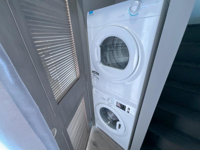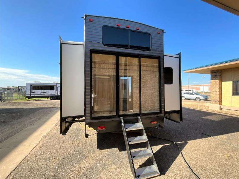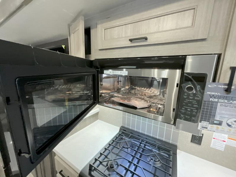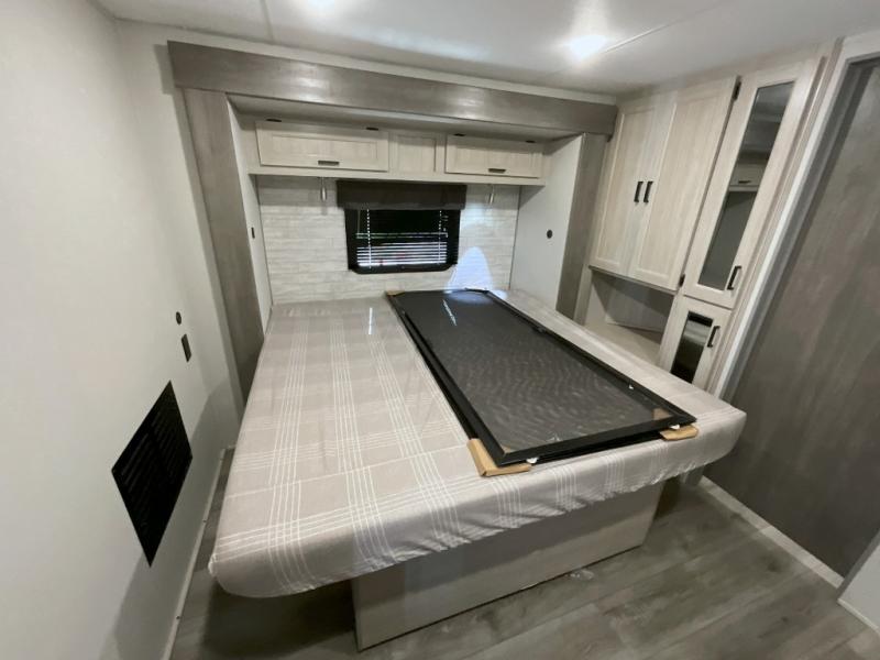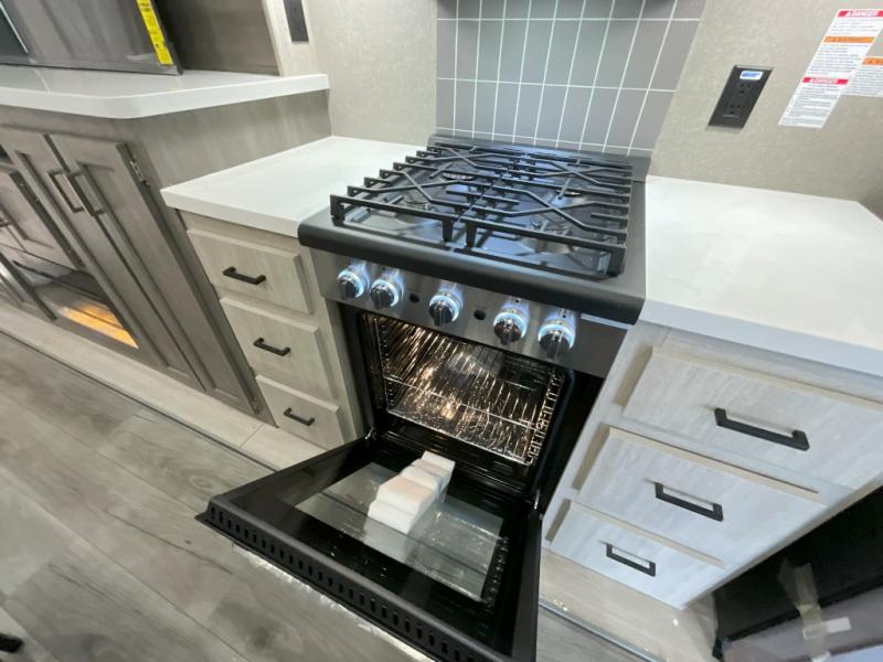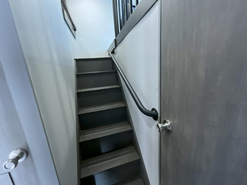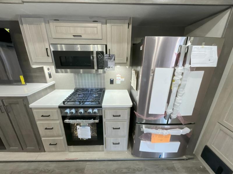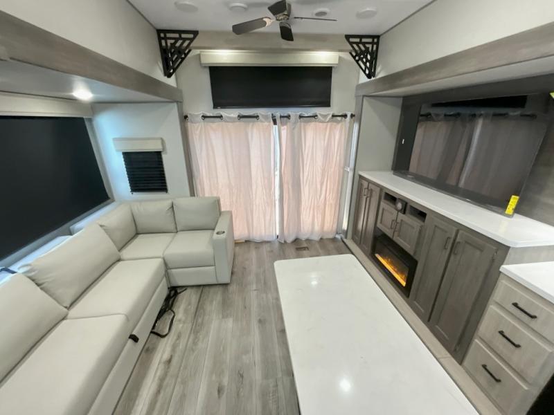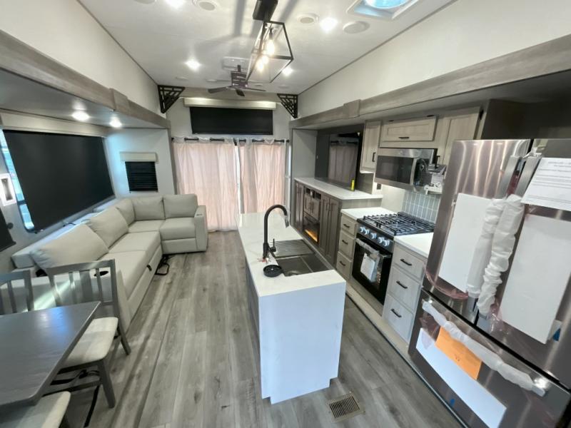 There is much to love about this destination trailer! Starting with the loft that has two queen beds, a wardrobe/storage, and a custom 58" x 71" bed. Downstairs there's a private bedroom with a king bed slide, a fireplace, and its very own private full bathroom complete with a dual sink vanity. The main living area has a huge bi-fold sleeper sectional sofa so you can fit even more guests, or just relax and watch the TV on the power lift in the entertainment center. The kitchen is well-equipped with a residential refrigerator, microwave, and pantry. The centerpiece here is a kitchen island with a deep basin farm-style sink and bar stool seating so your group can gather together and make new memories. The second full bath has a roomy 36" x 30" shower with glass door, and just outside it is the stackable washer and dryer!