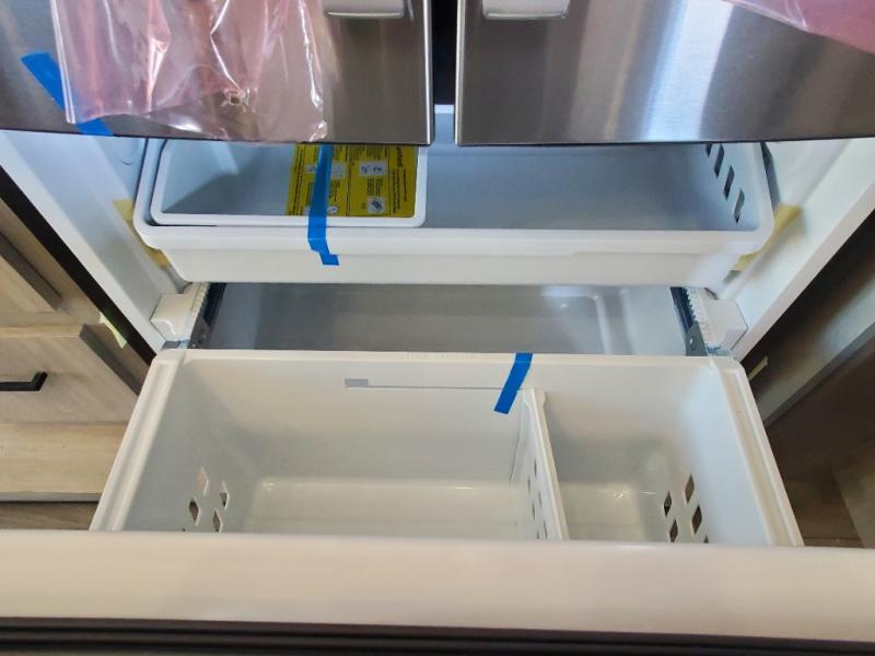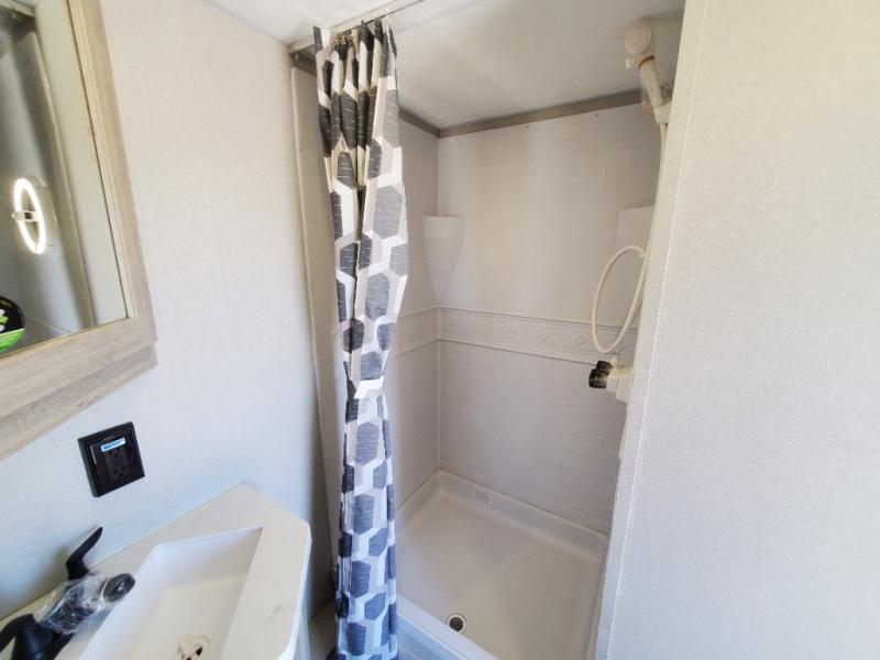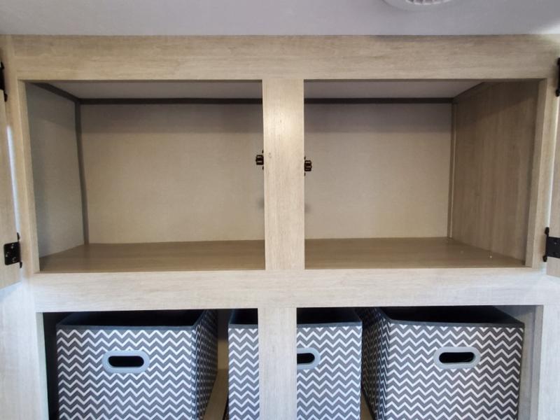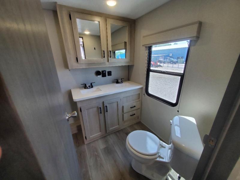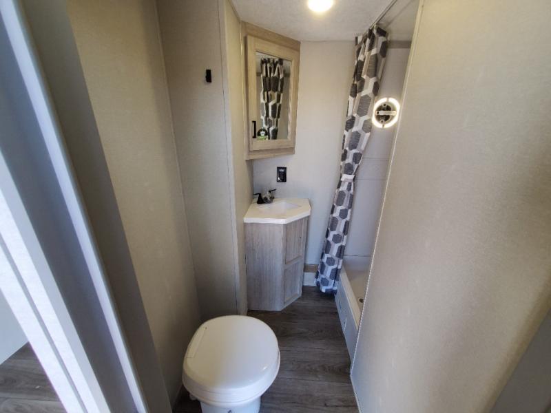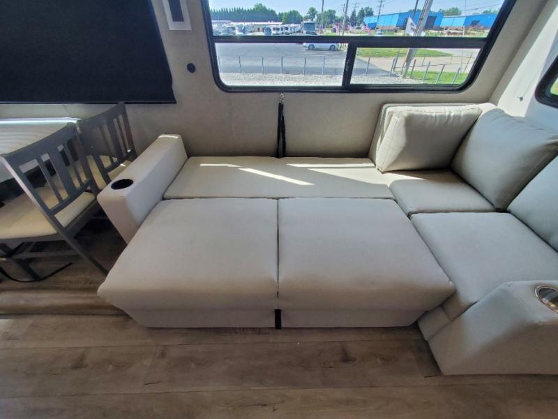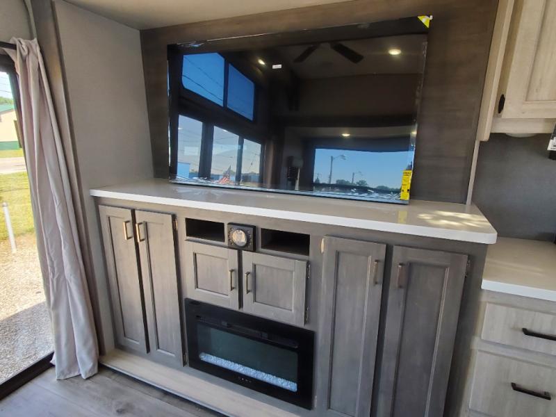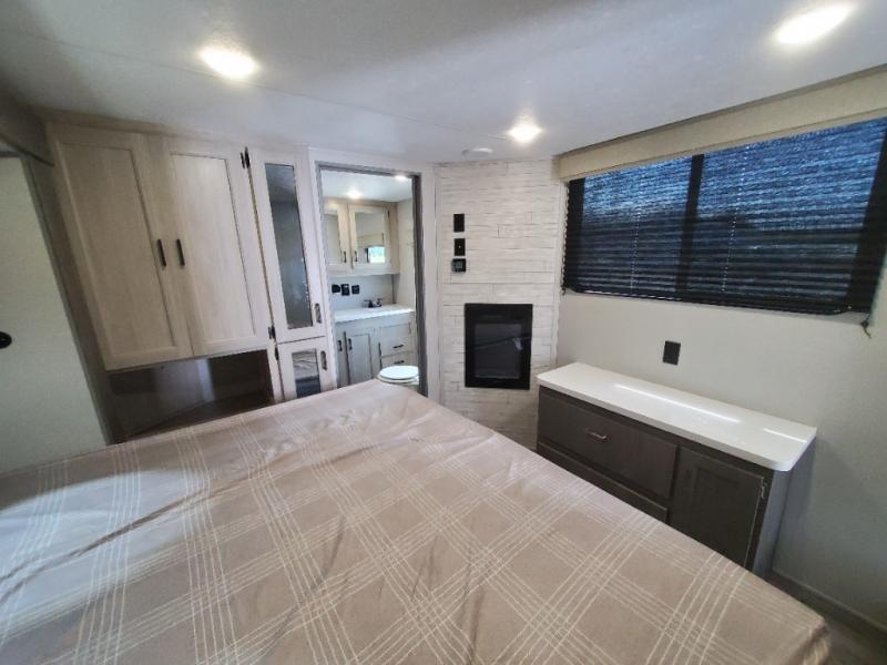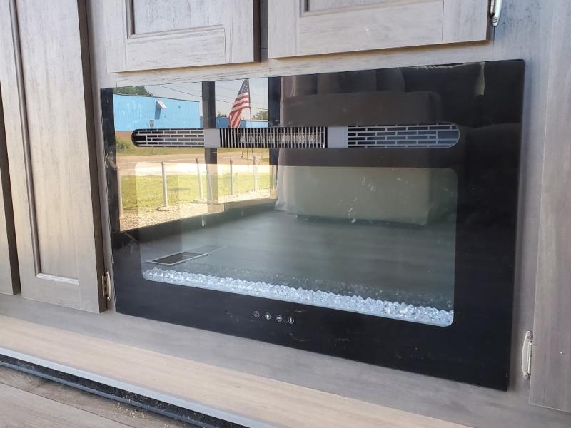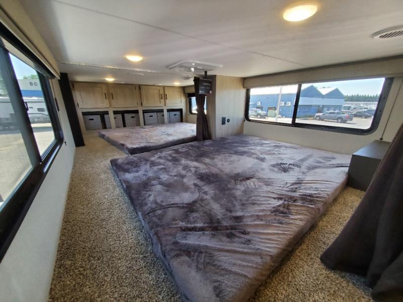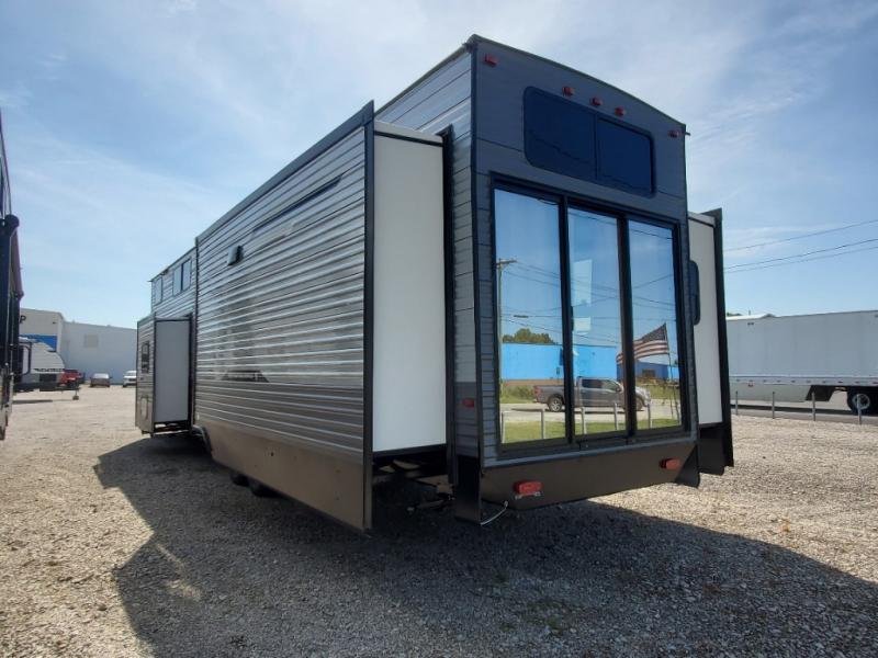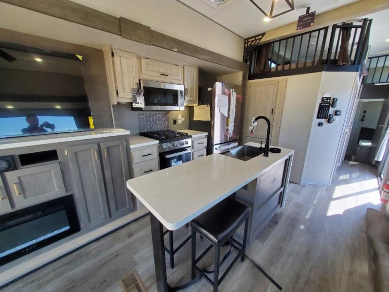 There is much to love about this destination trailer! Starting with the loft that has two queen beds, a wardrobe/storage, and a custom 58" x 71" bed. Downstairs there's a private bedroom with a king bed slide, a fireplace, and its very own private full bathroom complete with a dual sink vanity. The main living area has a huge bi-fold sleeper sectional sofa so you can fit even more guests, or just relax and watch the TV on the power lift in the entertainment center. The kitchen is well-equipped with a residential refrigerator, microwave, and pantry. The centerpiece here is a kitchen island with a deep basin farm-style sink and bar stool seating so your group can gather together and make new memories. The second full bath has a roomy 36" x 30" shower with glass door, and just outside it is the stackable washer and dryer!
