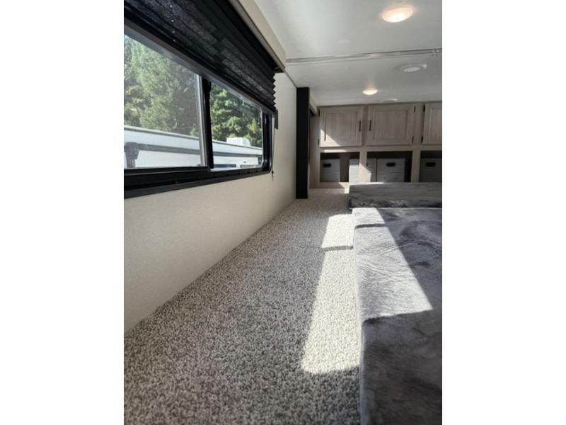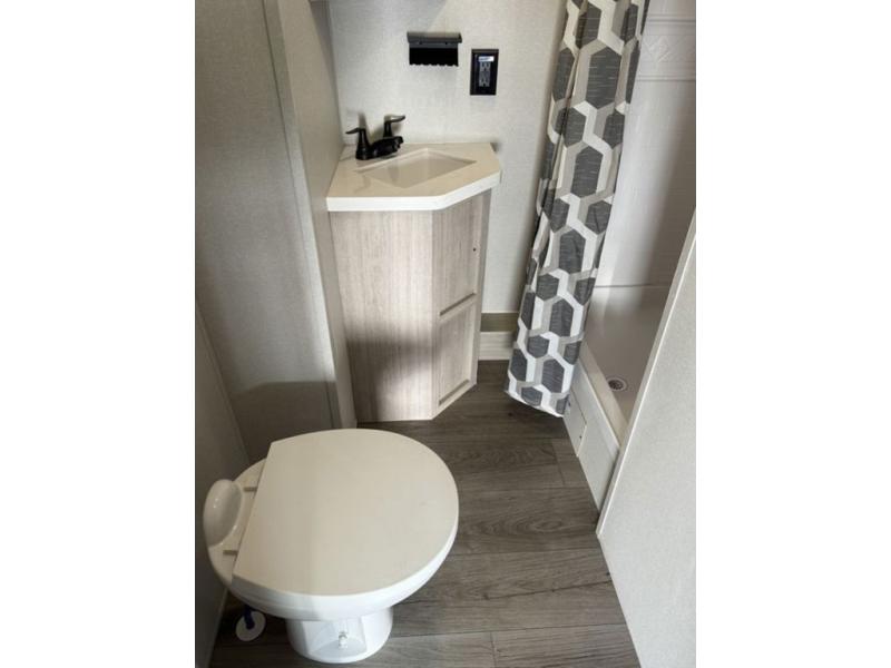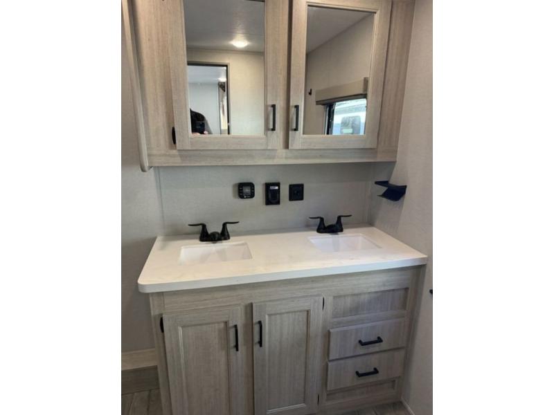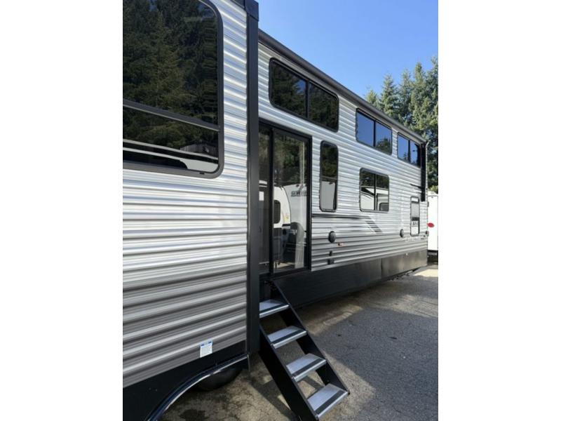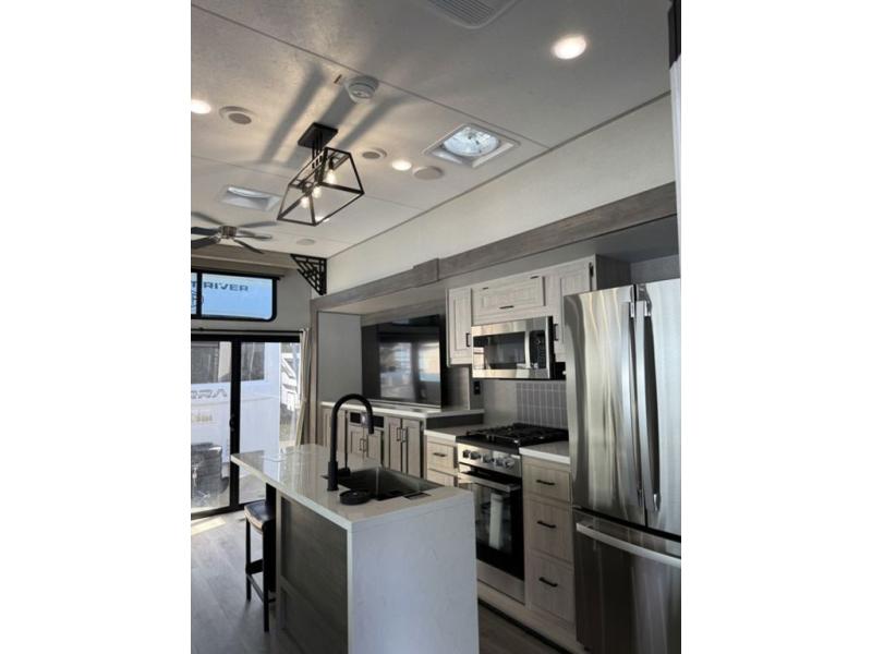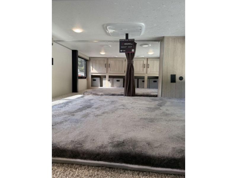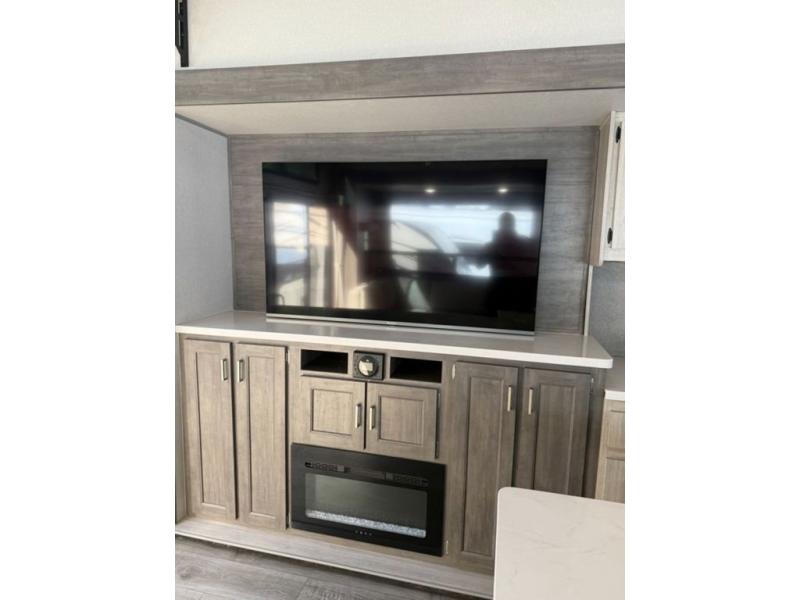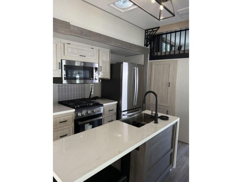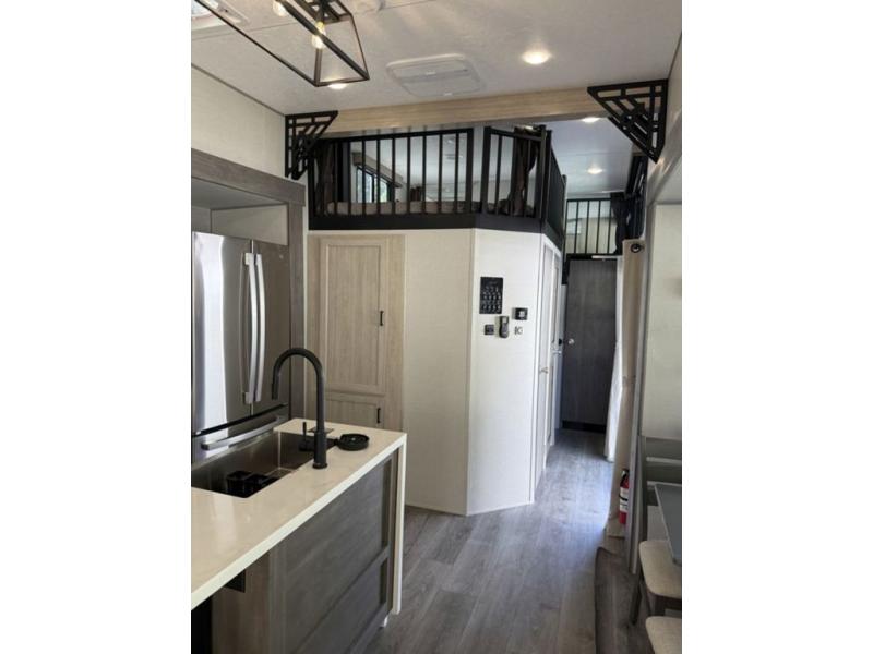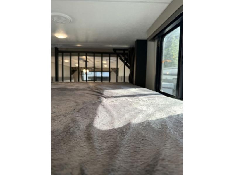 There is much to love about this destination trailer! Starting with the loft that has two queen beds, a wardrobe/storage, and a custom 58" x 71" bed. Downstairs there's a private bedroom with a king bed slide, a fireplace, and its very own private full bathroom complete with a dual sink vanity. The main living area has a huge bi-fold sleeper sectional sofa so you can fit even more guests, or just relax and watch the TV on the power lift in the entertainment center. The kitchen is well-equipped with a residential refrigerator, microwave, and pantry. The centerpiece here is a kitchen island with a deep basin farm-style sink and bar stool seating so your group can gather together and make new memories. The second full bath has a roomy 36" x 30" shower with glass door, and just outside it is the stackable washer and dryer!