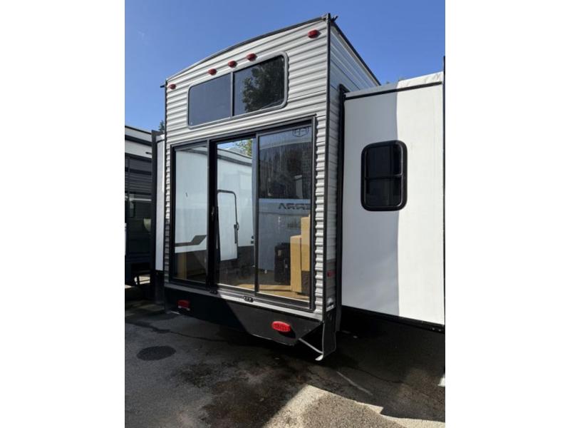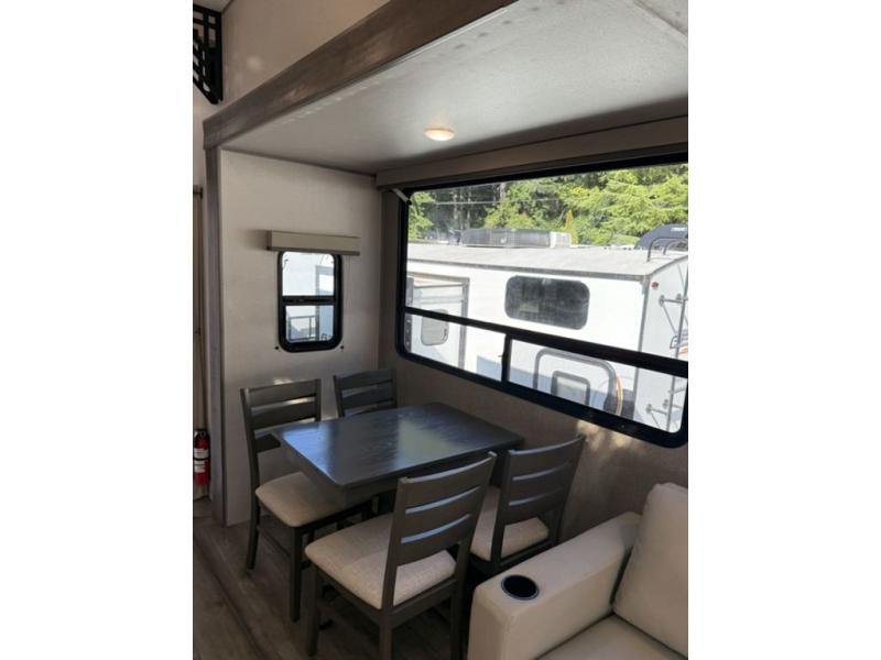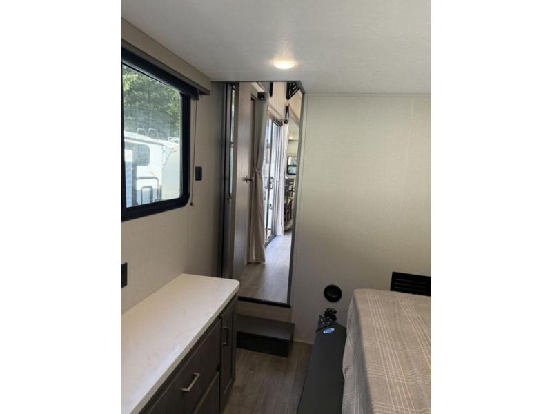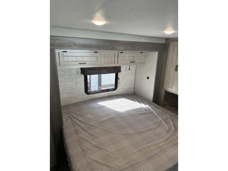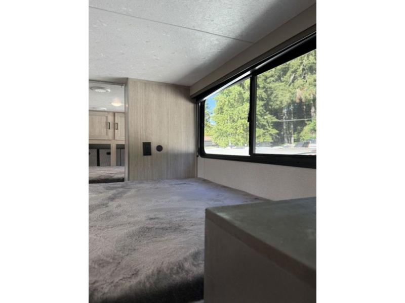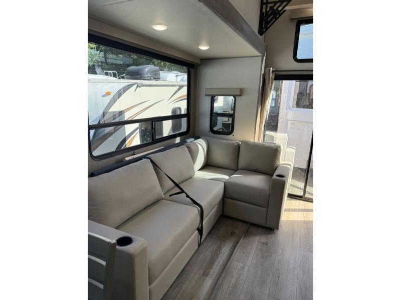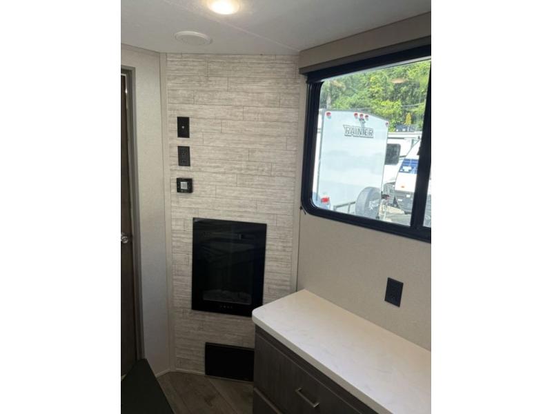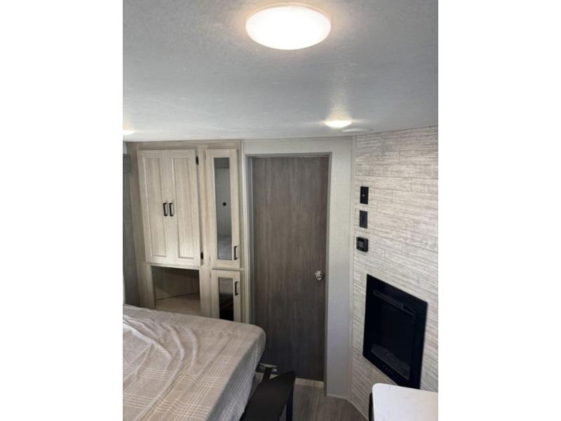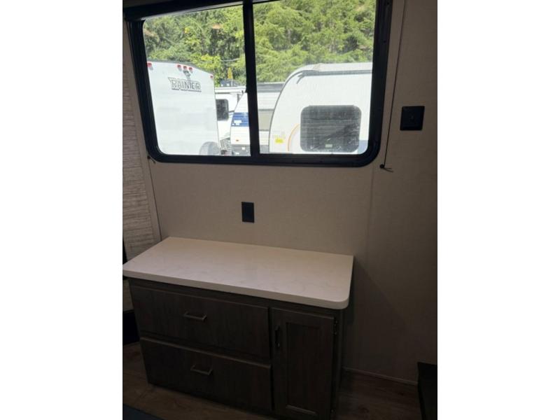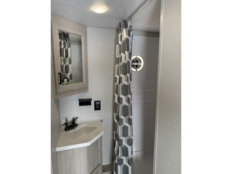 There is much to love about this destination trailer! Starting with the loft that has two queen beds, a wardrobe/storage, and a custom 58" x 71" bed. Downstairs there's a private bedroom with a king bed slide, a fireplace, and its very own private full bathroom complete with a dual sink vanity. The main living area has a huge bi-fold sleeper sectional sofa so you can fit even more guests, or just relax and watch the TV on the power lift in the entertainment center. The kitchen is well-equipped with a residential refrigerator, microwave, and pantry. The centerpiece here is a kitchen island with a deep basin farm-style sink and bar stool seating so your group can gather together and make new memories. The second full bath has a roomy 36" x 30" shower with glass door, and just outside it is the stackable washer and dryer!