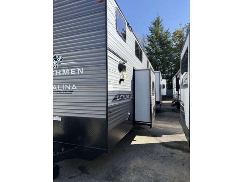 With any Catalina Destination trailer by Coachmen, you will enjoy comfortable extended stays wherever you decide to set up camp! The full length frame outriggers add strength to each unit, along with a seamless Alpha Roof membrane and Norco electromagnetic, powder coated chassis. You will love the open views provided by the large front bay windows, plus there are GE appliances, woodplank linoleum flooring, and hard valance window treatments to make your space feel more like home. Head outside to find a convenient "Leash Link" quick hookup D-ring for your furry friends, premium JBL exterior speakers, flush mount baggage doors for your gear, and the list of amenities goes on!