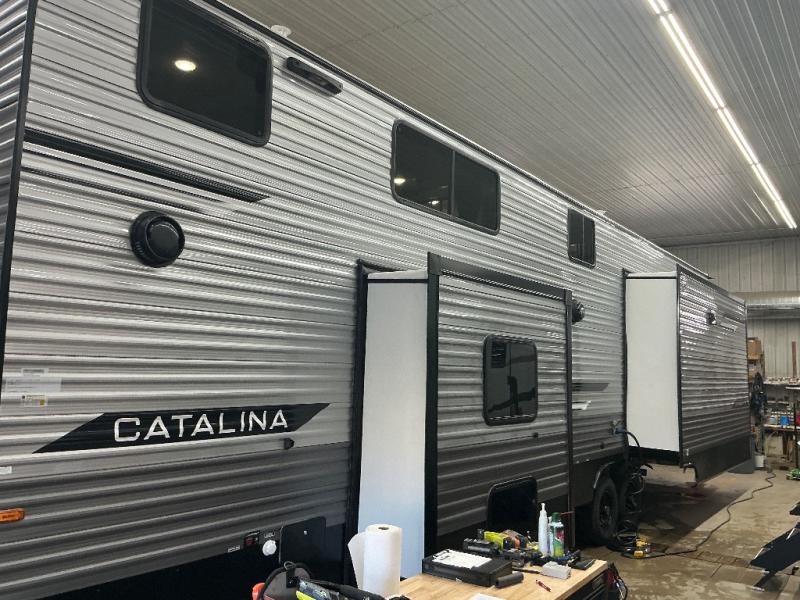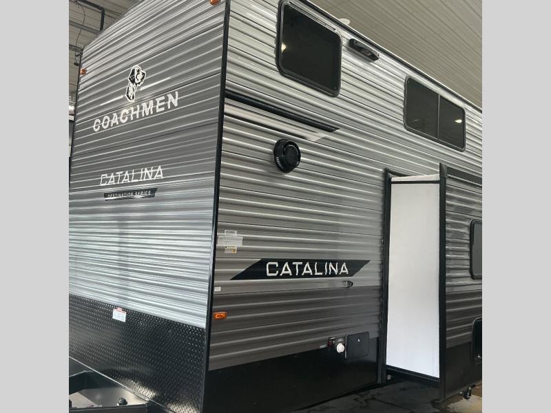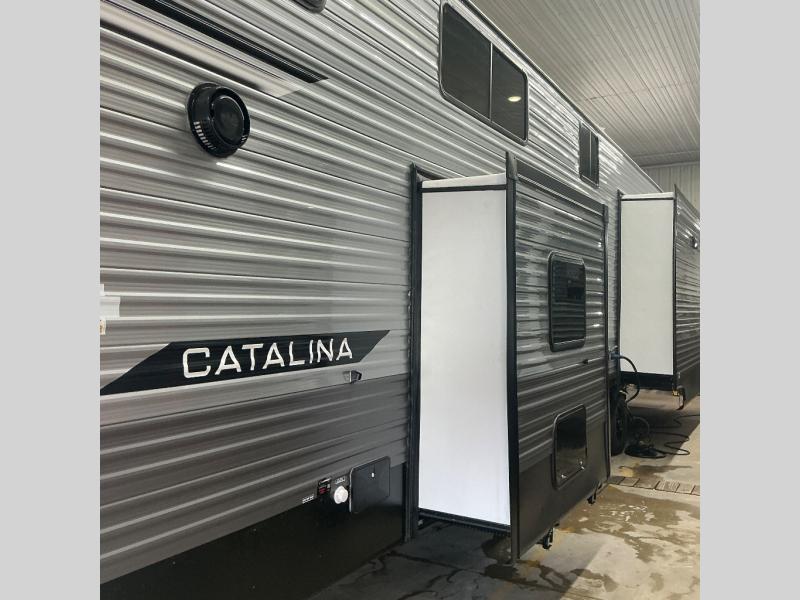 With any Catalina Destination trailer by Coachmen, you will enjoy comfortable extended stays wherever you decide to set up camp! The full length frame outriggers add strength to each unit, along with a seamless Alpha Roof membrane and Norco electromagnetic, powder coated chassis. You will love the open views provided by the large front bay windows, plus there are GE appliances, woodplank linoleum flooring, and hard valance window treatments to make your space feel more like home. Head outside to find a convenient "Leash Link" quick hookup D-ring for your furry friends, premium JBL exterior speakers, flush mount baggage doors for your gear, and the list of amenities goes on!