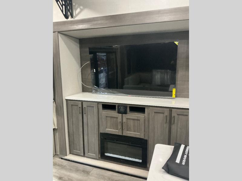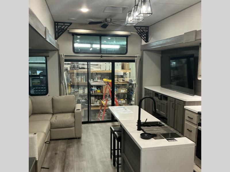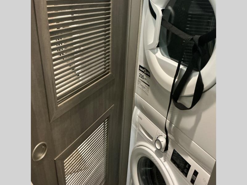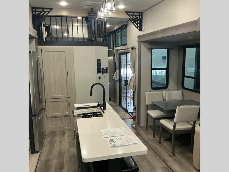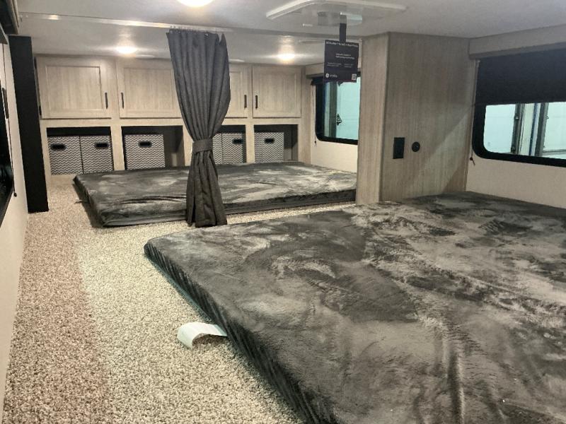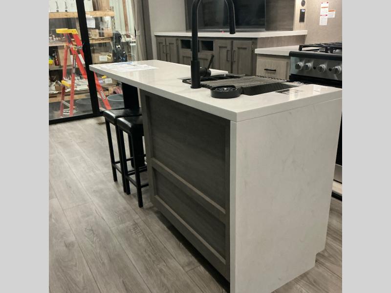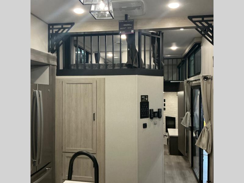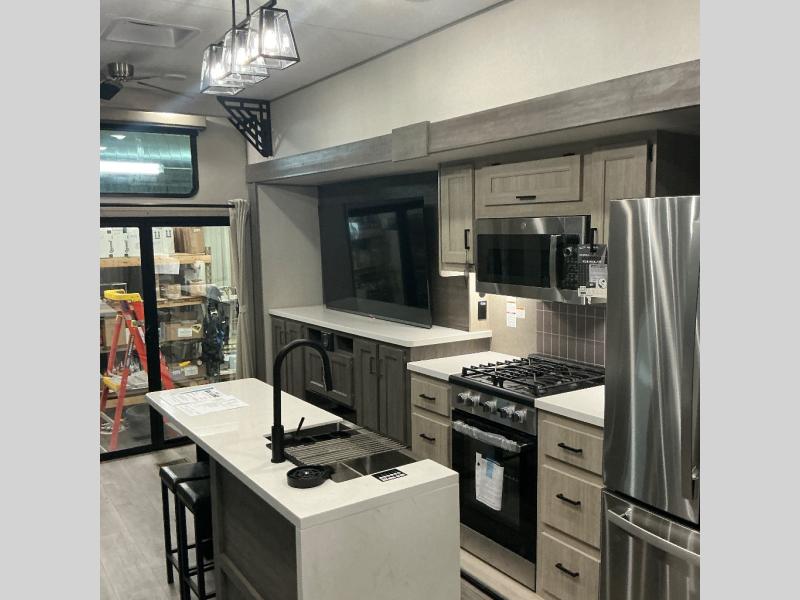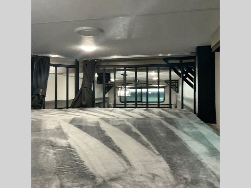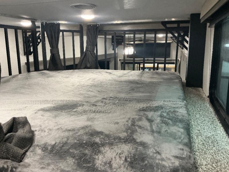 There is much to love about this destination trailer! Starting with the loft that has two queen beds, a wardrobe/storage, and a custom 58" x 71" bed. Downstairs there's a private bedroom with a king bed slide, a fireplace, and its very own private full bathroom complete with a dual sink vanity. The main living area has a huge bi-fold sleeper sectional sofa so you can fit even more guests, or just relax and watch the TV on the power lift in the entertainment center. The kitchen is well-equipped with a residential refrigerator, microwave, and pantry. The centerpiece here is a kitchen island with a deep basin farm-style sink and bar stool seating so your group can gather together and make new memories. The second full bath has a roomy 36" x 30" shower with glass door, and just outside it is the stackable washer and dryer!