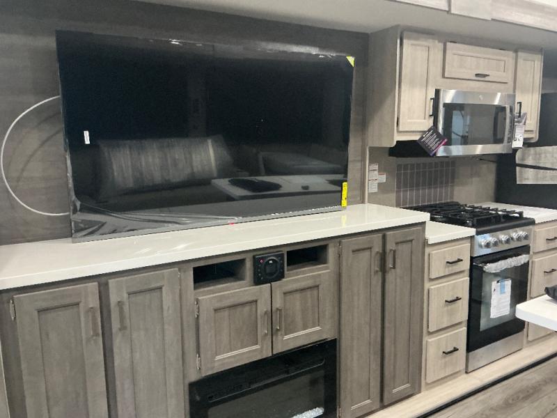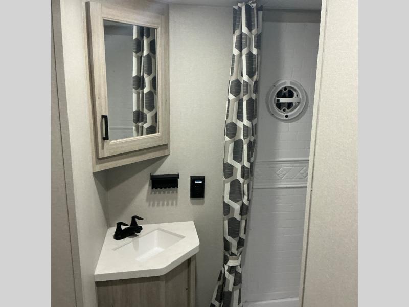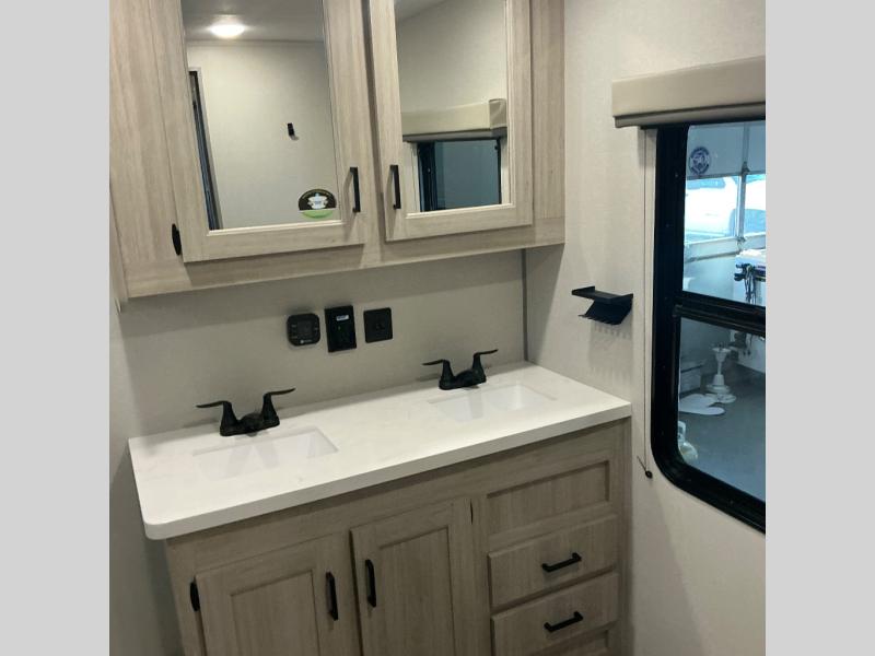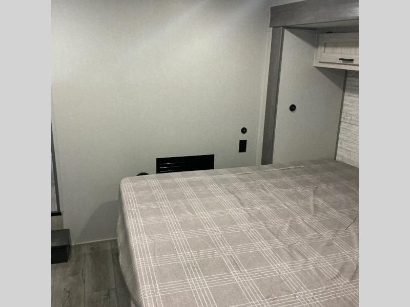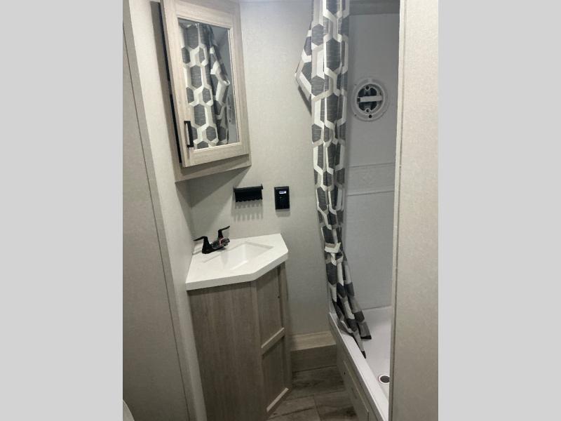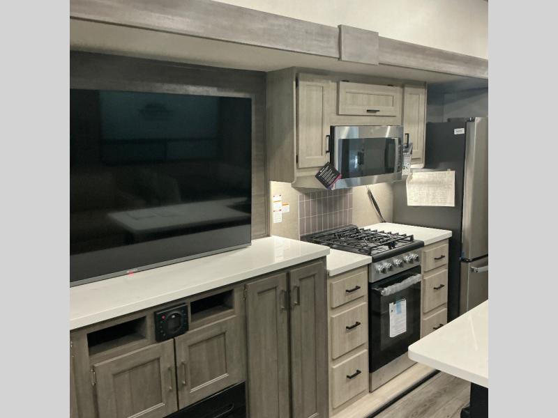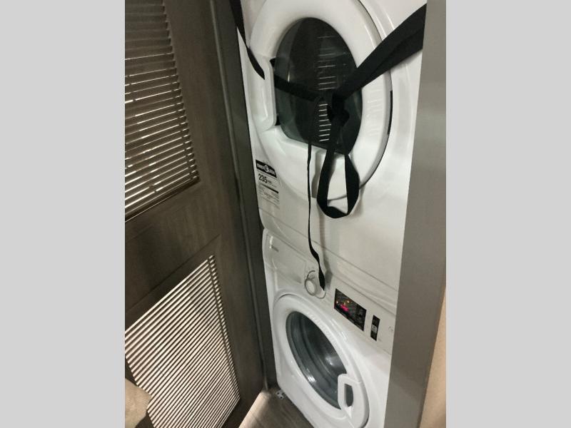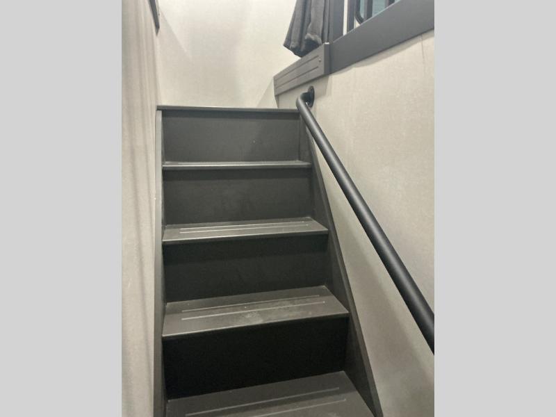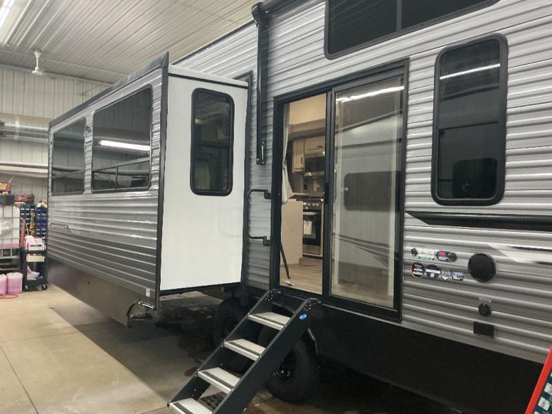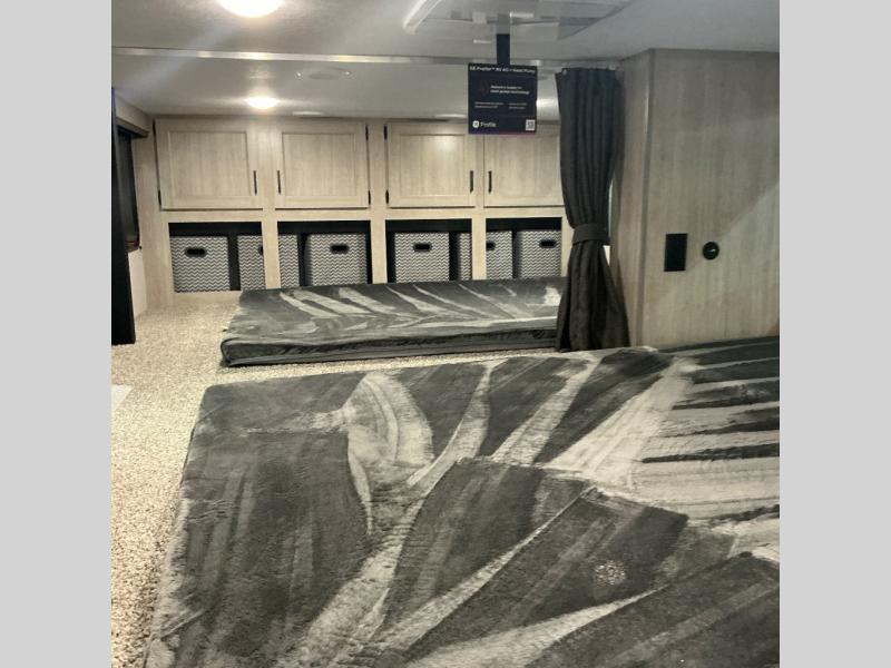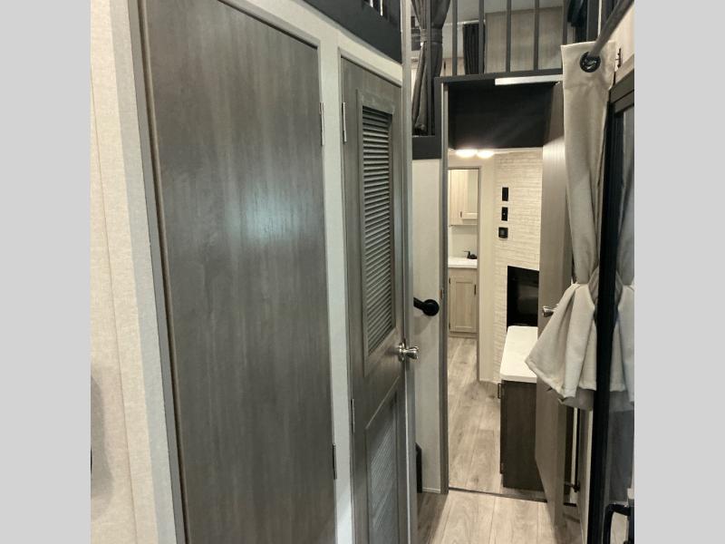 There is much to love about this destination trailer! Starting with the loft that has two queen beds, a wardrobe/storage, and a custom 58" x 71" bed. Downstairs there's a private bedroom with a king bed slide, a fireplace, and its very own private full bathroom complete with a dual sink vanity. The main living area has a huge bi-fold sleeper sectional sofa so you can fit even more guests, or just relax and watch the TV on the power lift in the entertainment center. The kitchen is well-equipped with a residential refrigerator, microwave, and pantry. The centerpiece here is a kitchen island with a deep basin farm-style sink and bar stool seating so your group can gather together and make new memories. The second full bath has a roomy 36" x 30" shower with glass door, and just outside it is the stackable washer and dryer!