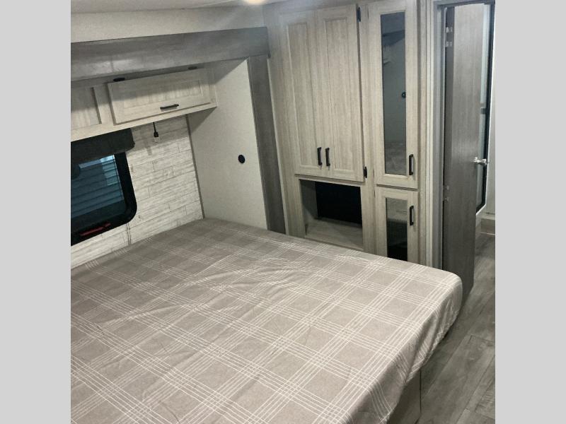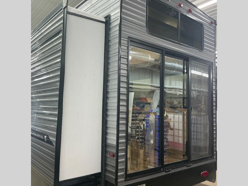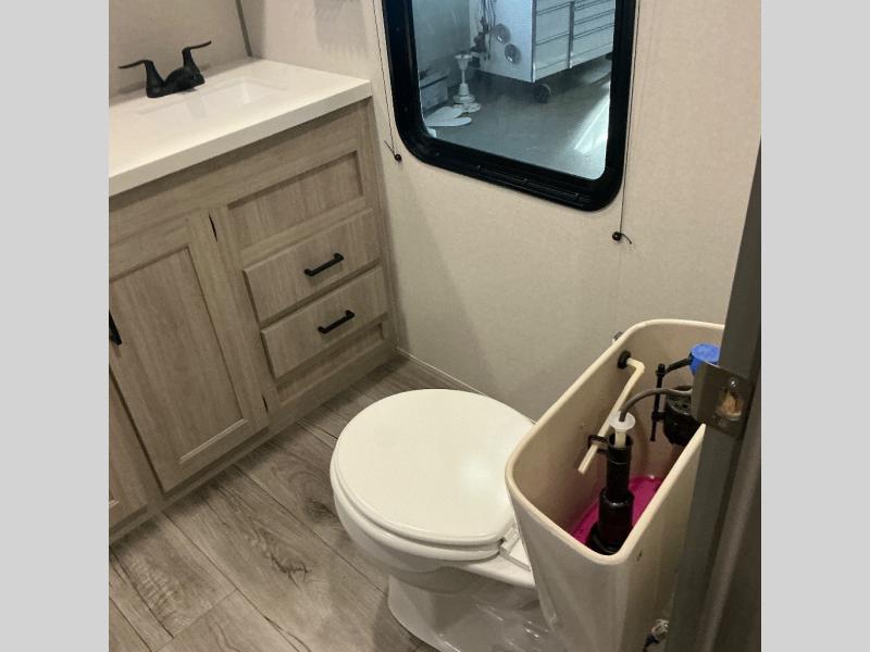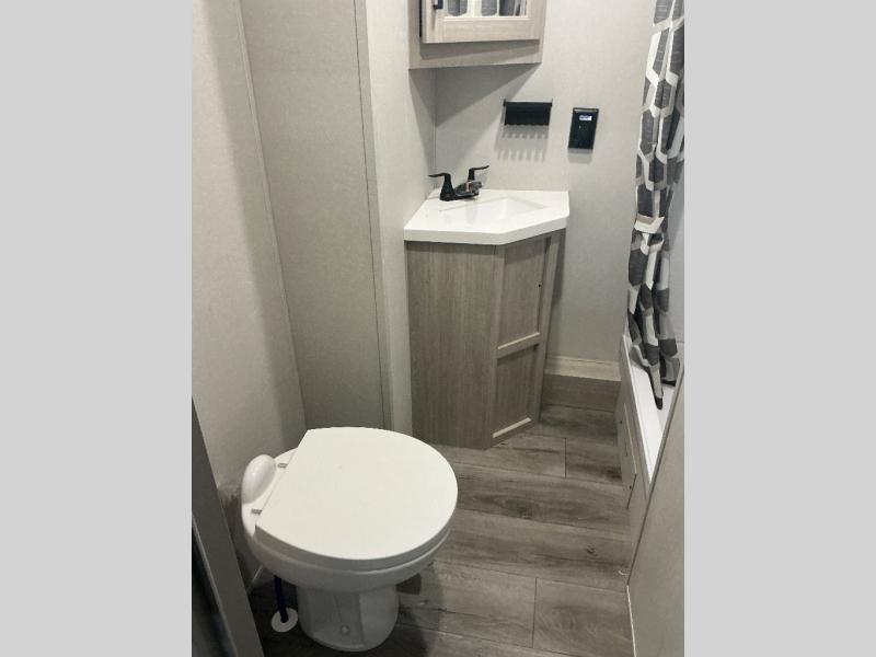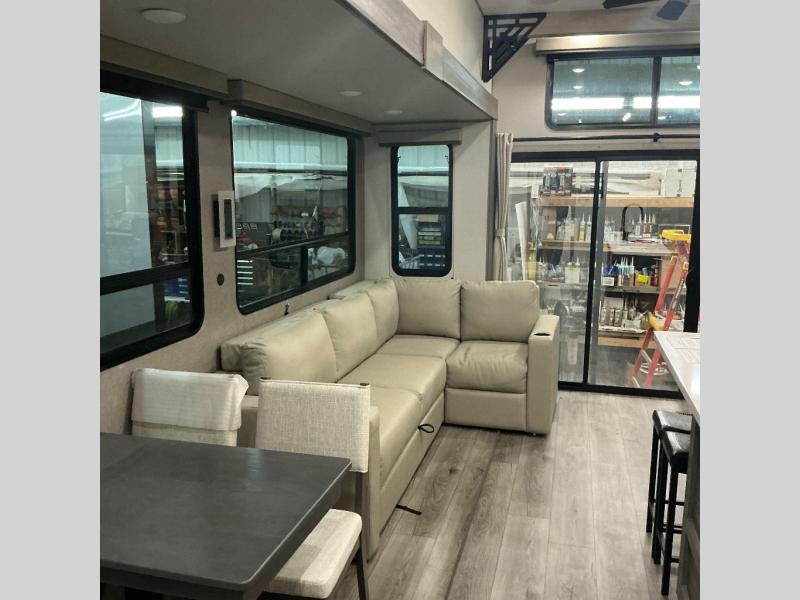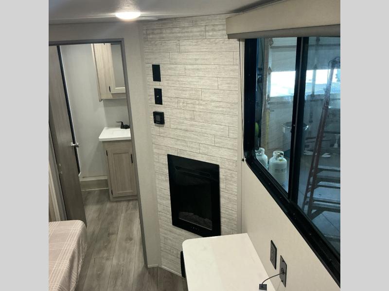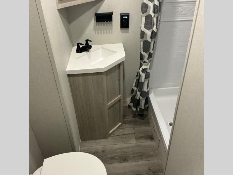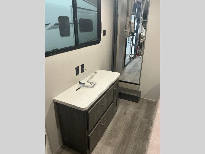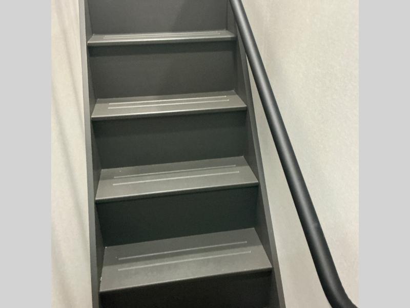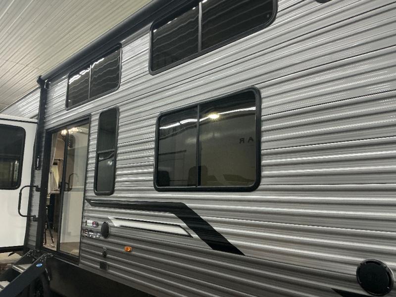 There is much to love about this destination trailer! Starting with the loft that has two queen beds, a wardrobe/storage, and a custom 58" x 71" bed. Downstairs there's a private bedroom with a king bed slide, a fireplace, and its very own private full bathroom complete with a dual sink vanity. The main living area has a huge bi-fold sleeper sectional sofa so you can fit even more guests, or just relax and watch the TV on the power lift in the entertainment center. The kitchen is well-equipped with a residential refrigerator, microwave, and pantry. The centerpiece here is a kitchen island with a deep basin farm-style sink and bar stool seating so your group can gather together and make new memories. The second full bath has a roomy 36" x 30" shower with glass door, and just outside it is the stackable washer and dryer!