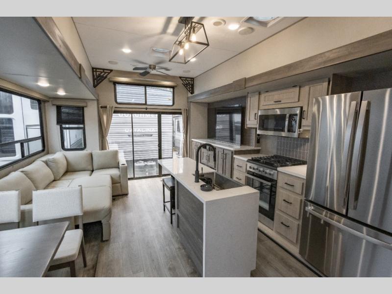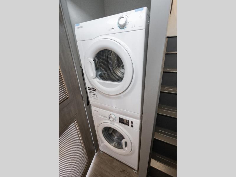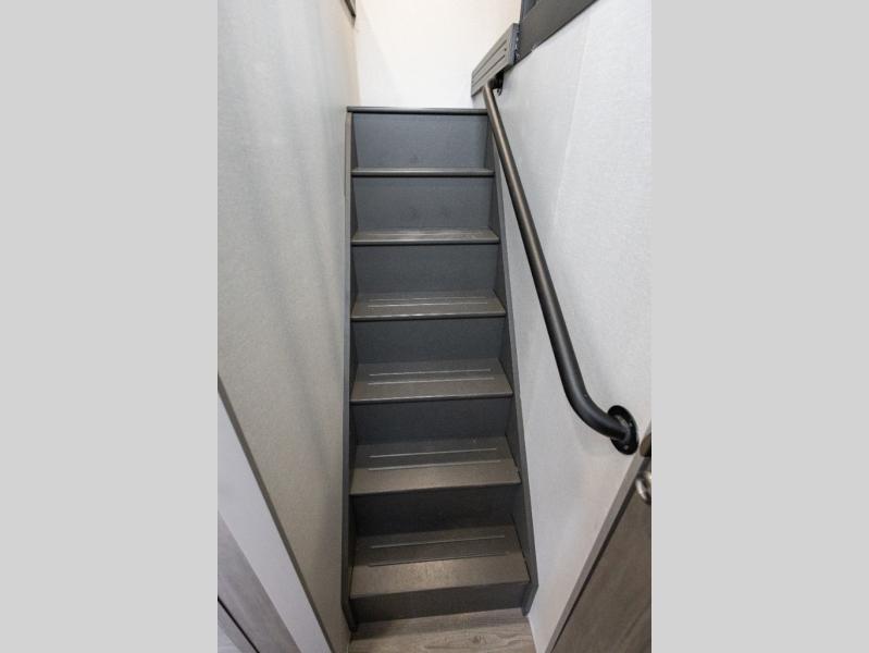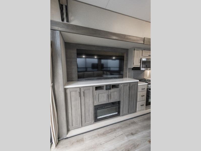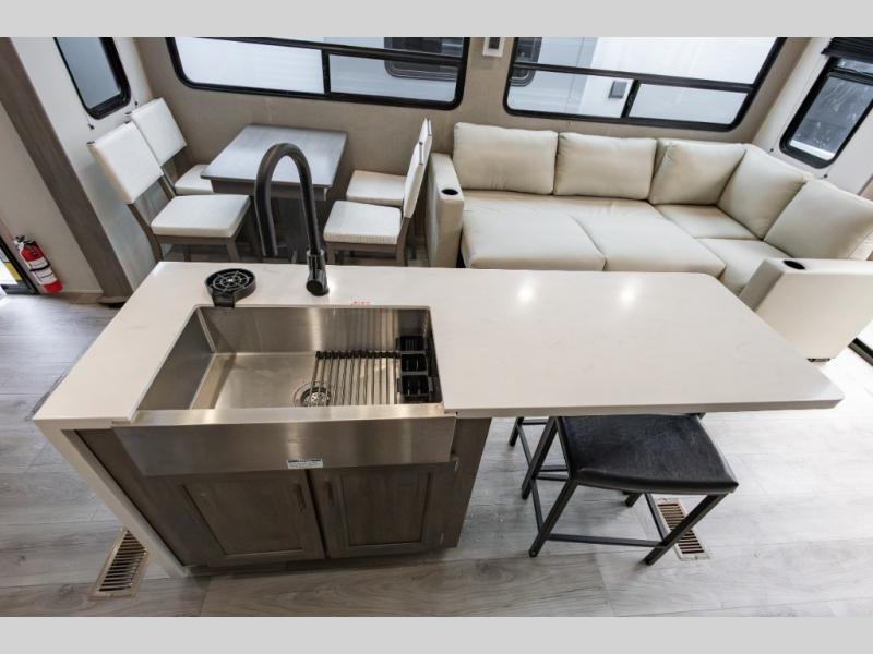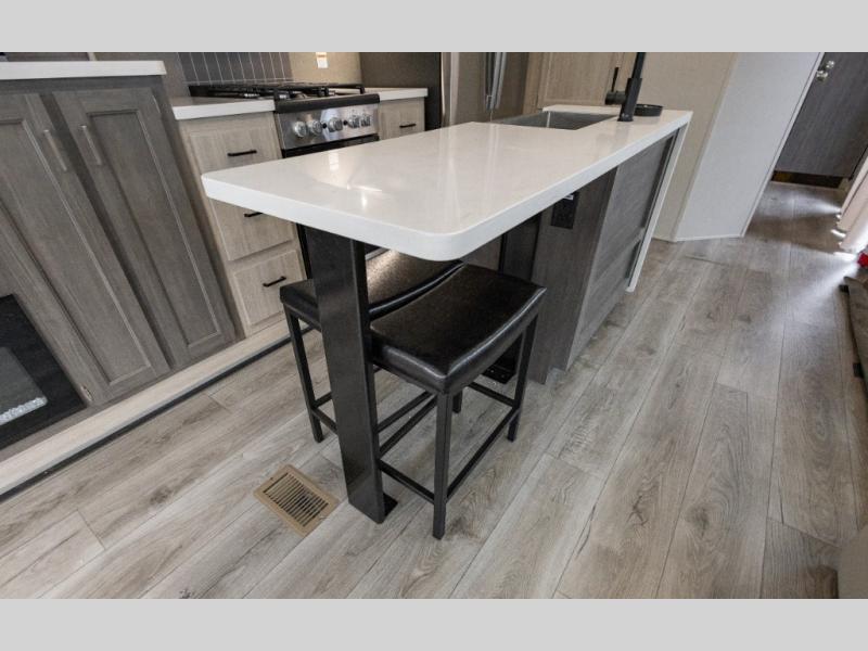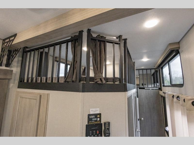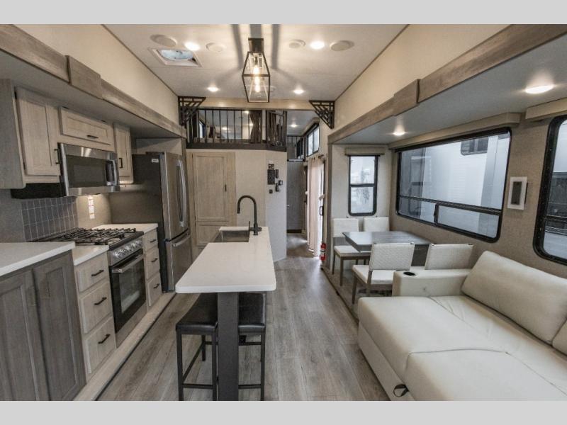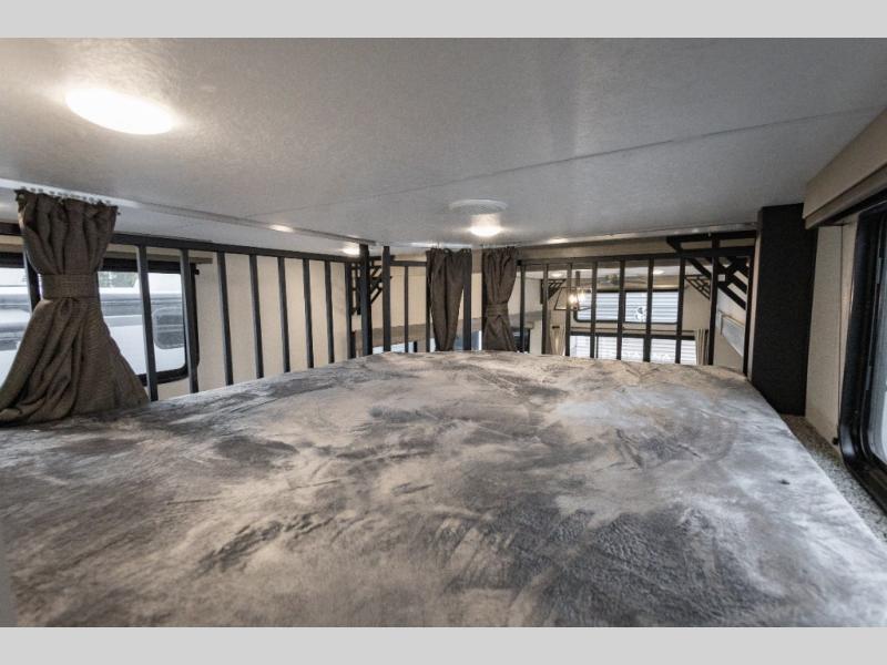 There is much to love about this destination trailer! Starting with the loft that has two queen beds, a wardrobe/storage, and a custom 58" x 71" bed. Downstairs there's a private bedroom with a king bed slide, a fireplace, and its very own private full bathroom complete with a dual sink vanity. The main living area has a huge bi-fold sleeper sectional sofa so you can fit even more guests, or just relax and watch the TV on the power lift in the entertainment center. The kitchen is well-equipped with a french door refrigerator, microwave, and pantry. The centerpiece here is a kitchen island with a deep basin farm-style sink and bar stool seating so your group can gather together and make new memories. The second full bath has a roomy 36" x 30" shower with glass door, and just around the corner find the stackable washer and dryer!