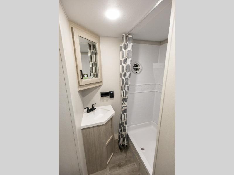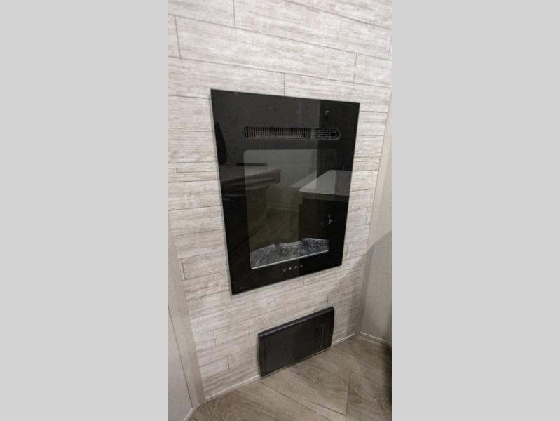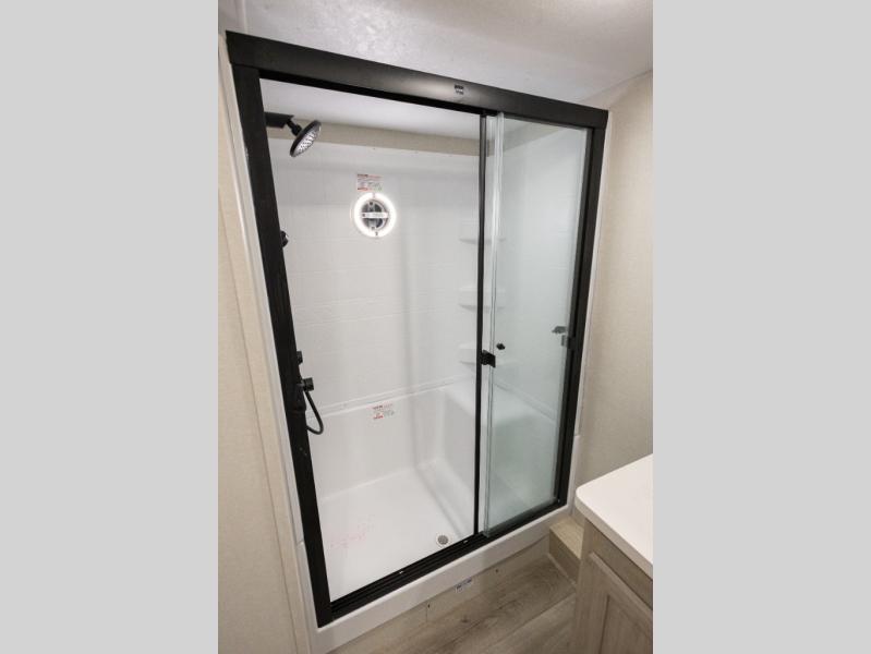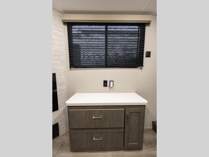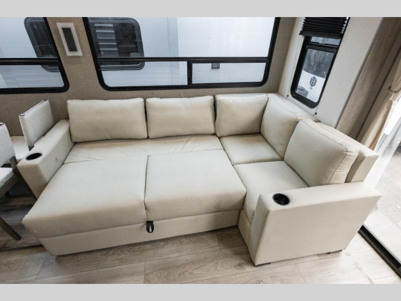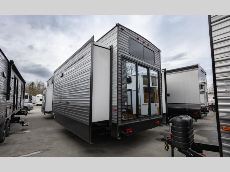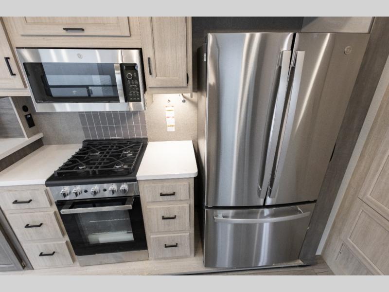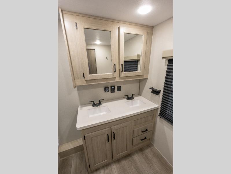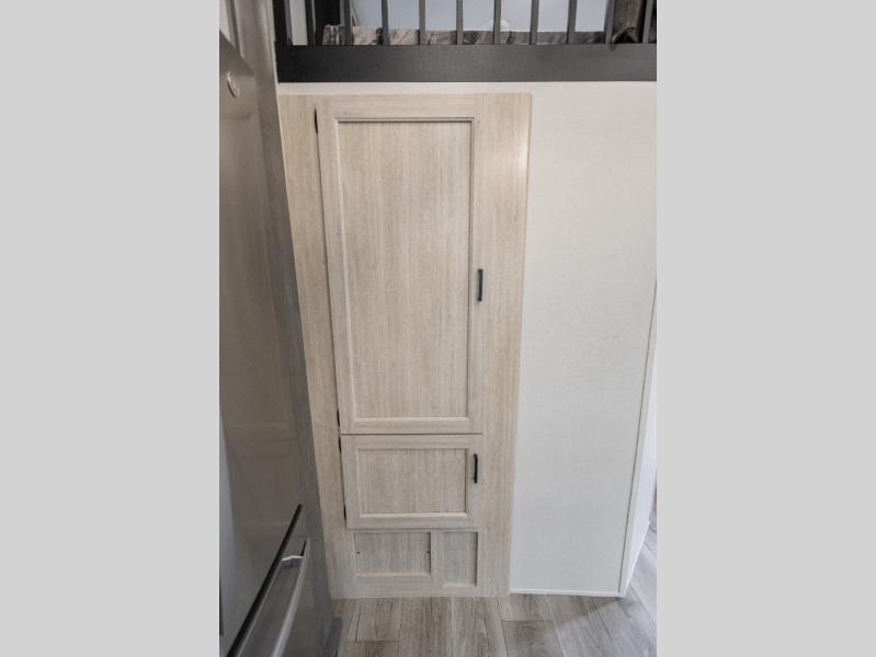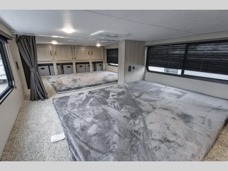 There is much to love about this destination trailer! Starting with the loft that has two queen beds, a wardrobe/storage, and a custom 58" x 71" bed. Downstairs there's a private bedroom with a king bed slide, a fireplace, and its very own private full bathroom complete with a dual sink vanity. The main living area has a huge bi-fold sleeper sectional sofa so you can fit even more guests, or just relax and watch the TV on the power lift in the entertainment center. The kitchen is well-equipped with a french door refrigerator, microwave, and pantry. The centerpiece here is a kitchen island with a deep basin farm-style sink and bar stool seating so your group can gather together and make new memories. The second full bath has a roomy 36" x 30" shower with glass door, and just around the corner find the stackable washer and dryer!