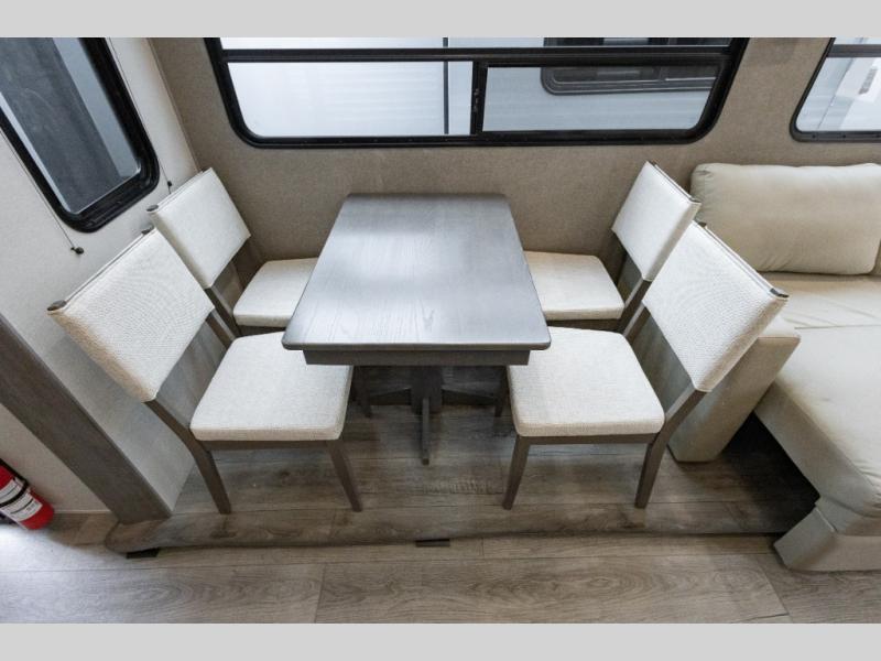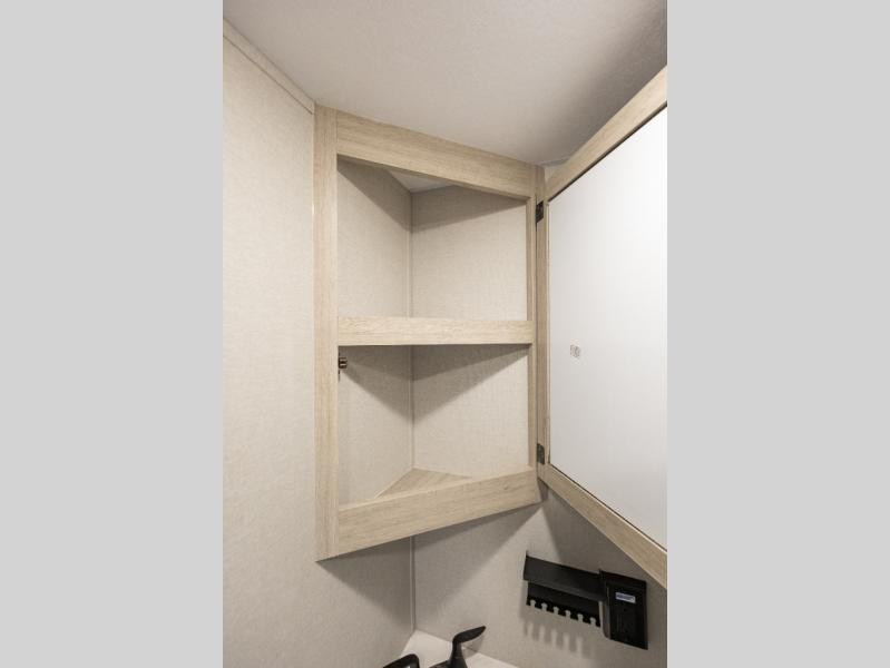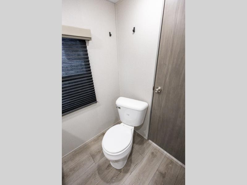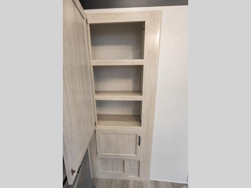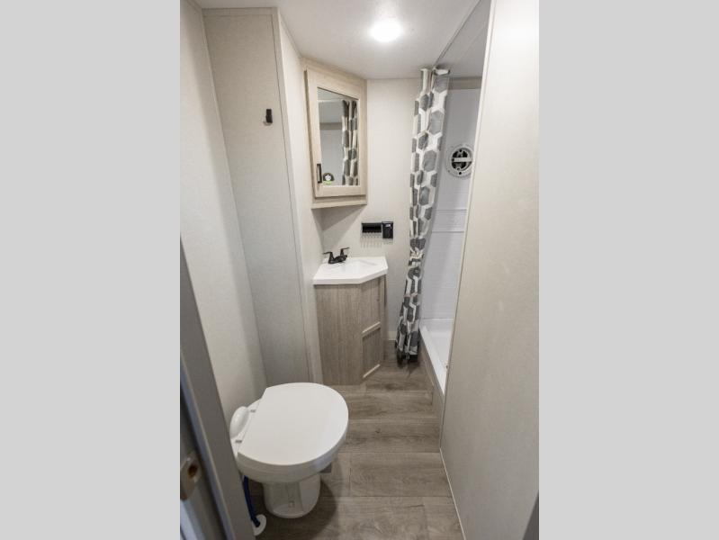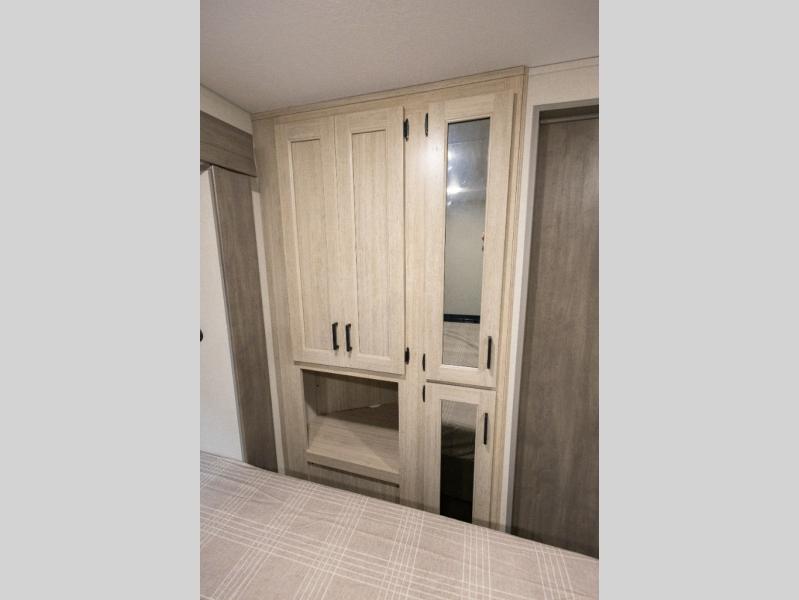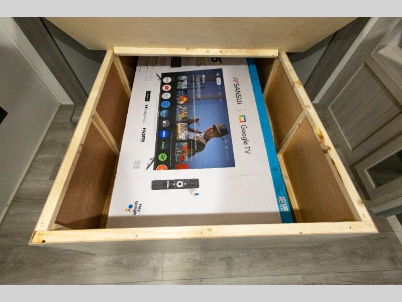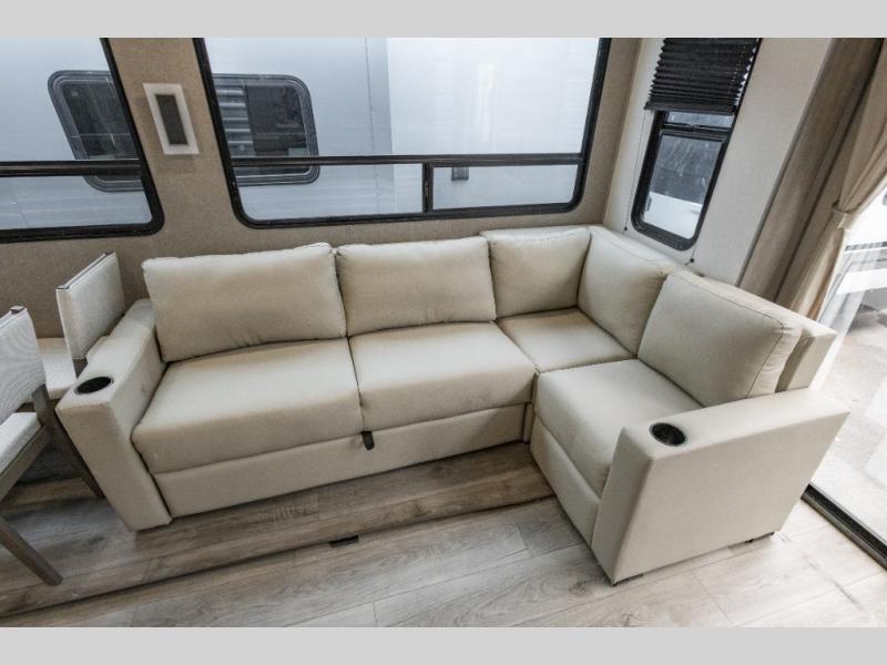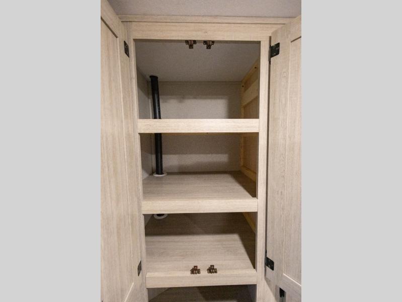 There is much to love about this destination trailer! Starting with the loft that has two queen beds, a wardrobe/storage, and a custom 58" x 71" bed. Downstairs there's a private bedroom with a king bed slide, a fireplace, and its very own private full bathroom complete with a dual sink vanity. The main living area has a huge bi-fold sleeper sectional sofa so you can fit even more guests, or just relax and watch the TV on the power lift in the entertainment center. The kitchen is well-equipped with a french door refrigerator, microwave, and pantry. The centerpiece here is a kitchen island with a deep basin farm-style sink and bar stool seating so your group can gather together and make new memories. The second full bath has a roomy 36" x 30" shower with glass door, and just around the corner find the stackable washer and dryer!