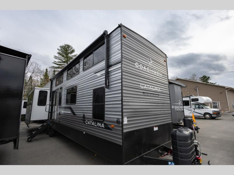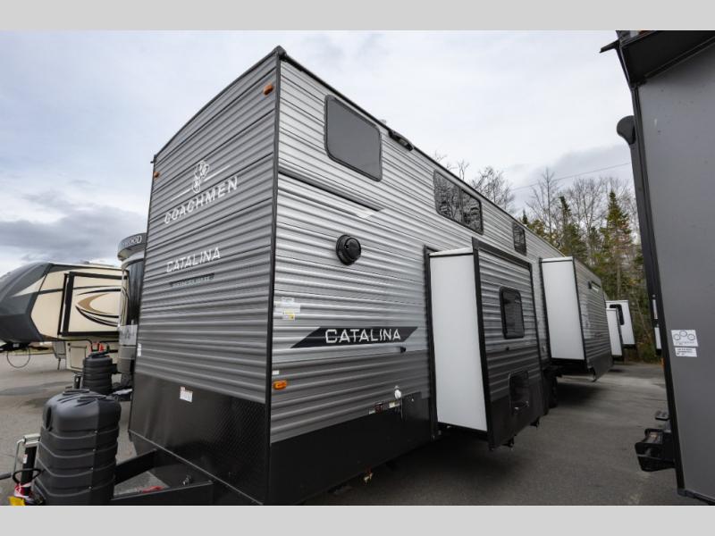 With any Catalina Destination trailer by Coachmen, you will enjoy comfortable extended stays wherever you decide to set up camp! The full length frame outriggers add strength to each unit, along with a seamless Alpha Roof membrane and Norco electromagnetic, powder coated chassis. You will love the open views provided by the residential-style sliding glass patio door, plus there are GE appliances, woodplank linoleum flooring, and hard valance window treatments to make your space feel more like home. Head outside to find a convenient "Leash Link" quick hookup D-ring for your furry friends, premium JBL exterior speakers, flush mount baggage doors for your gear, and the list of amenities goes on!