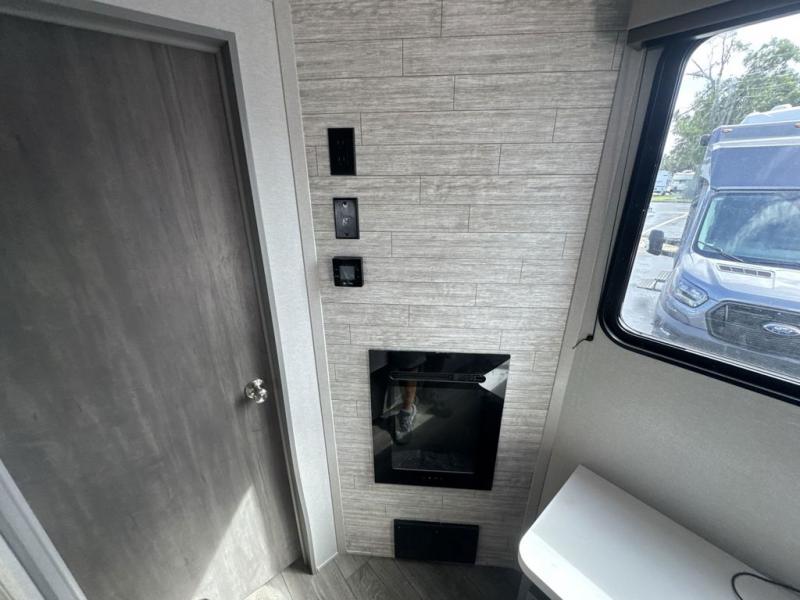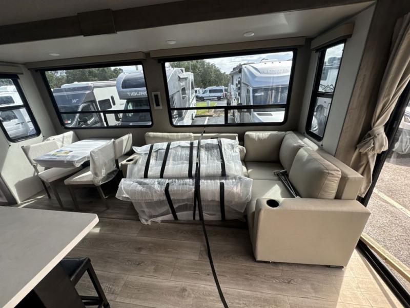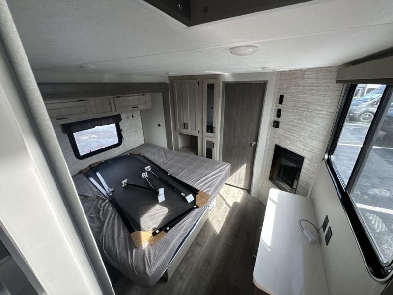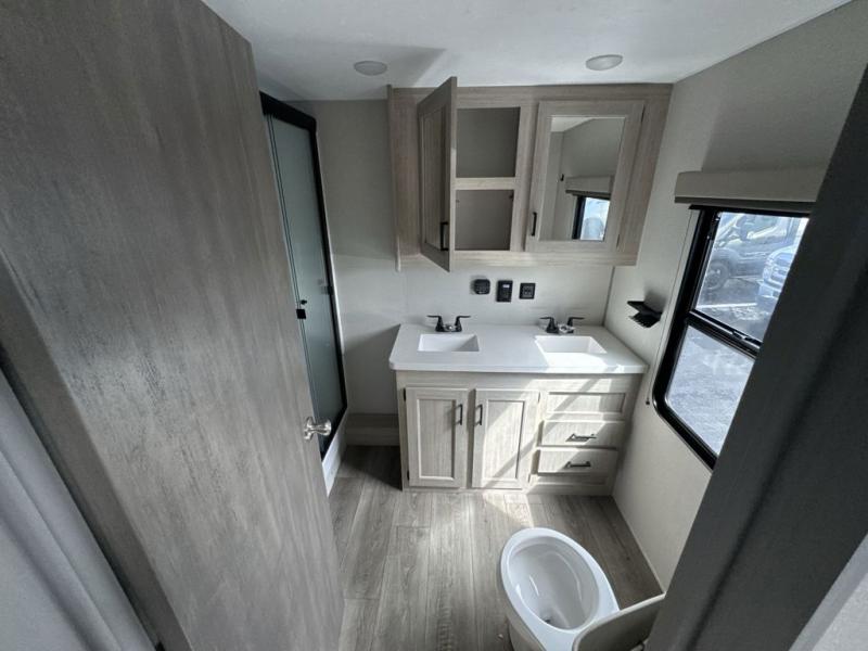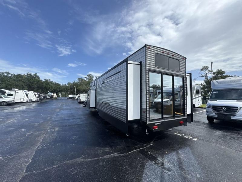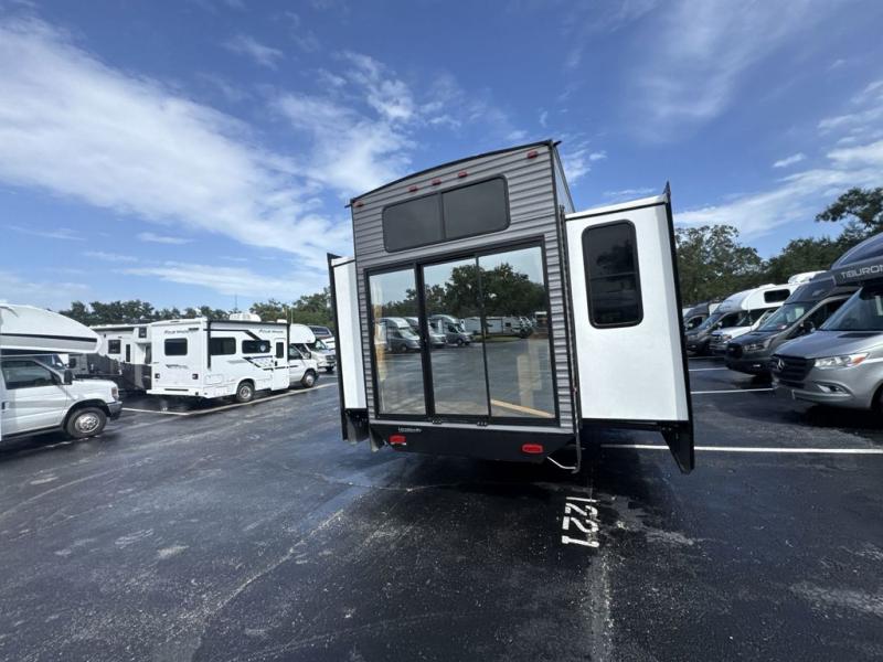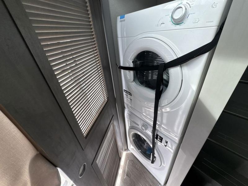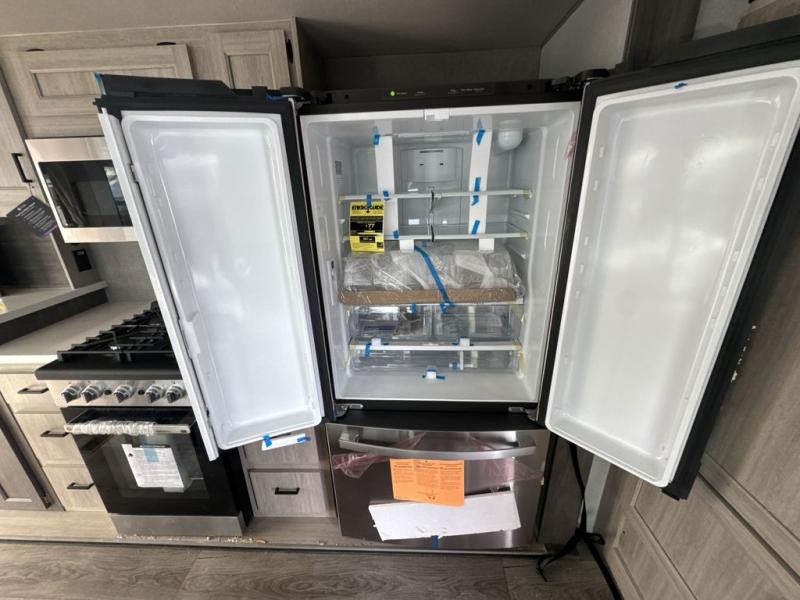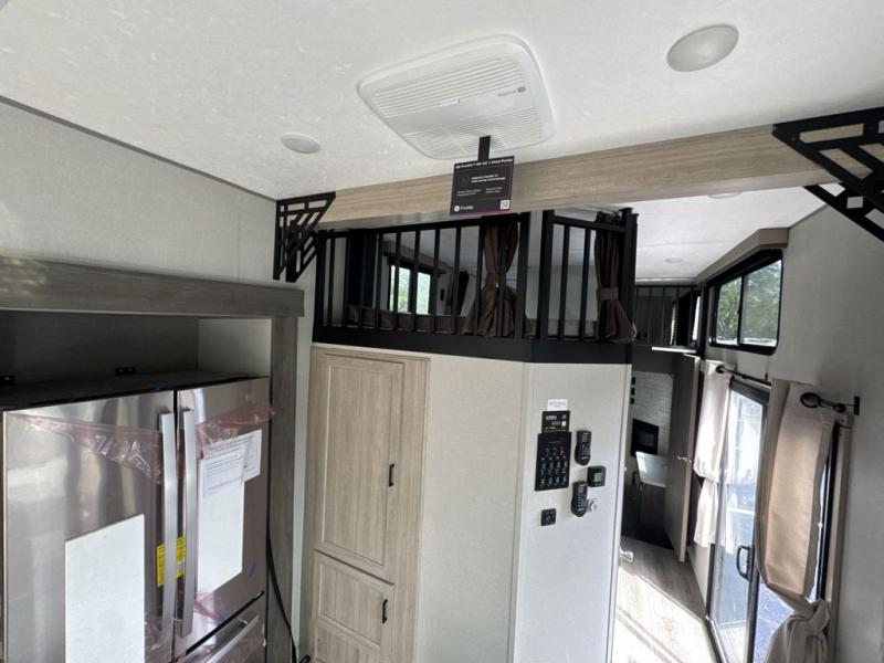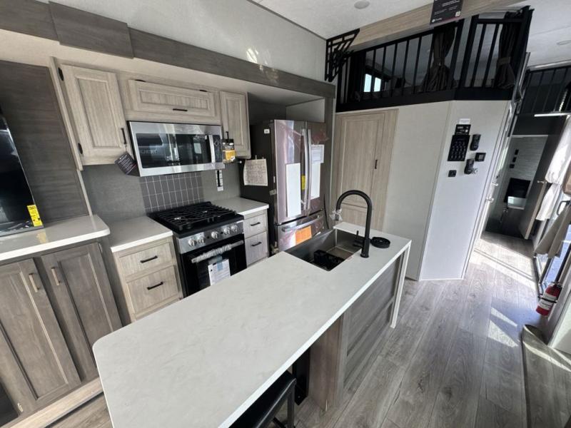 There is much to love about this destination trailer! Starting with the loft that has two queen beds, a wardrobe/storage, and a custom 58" x 71" bed. Downstairs there's a private bedroom with a king bed slide, a fireplace, and its very own private full bathroom complete with a dual sink vanity. The main living area has a huge bi-fold sleeper sectional sofa so you can fit even more guests, or just relax and watch the TV on the power lift in the entertainment center. The kitchen is well-equipped with a french door refrigerator, microwave, and pantry. The centerpiece here is a kitchen island with a deep basin farm-style sink and bar stool seating so your group can gather together and make new memories. The second full bath has a roomy 36" x 30" shower with glass door, and just around the corner find the stackable washer and dryer!