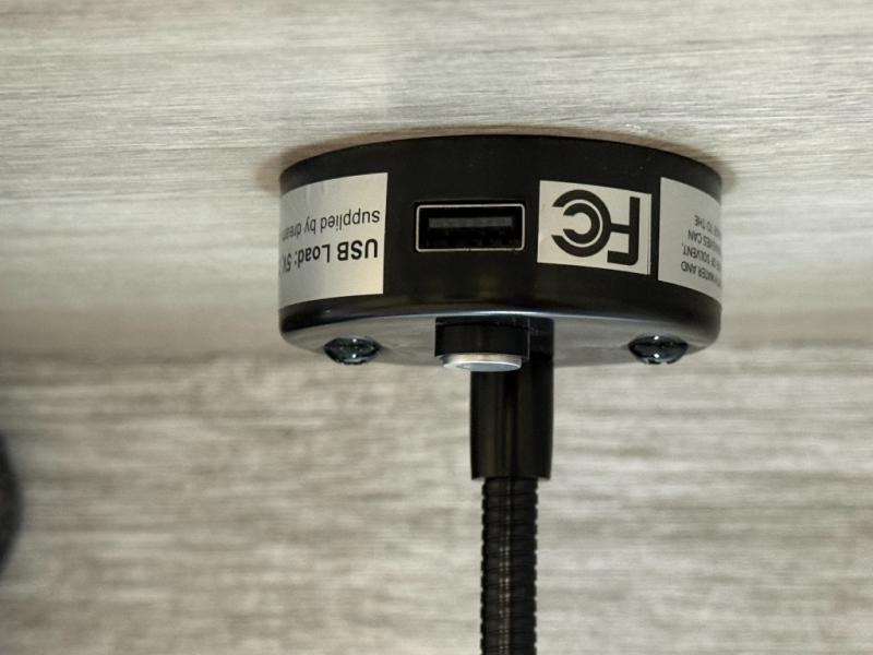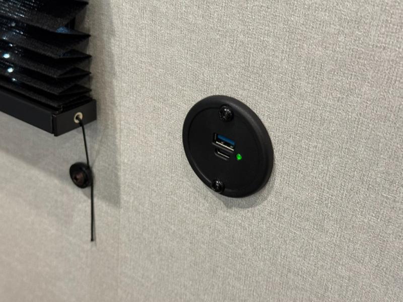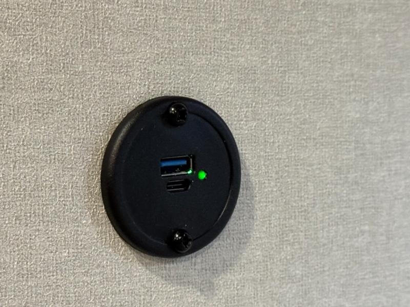 USB charging ports in bedroom night stands, kitchen outlets + USB, near bunk areas.