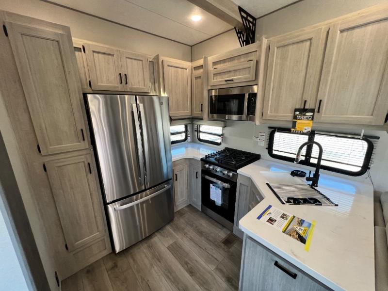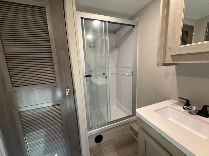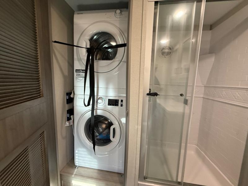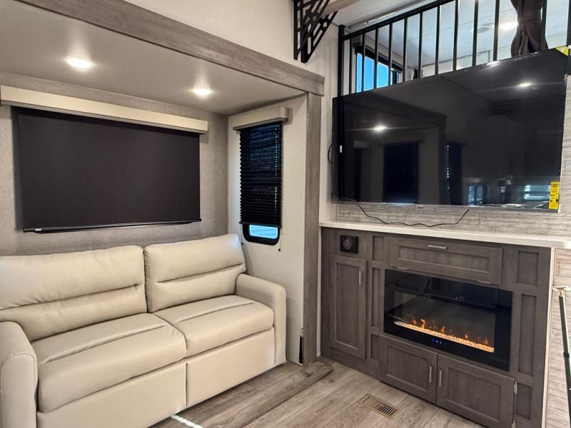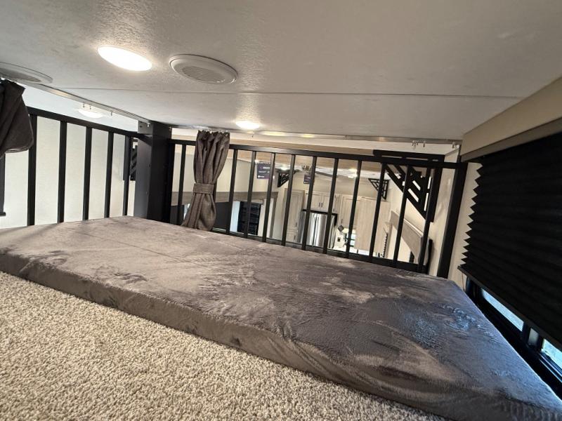 If you want to get out of the house without missing the comfort, you will love this destination trailer! Feel at home the moment you step in through the patio door and head to the open living area with opposing slide-outs making room for tons of seating areas to enjoy quality time by the fireplace with your guests. You will fall in love with the residential style kitchen featuring a 4 burner range, French door refrigerator, pantry, and much more to make your favorite recipes on the go. There is no such thing as too many guests when you have a loft that has two queen beds and a 28 x 64 bunk matt to rest. In the main floor you will have a master bedroom all to yourself that has its own private bath offering comfort and convenience at only a few steps away from your king bed.
